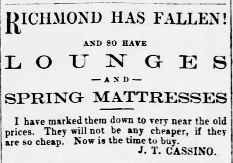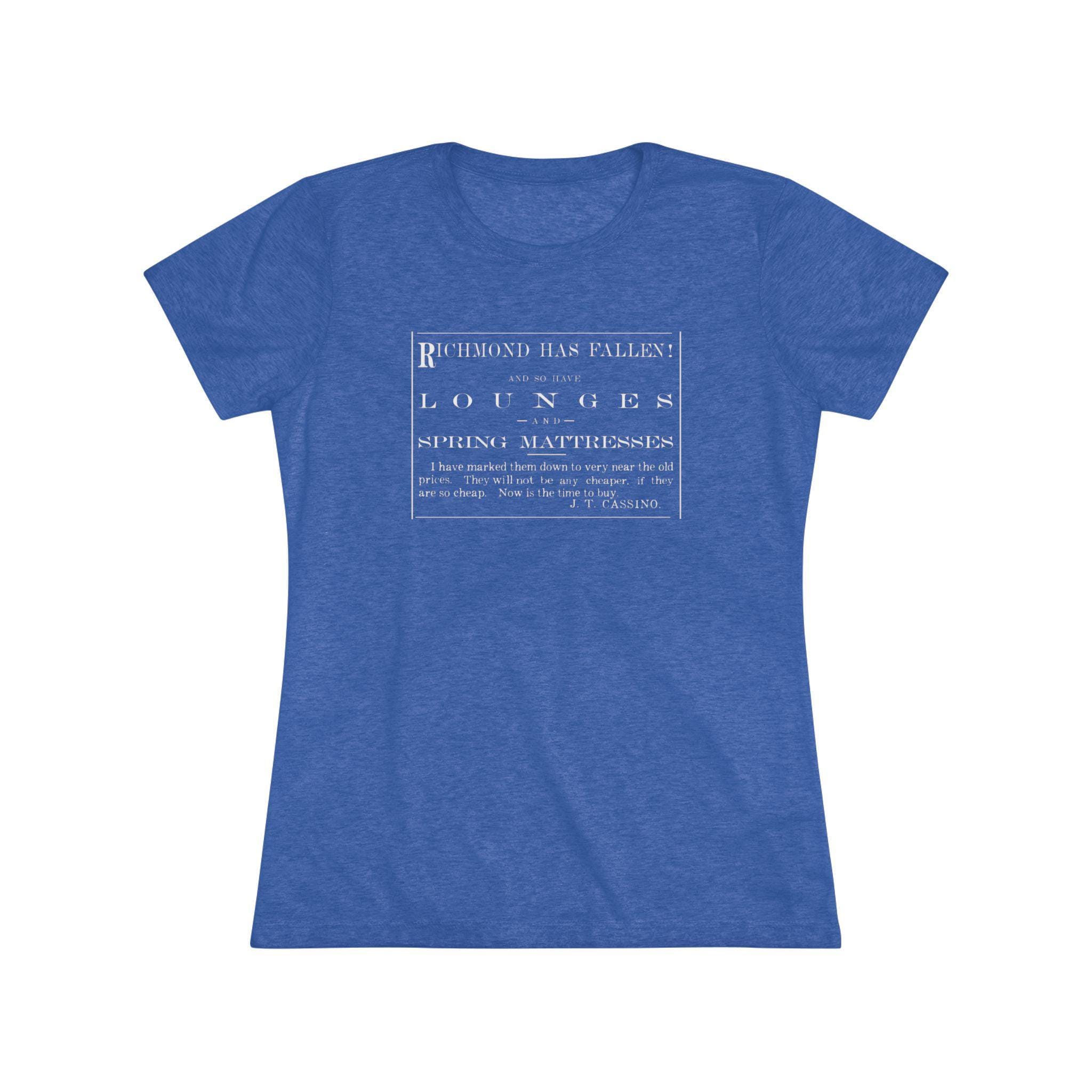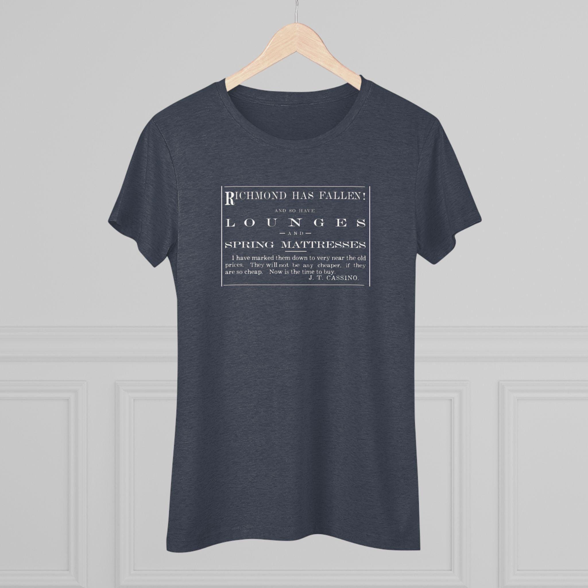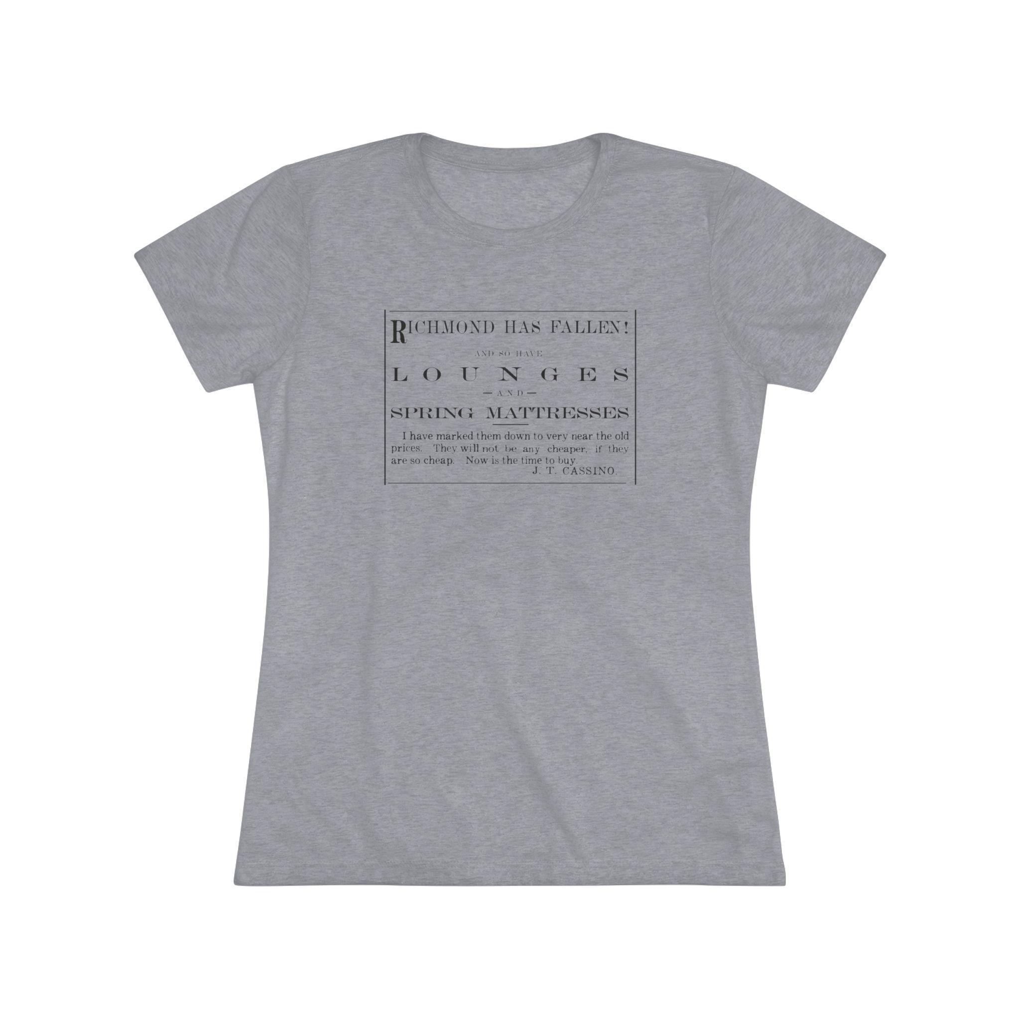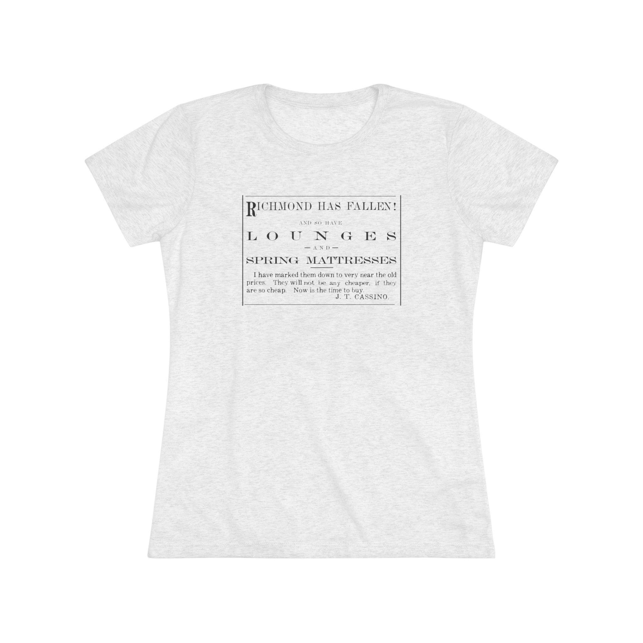 This women's t-shirt celebrates a hilarious and authentic piece of history from the end of the Civil War. The design, restored from an 1865 Vermont newspaper, is an advertisement that uses the fall of Richmond to announce a sale on lounges and spring mattresses! The bold, 19th-century typography makes a quirky and stylish statement. This soft, contoured tee is a perfect way to wear a piece of funny, uniquely American history that is guaranteed to be a conversation starter.