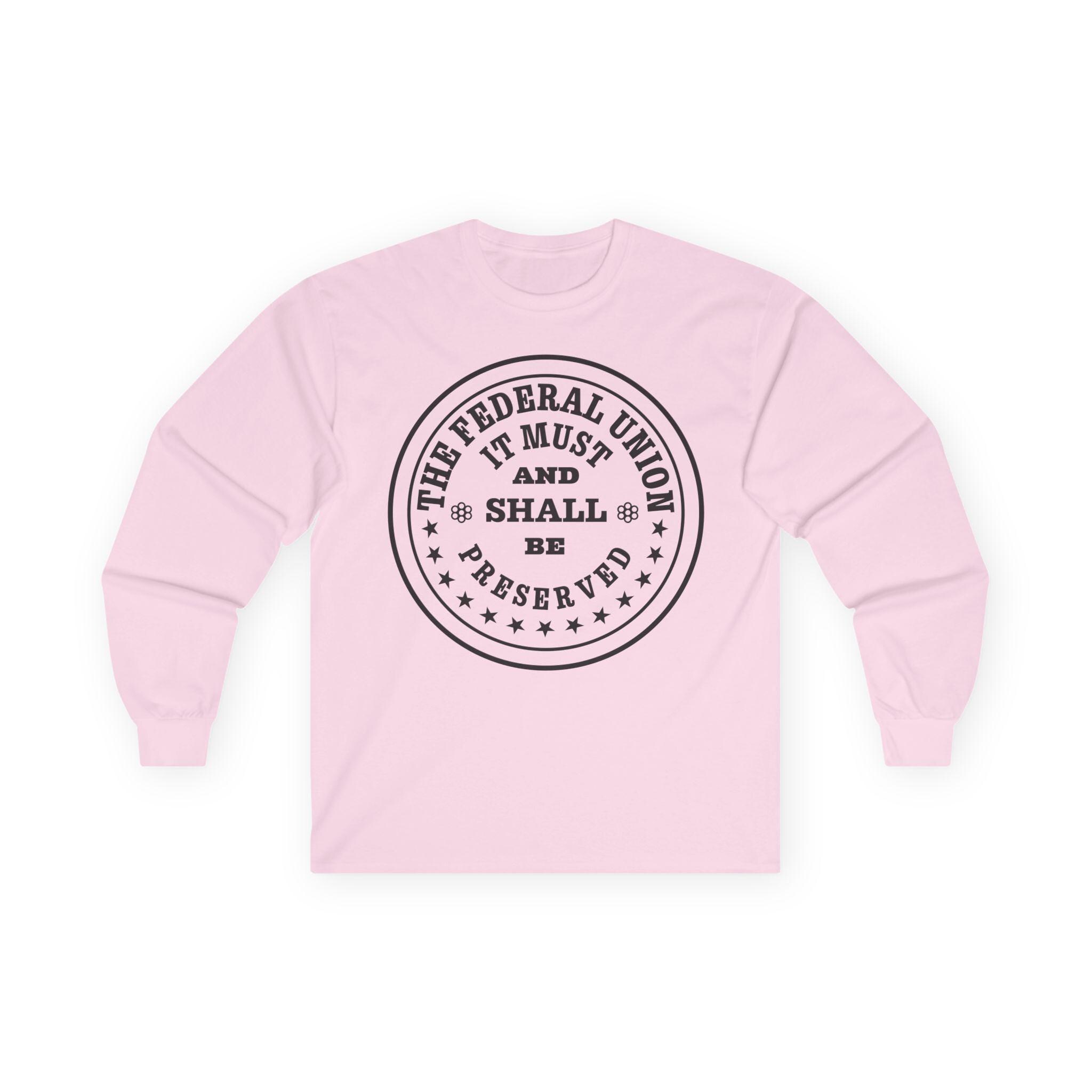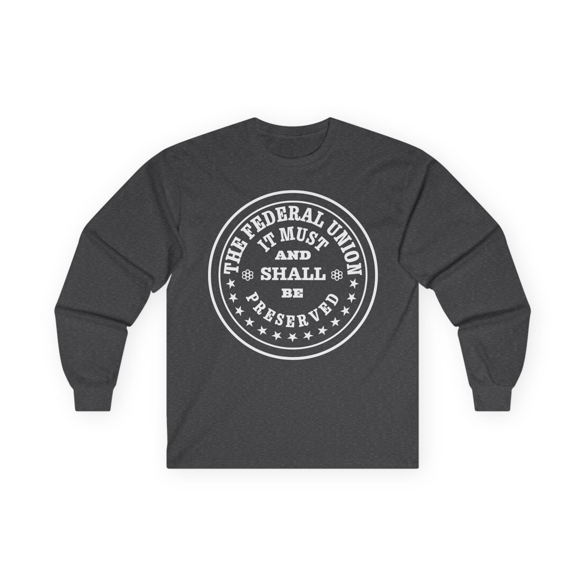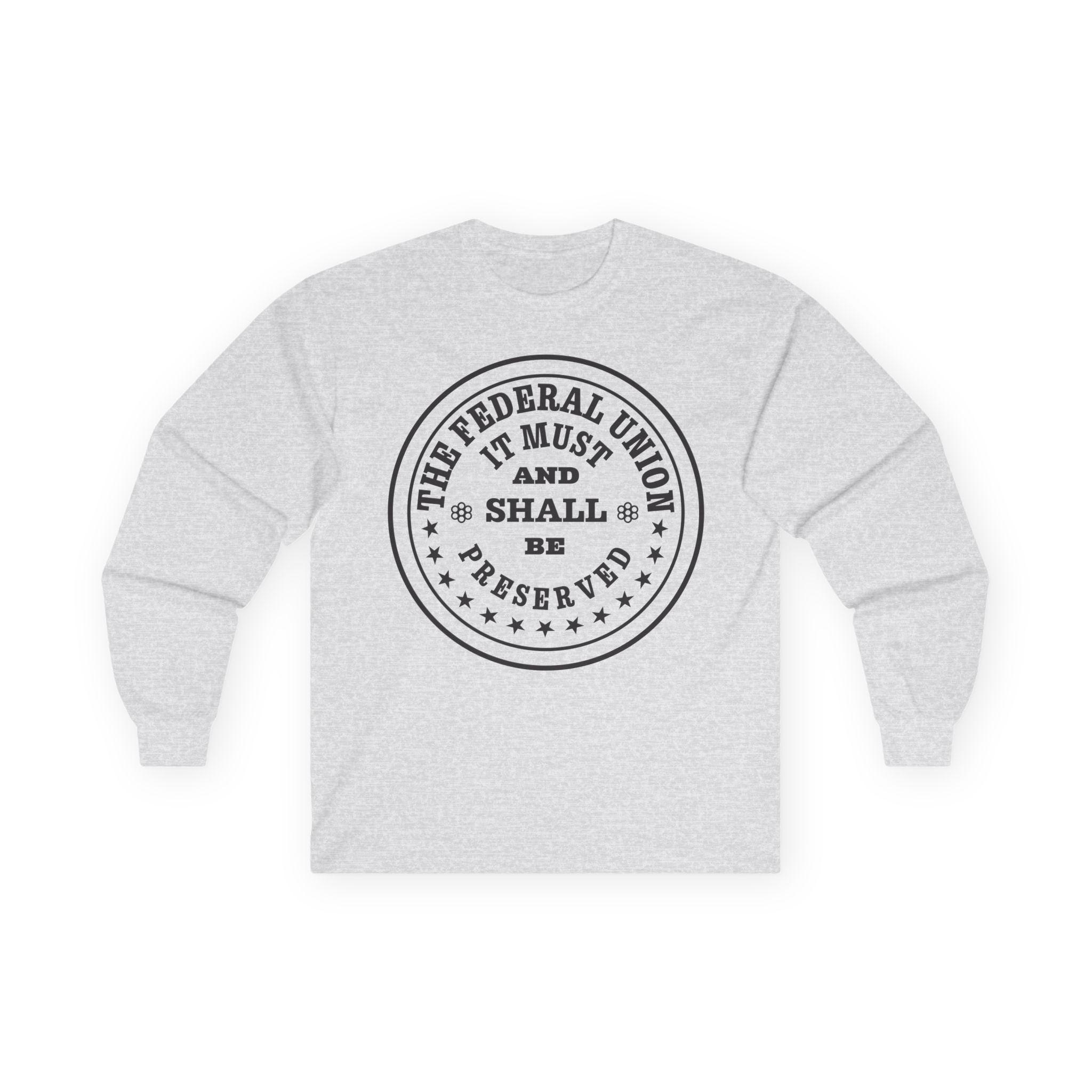 This comfortable longsleeve tee is the perfect layer for fall and a fantastic piece of historical memorabilia. The design is a restored patriotic token from the 1860s, a form of private currency created during the Civil War coin shortage. The circular text makes a bold and unshakeable statement of purpose from a time of national crisis: "The Federal Union, It Must and Shall Be Preserved." It's a unique and authentic piece of Americana for any history buff or coin enthusiast.