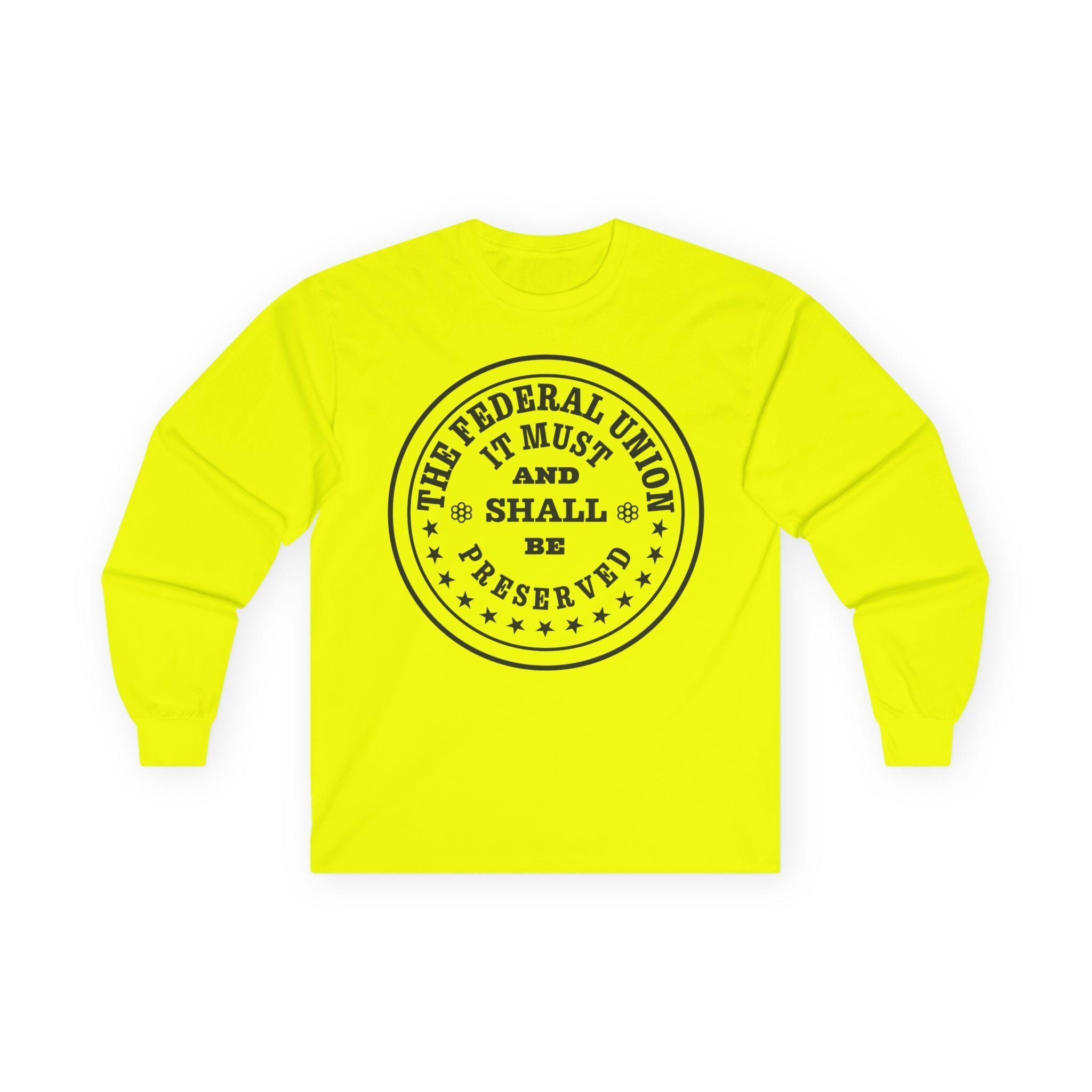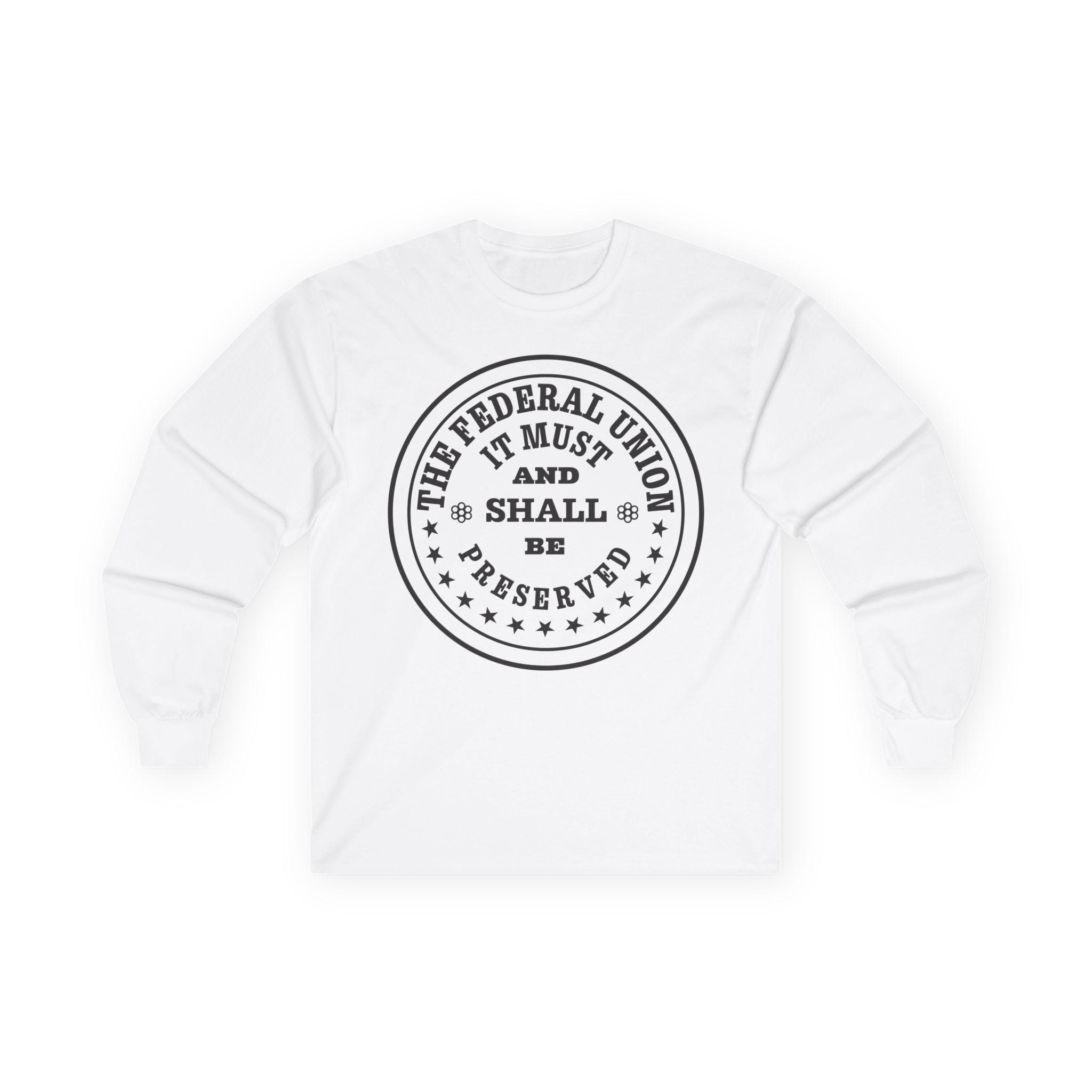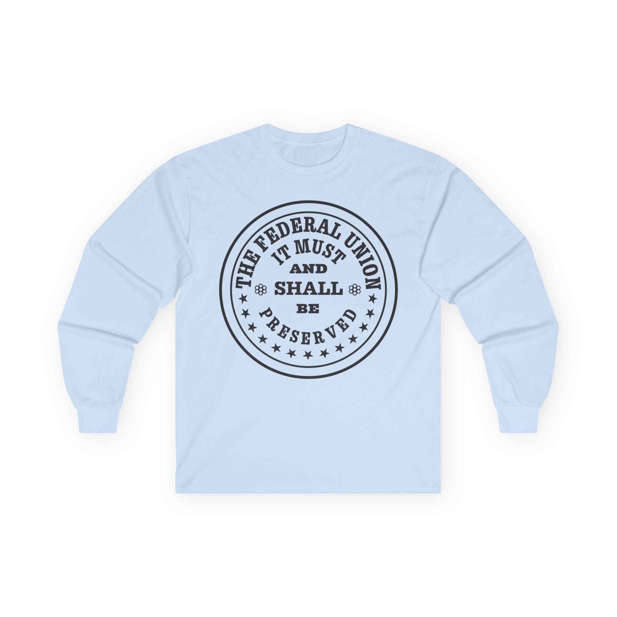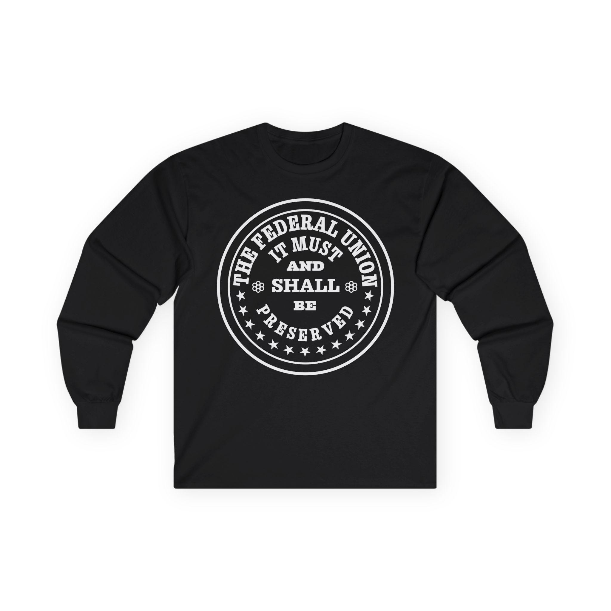 This comfortable longsleeve tee is the perfect layer for fall and a fantastic piece of historical memorabilia. The design is a restored patriotic token from the 1860s, a form of private currency created during the Civil War coin shortage. The circular text makes a bold and unshakeable statement of purpose from a time of national crisis: "The Federal Union, It Must and Shall Be Preserved." It's a unique and authentic piece of Americana for any history buff or coin enthusiast.
