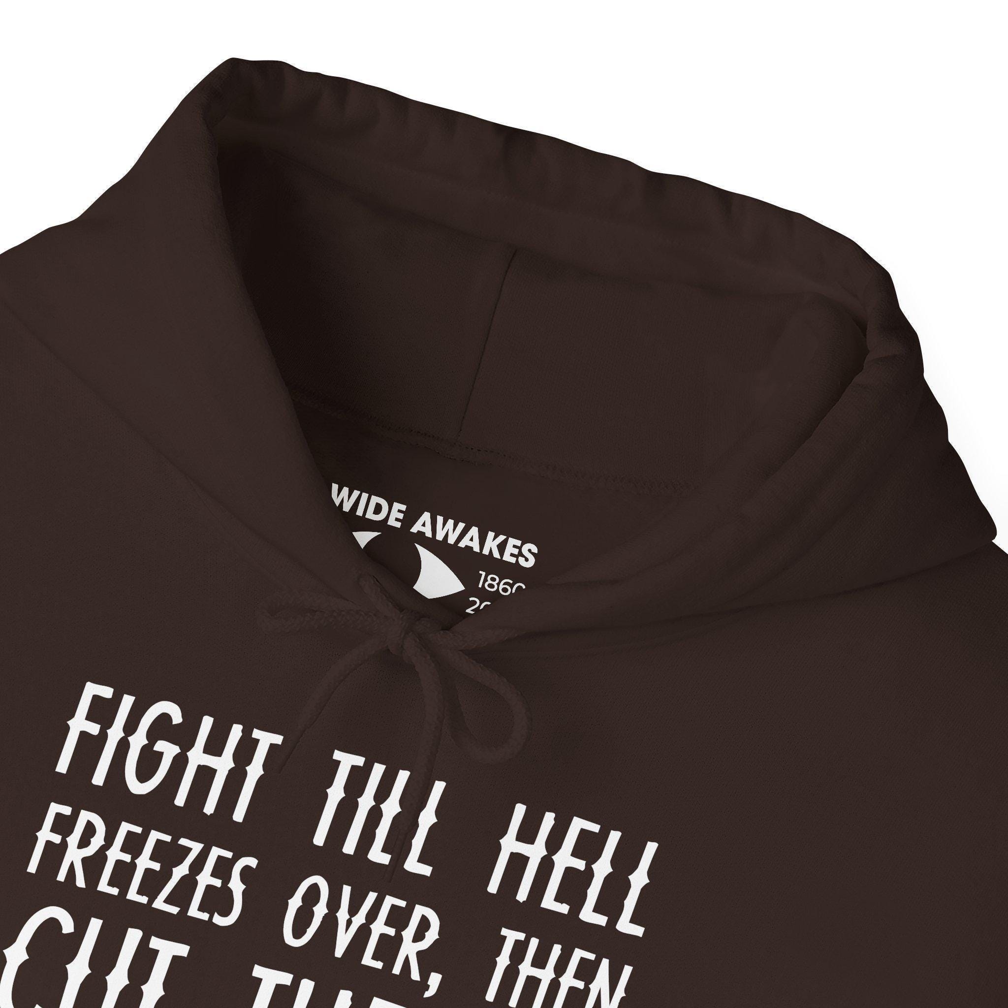 This warm and durable hoodie captures one of the most powerful vows of the Civil War, a statement of such profound determination that it transcends time. The words come from an Iowan Union soldier, who pledged to never stop fighting slavery with this unforgettable promise of persistence. This hoodie carries that unbreakable spirit into the modern day as a clever double entendre. It's both a general cry of resistance and a specific, pointed message to ICE. With a soft fleece interior and spacious front pocket, this is the perfect gear for those who refuse to quit, no matter the odds.
