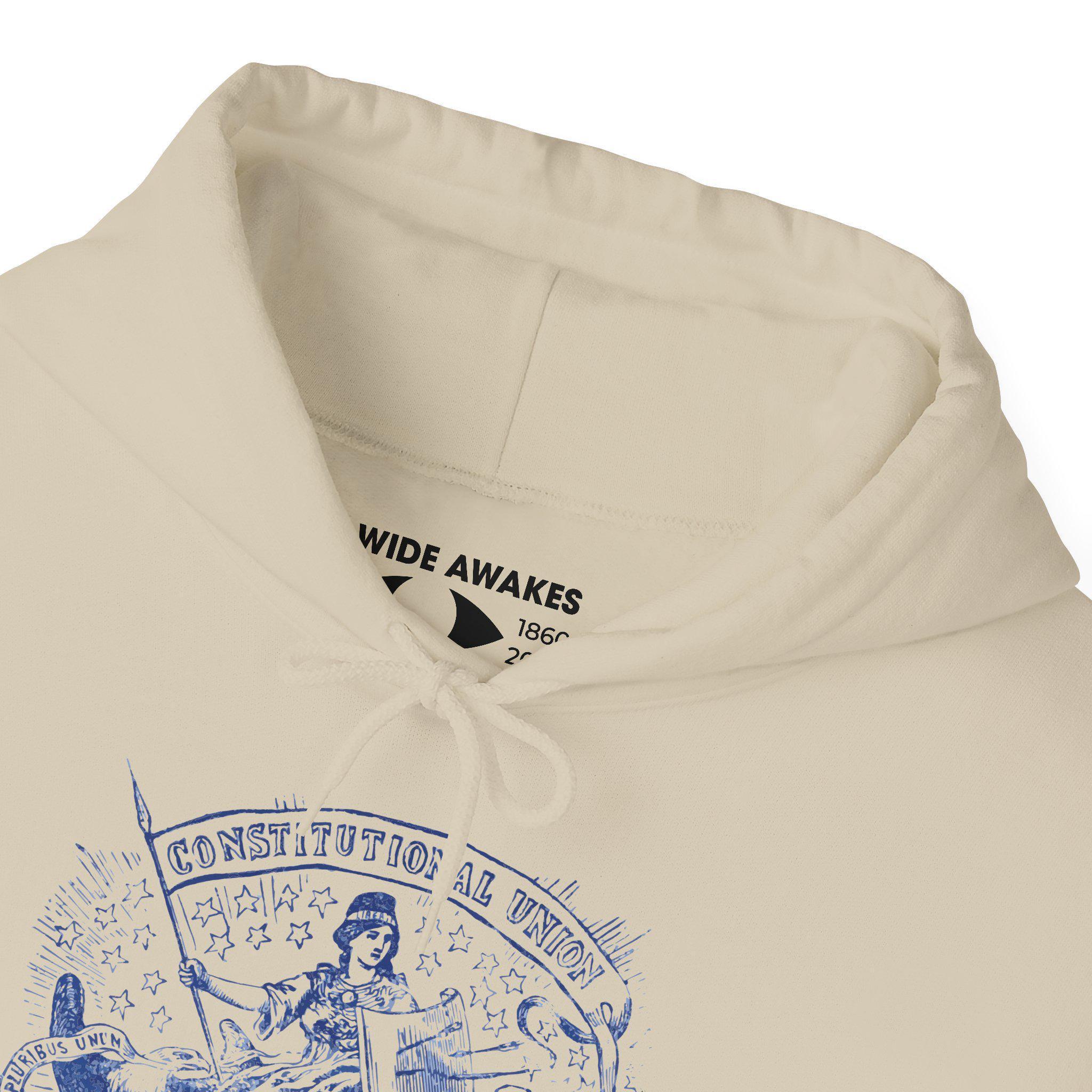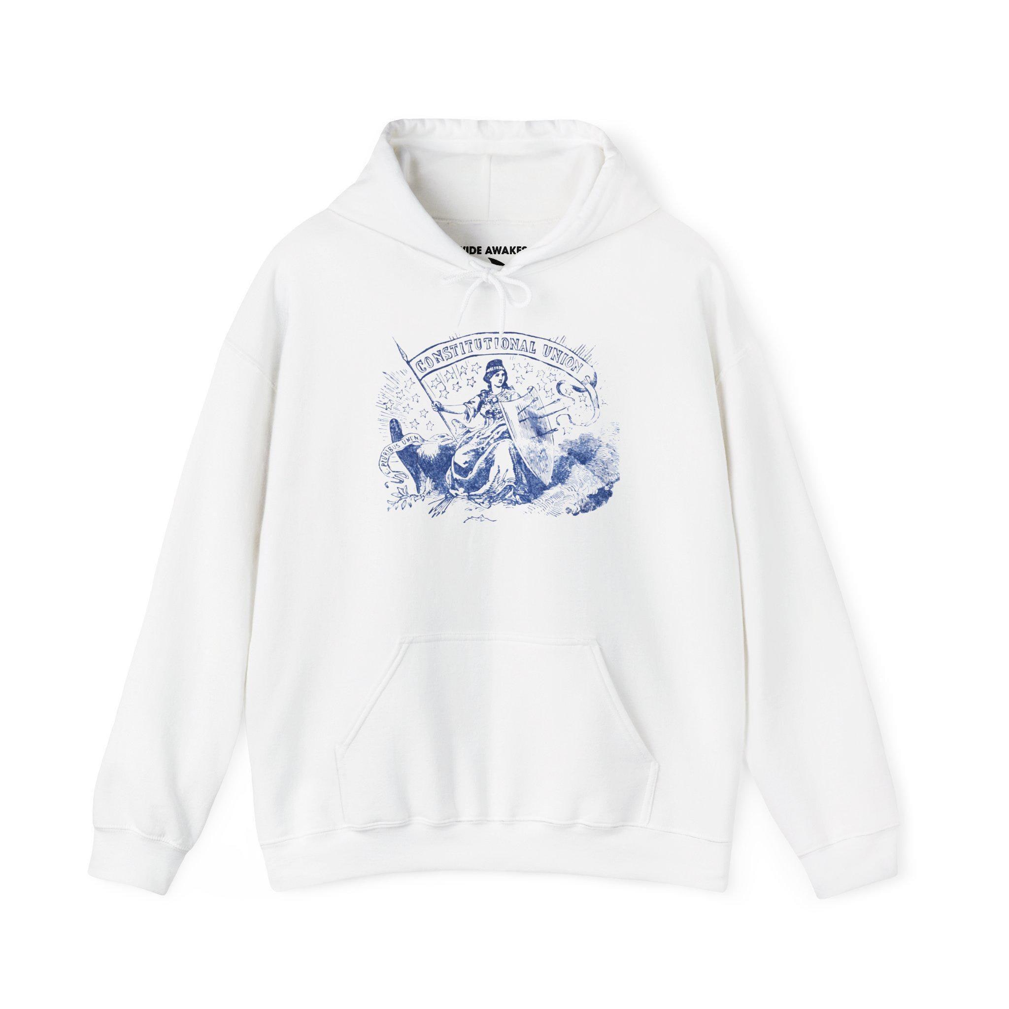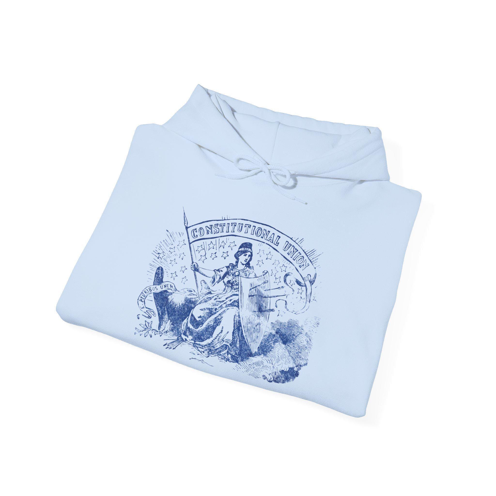 This comfortable and warm hoodie features a powerful piece of historical allegory, restored from an authentic 1860s envelope stamp. The figure of Freedom sits as a calm protector, even as her shield shows the scars of recent battle—representing a nation wounded, but not broken. She protects the eagle and its promise of "E PLURIBUS UNUM." Her standard proclaims the principle she defends: the "CONSTITUTIONAL UNION." With a soft fleece interior and a spacious front pocket, this hoodie is a wearable tribute to American resilience.