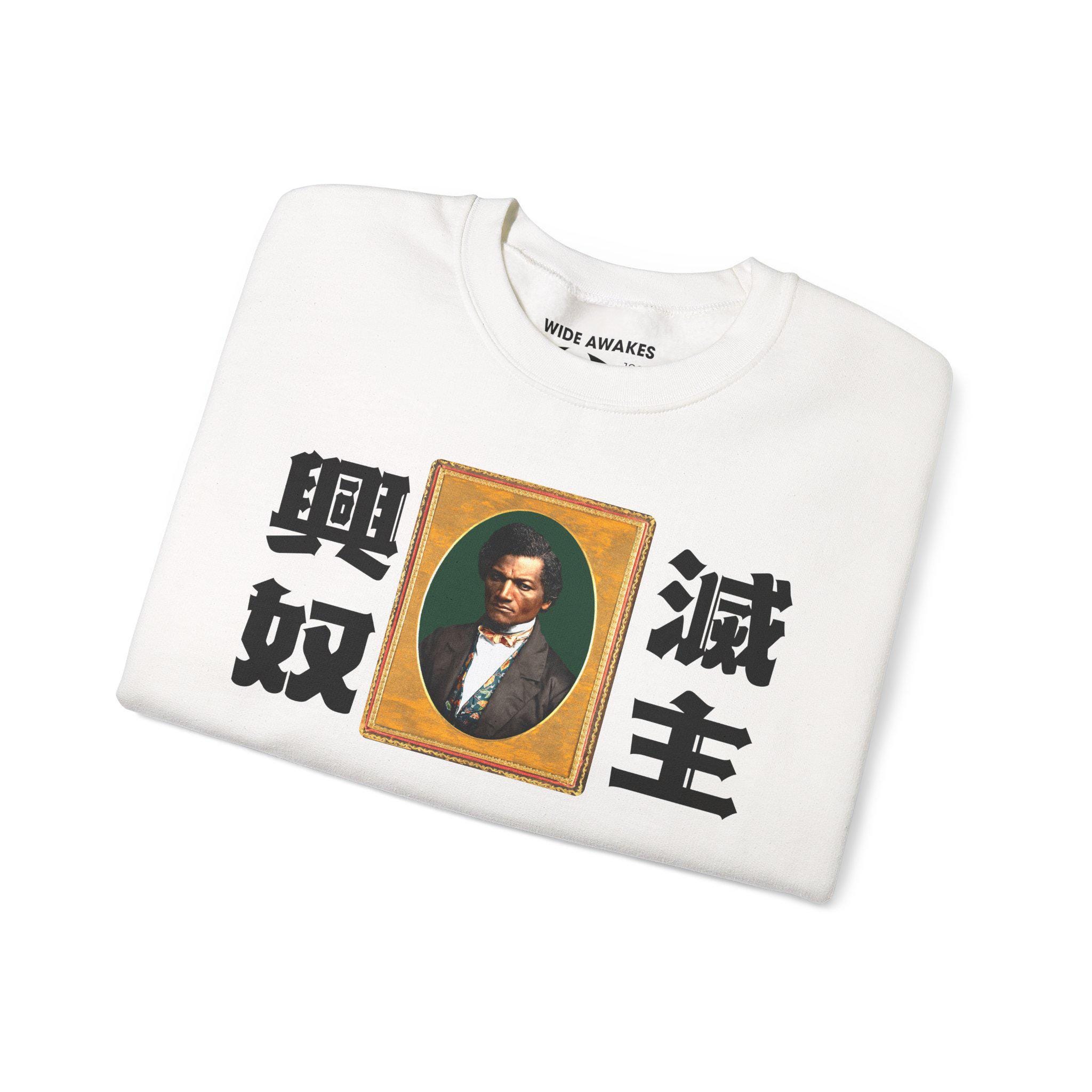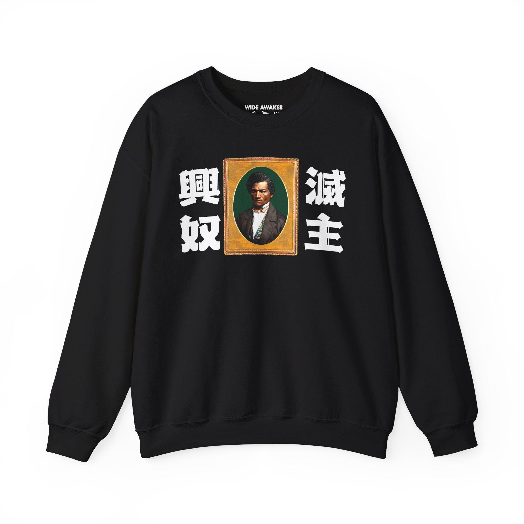 Stay warm this fall with a cozy crewneck sweatshirt that carries a powerful abolitionist message. The design pairs a classic, intense portrait of Frederick Douglass with the stark Japanese yojijukugo 滅主興奴 (Messhu kōdo), a phrase that translates to "Death to the Master, Glory to the Slave." The unique, blackletter-inspired Japanese font adds another layer of artistic anachronism. This is a profound, intellectually engaging piece of apparel for anyone who understands that the fight for freedom has always required a radical spirit.