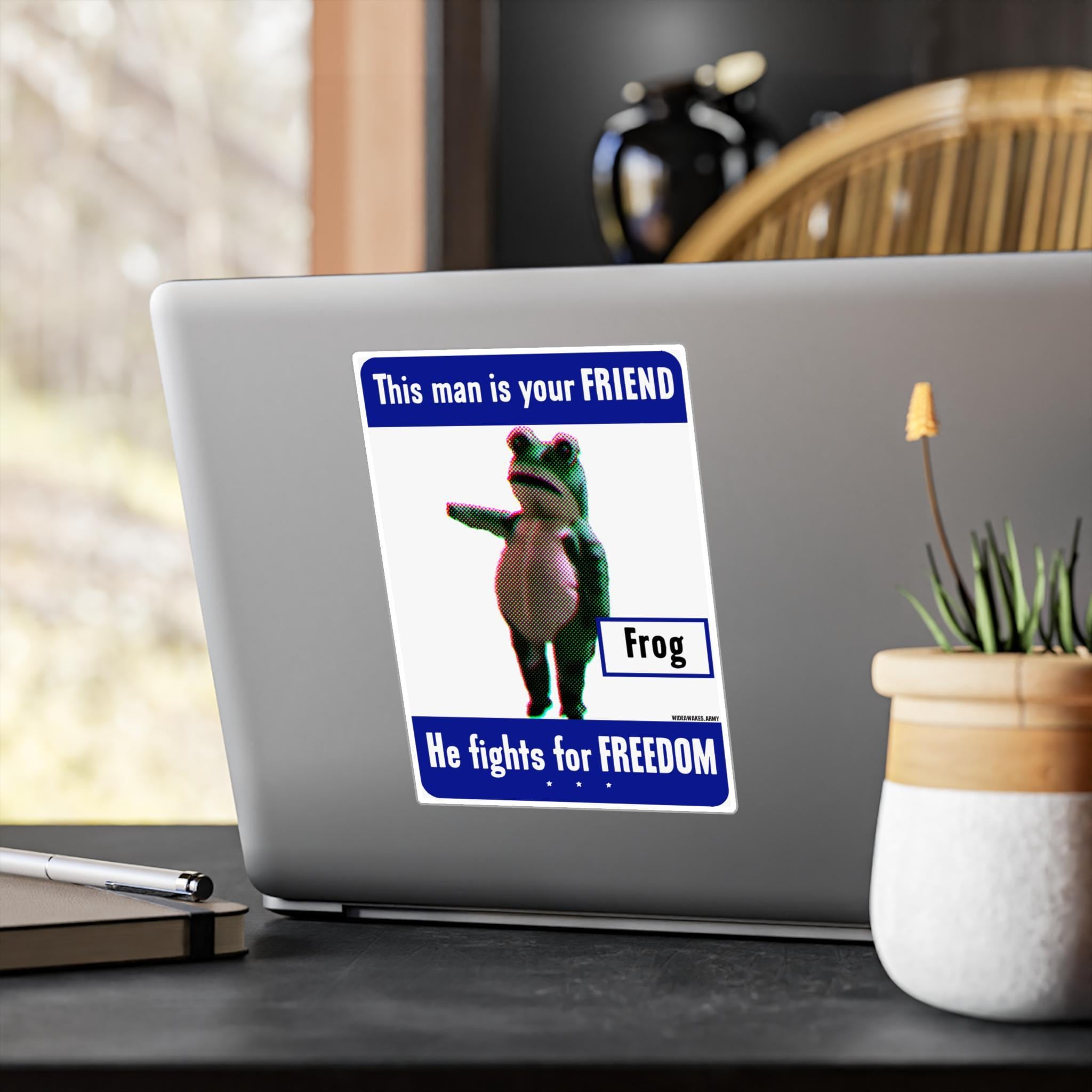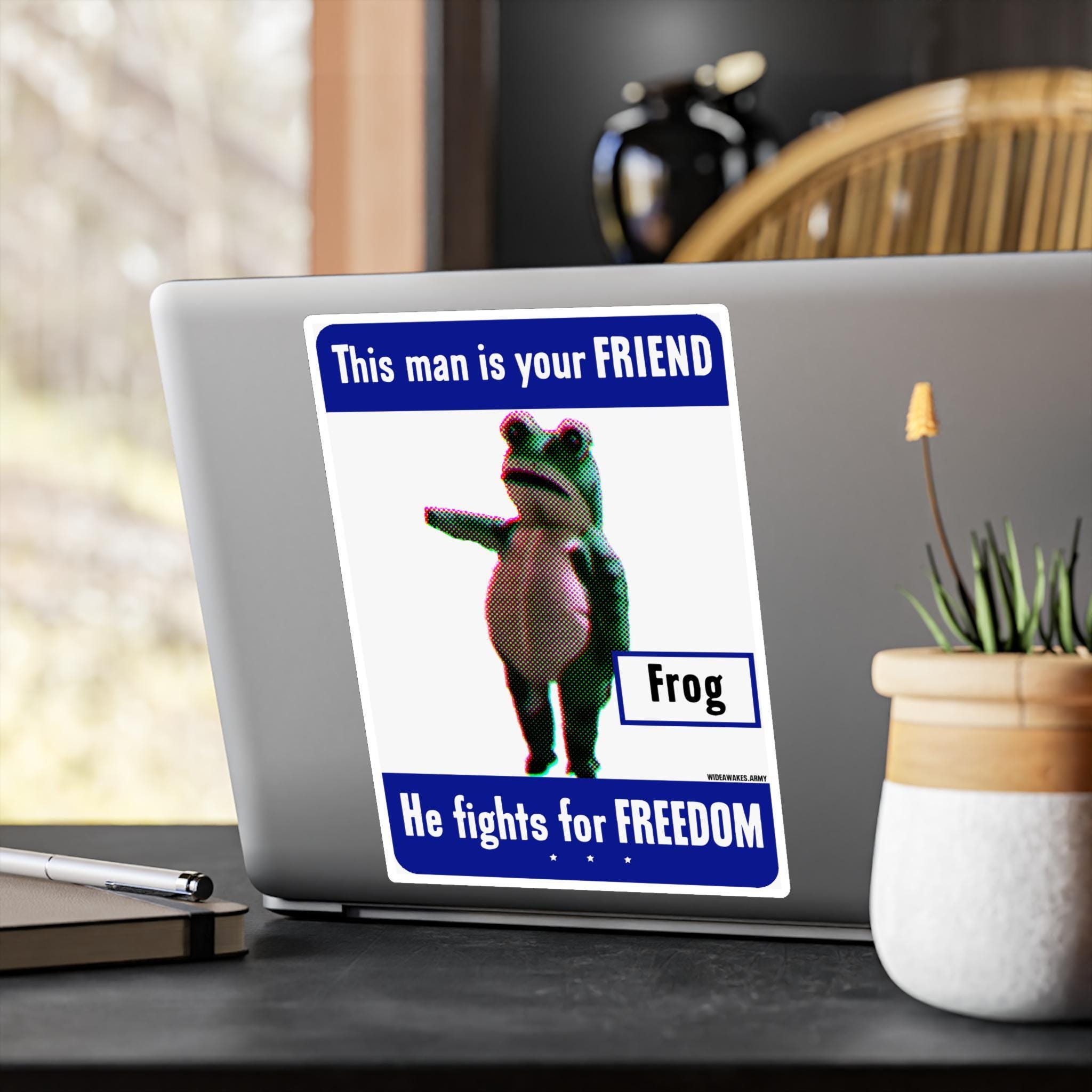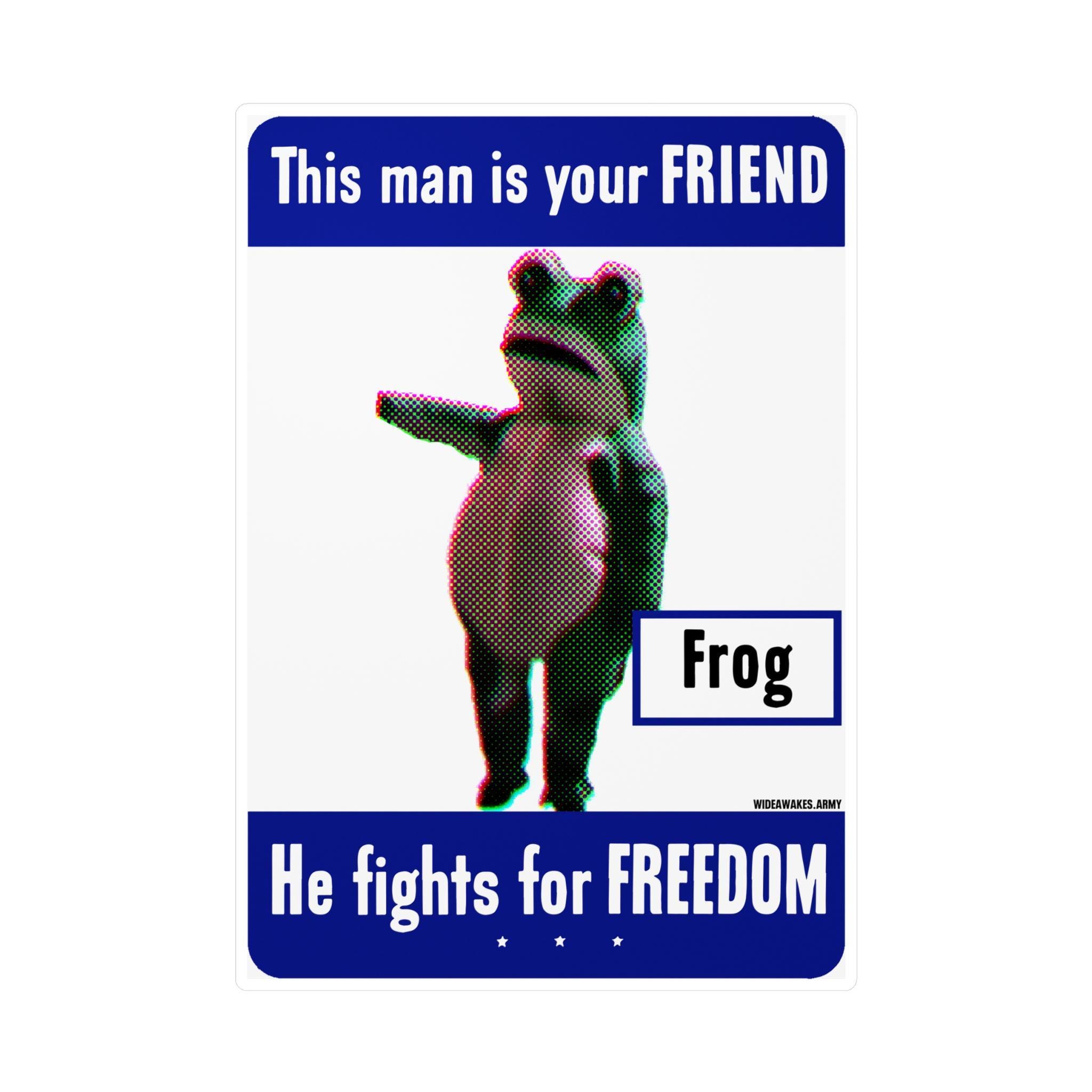 This durable vinyl decal is a tribute to a modern-day folk hero: the Portland Frog. We've taken the classic WWII propaganda poster series, "This man is your FRIEND. He fights for FREEDOM," and updated it for today's struggles. In place of a soldier, we feature the brave amphibian who joyfully and absurdly confronted federal agents in Portland, dancing in the face of pepper spray. It’s a hilarious and powerful statement that sometimes the most effective resistance is the most unexpected. Perfect for your car, laptop, or anywhere you want to display a symbol of joyful defiance.