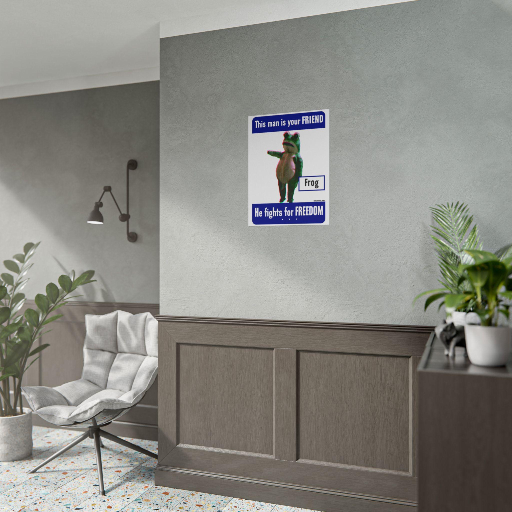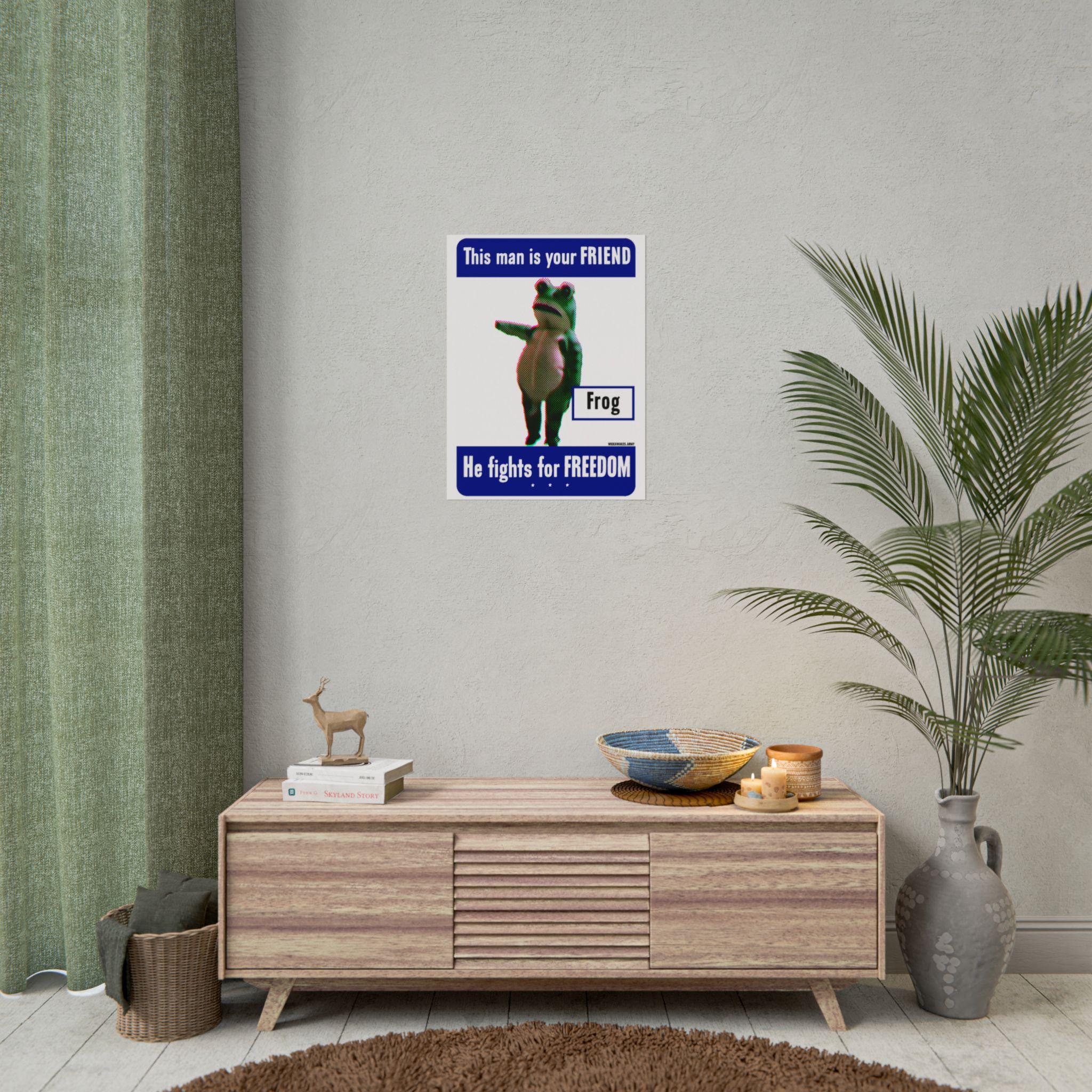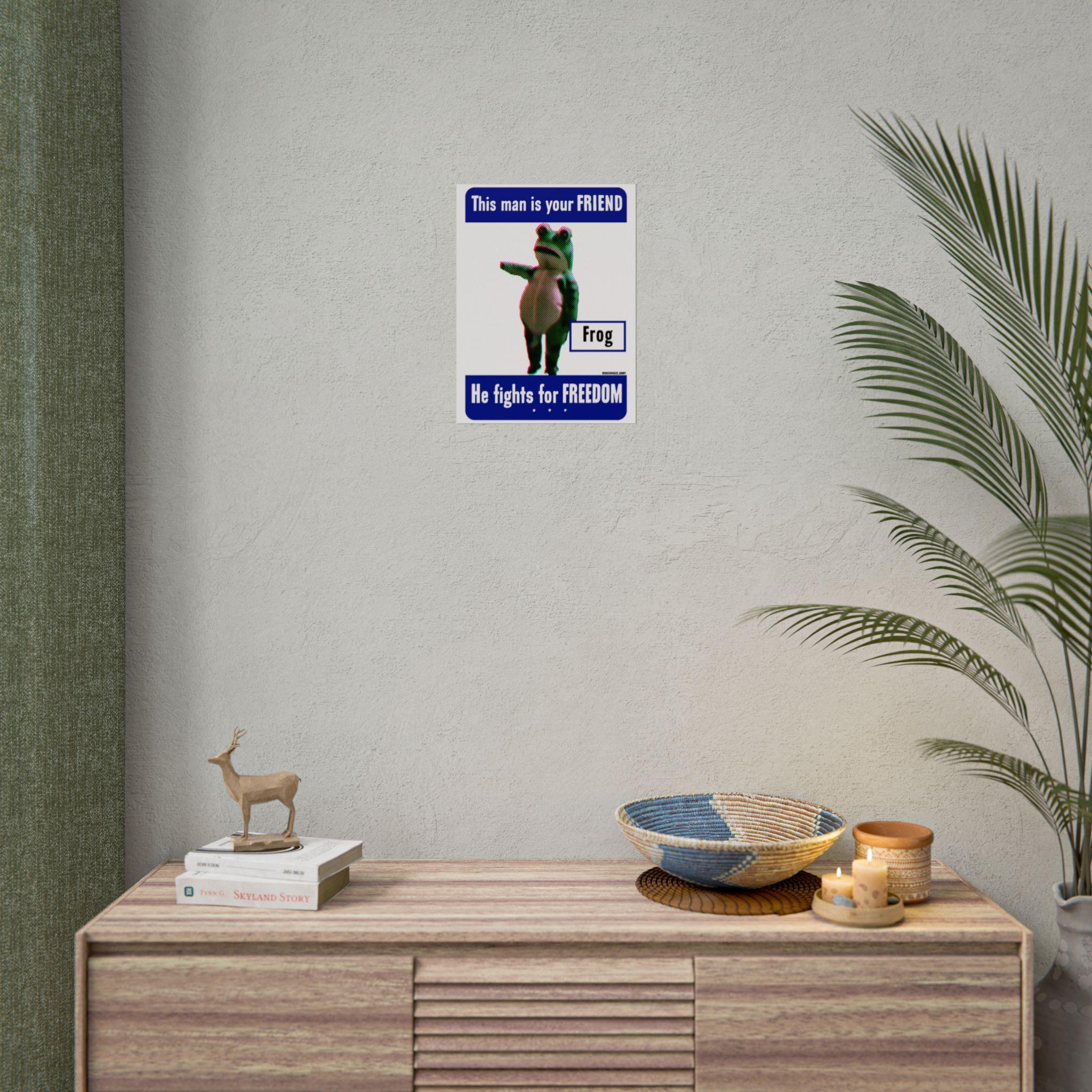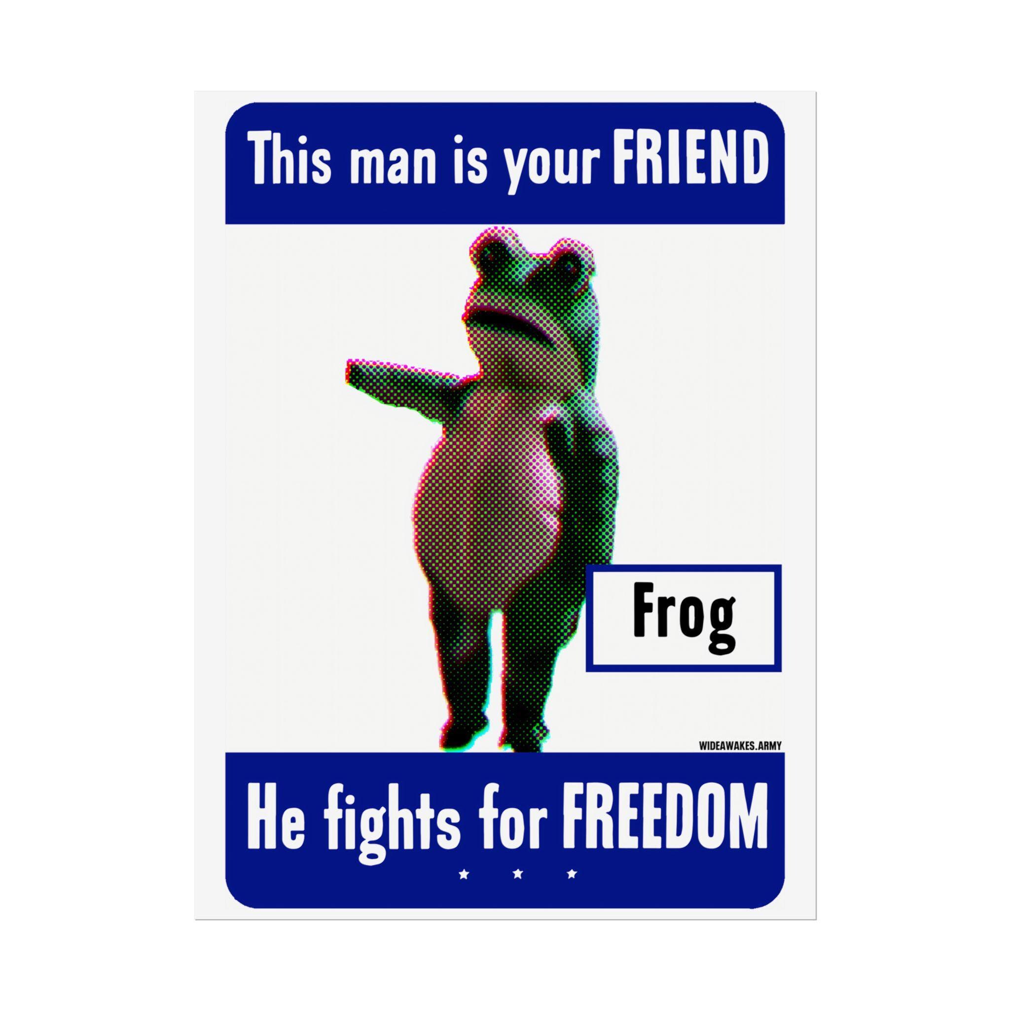 This art print is a tribute to the power of joyful, absurdist protest. The design is a modern take on the classic WWII poster "This man is your FRIEND. He fights for FREEDOM." Instead of a foreign soldier, our hero is the Portland Frog, the inflatable-costumed activist who became a social media sensation for dancing in the faces of federal agents. It's a hilarious and surprisingly profound statement about the nature of courage and resistance in our time. This high-quality poster is a perfect piece of contemporary history for your wall.