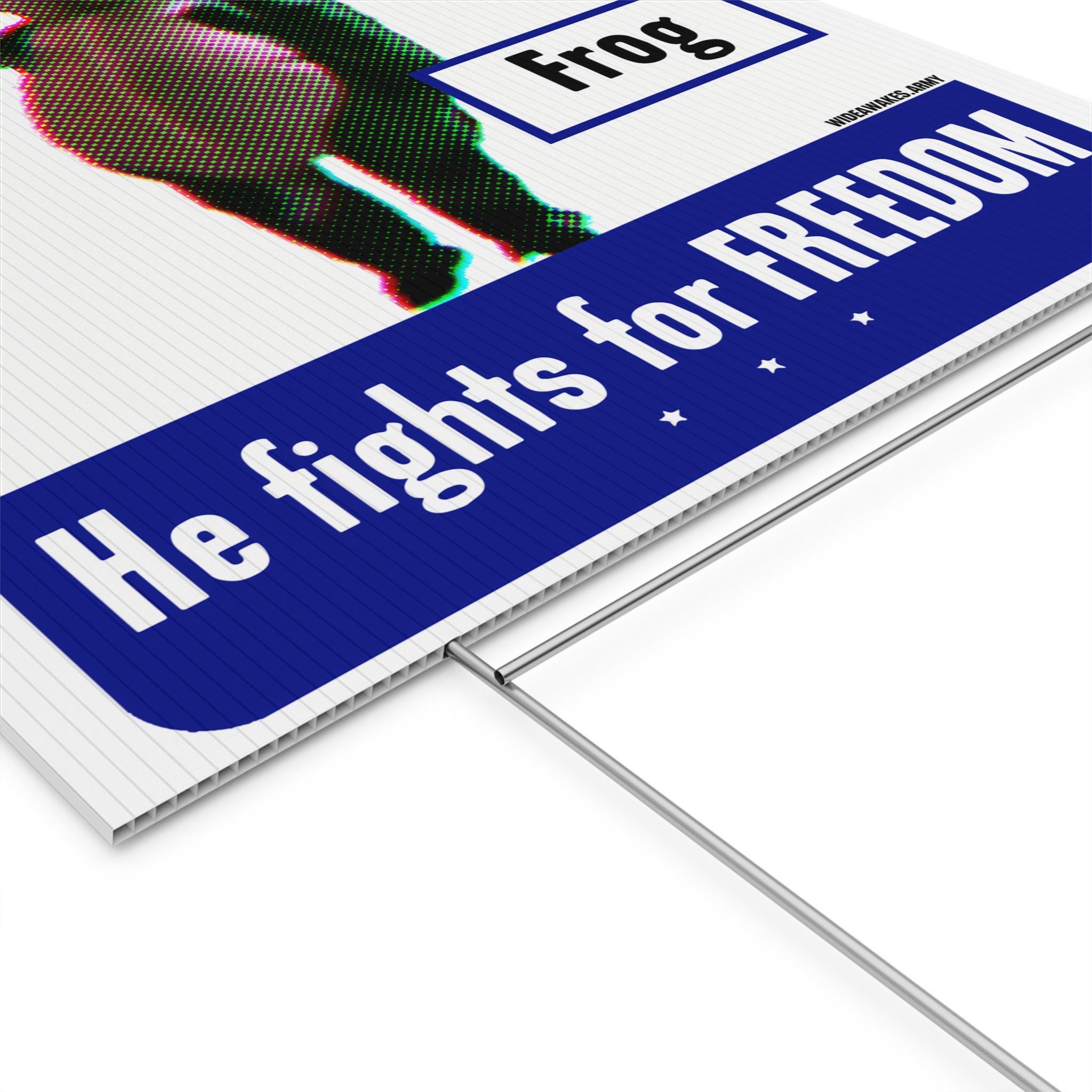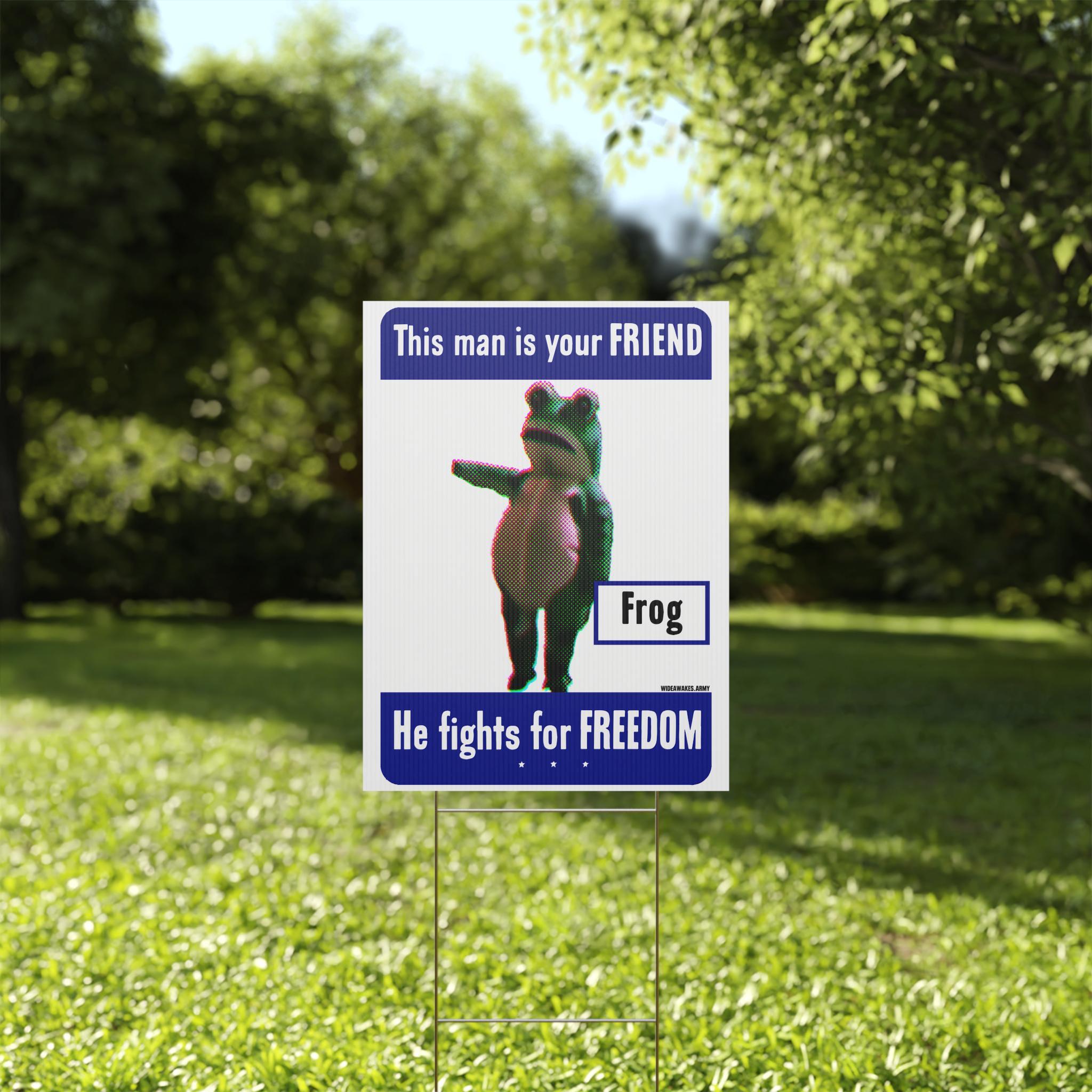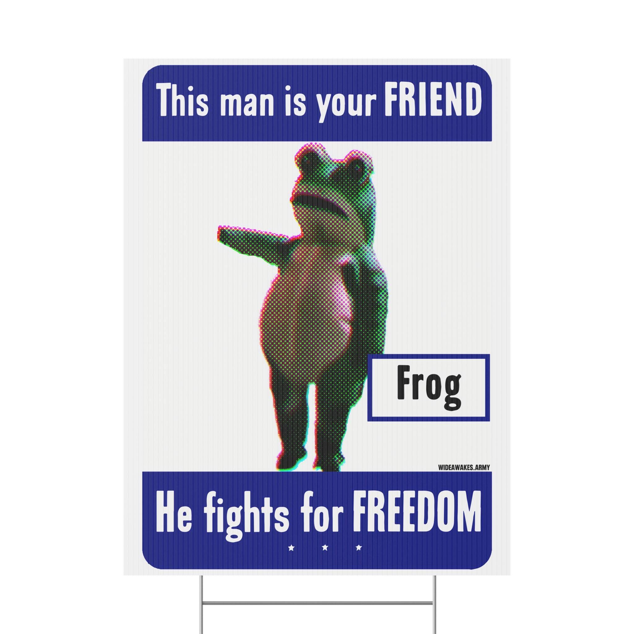 Show your support for joyful, creative protest with this durable plastic yard sign. The design is a modern parody of the classic WWII "This man is your FRIEND" propaganda posters, but our hero is the legendary Portland Frog. This sign celebrates the absurdist courage of the activist who danced in the face of federal agents, inspiring a movement of joyful defiance. Printed on weatherproof corrugated plastic, this sign is ready to bring a message of humorous resistance to your neighborhood.