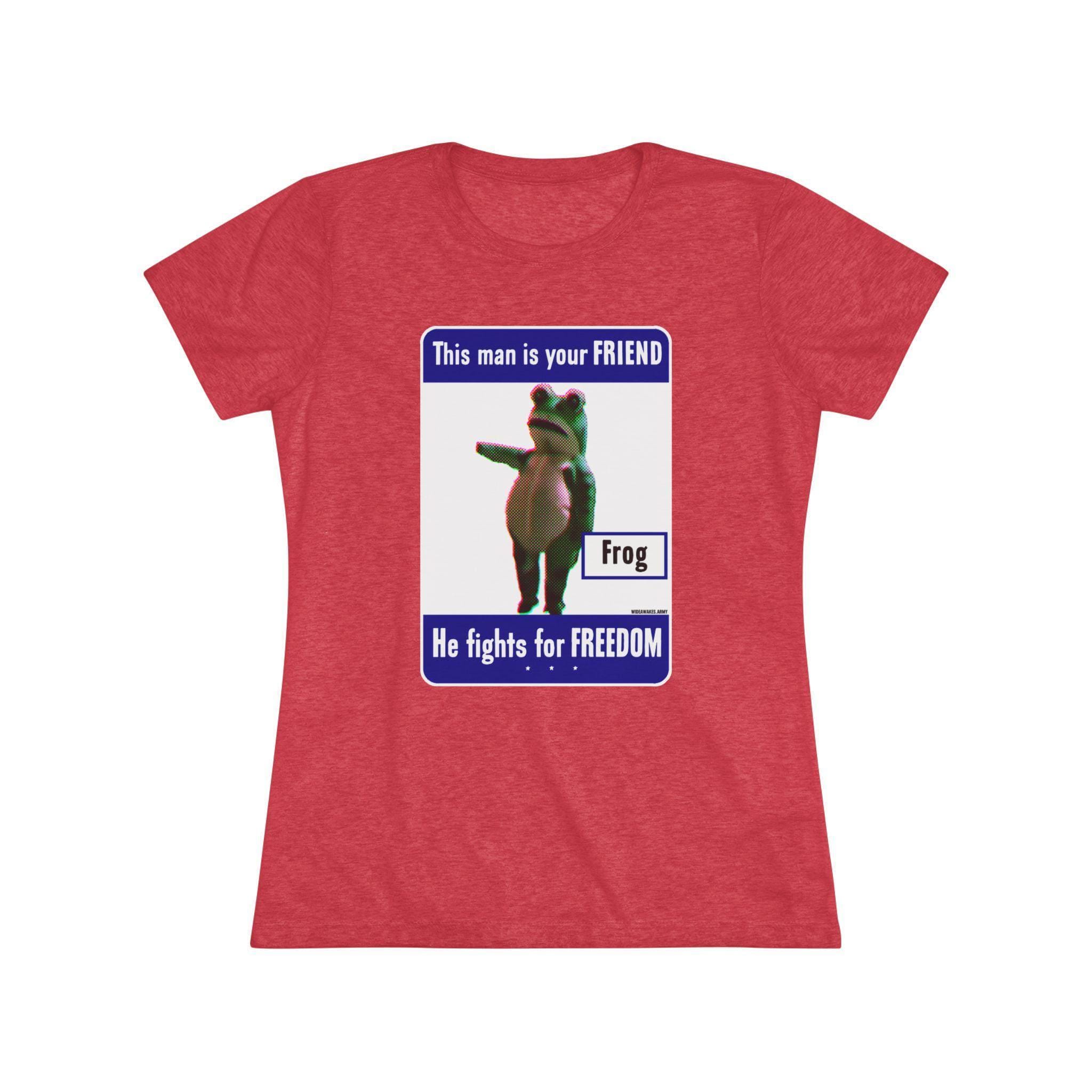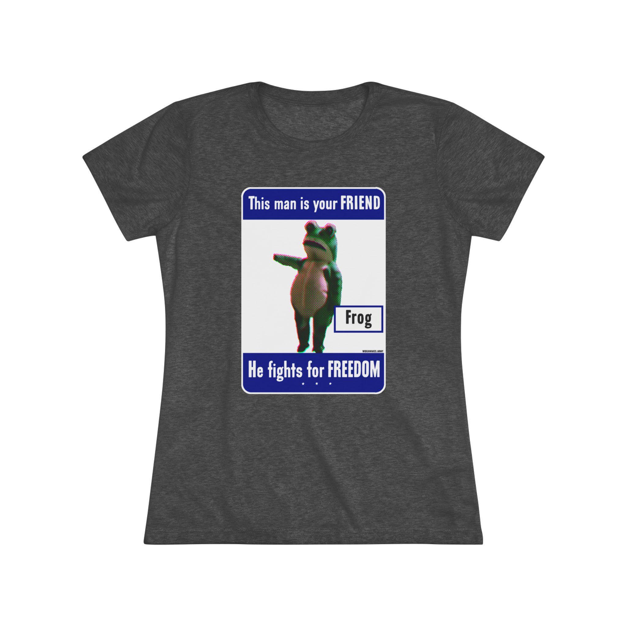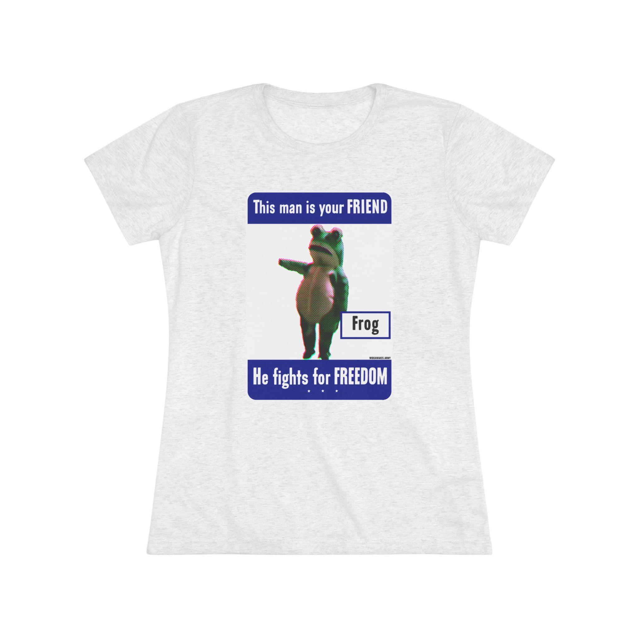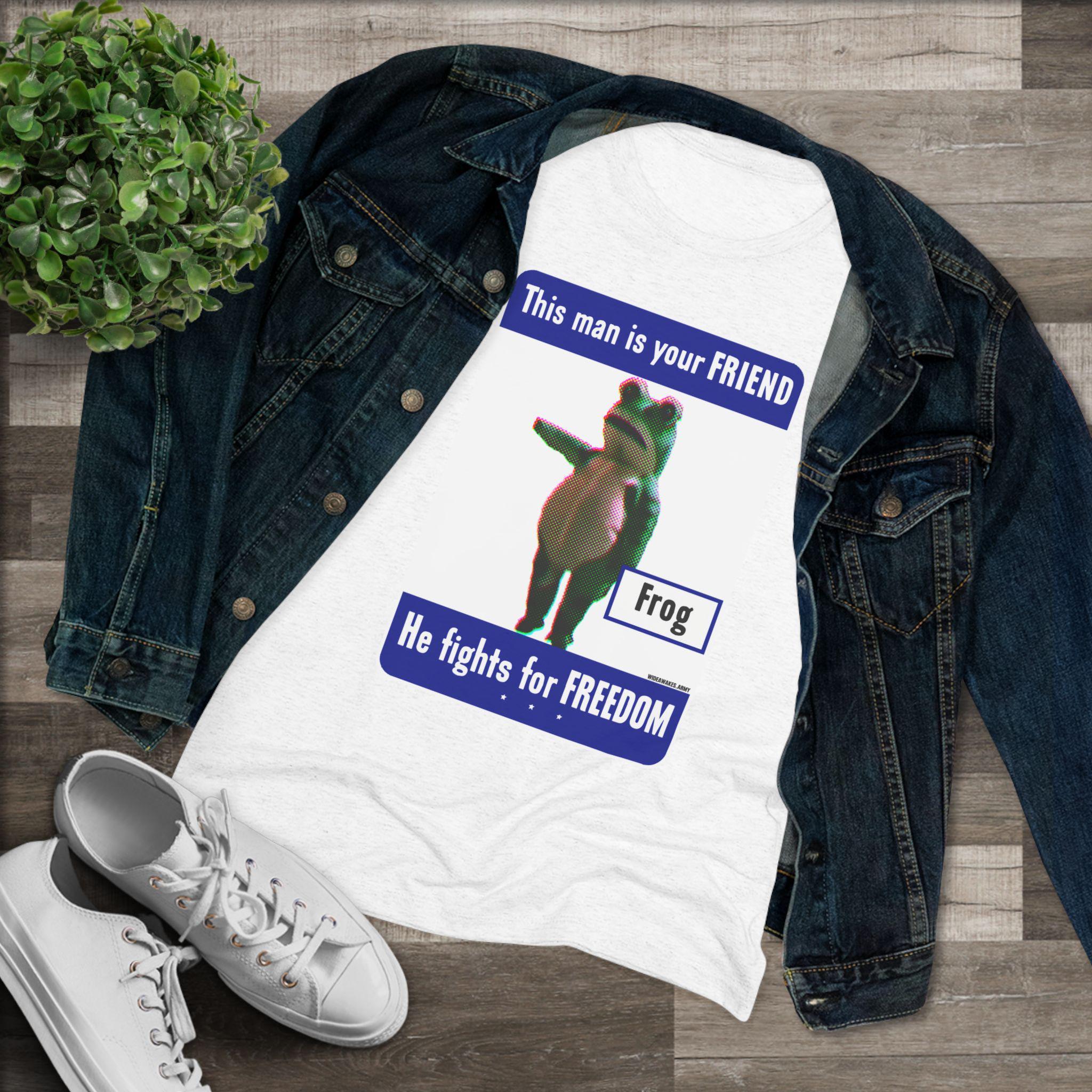 This women's t-shirt combines a hilarious piece of modern protest art with a comfortable and stylish fit. The design is a parody of the WWII "This man is your FRIEND" posters, updated for today with the legendary Portland Frog. It celebrates the activist who chose joyful, absurd dance as their form of resistance against federal agents. This soft, contoured tee is a perfect way to wear a symbol of creative, courageous, and humorous defiance.