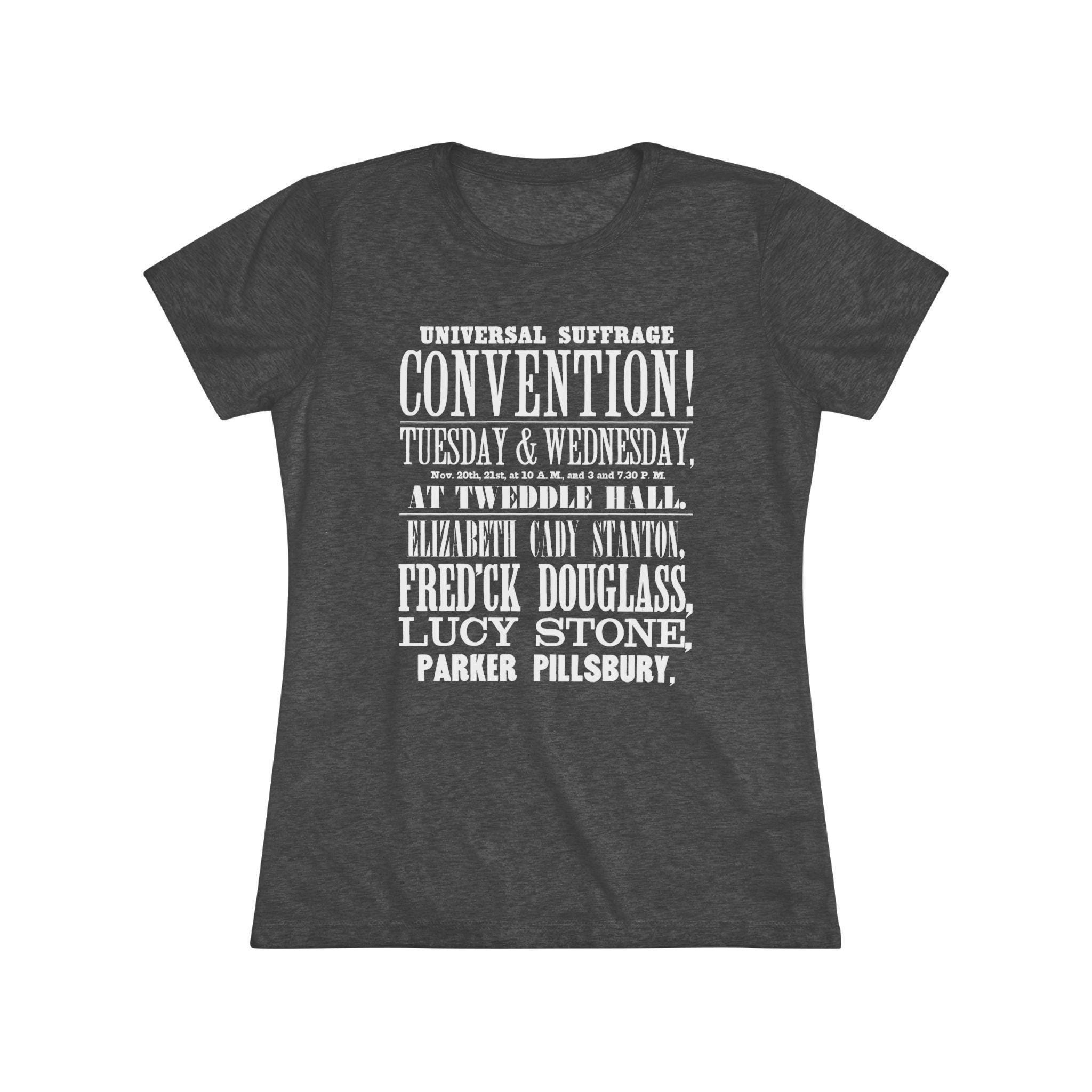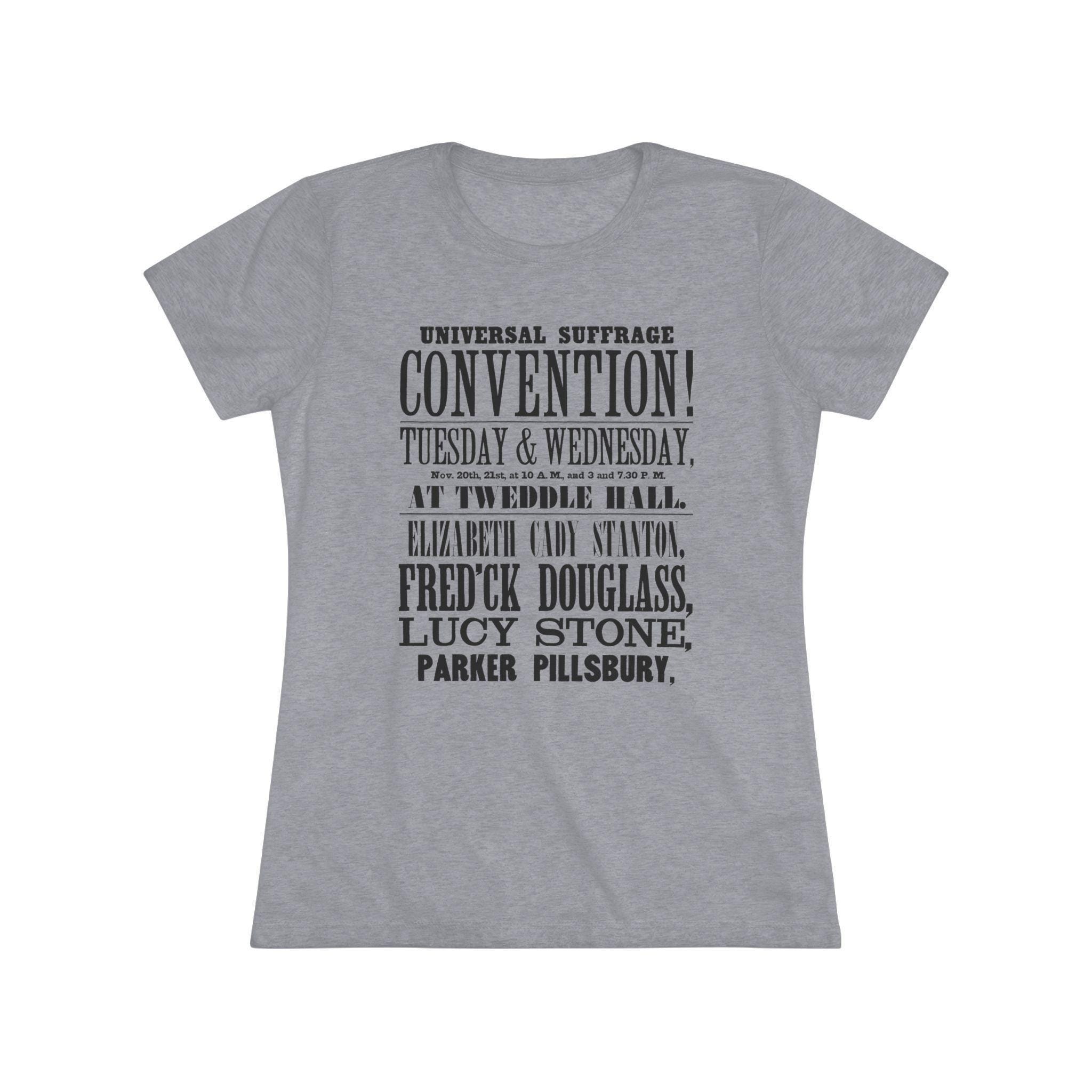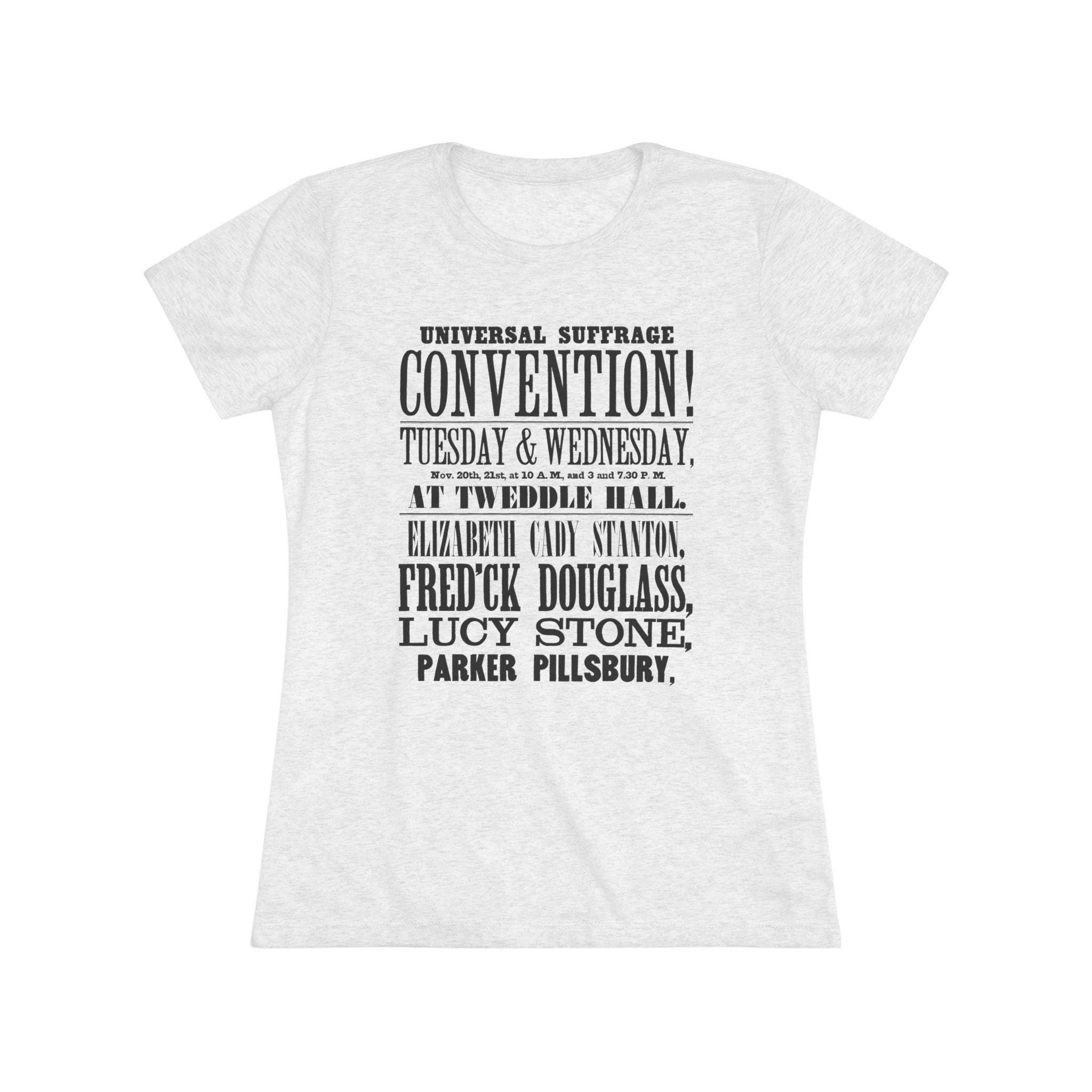 This women's t-shirt combines a powerful piece of feminist and abolitionist history with a comfortable and stylish fit. The design is an excerpt from a real 1848 poster for a Women's Suffrage Convention, showcasing the stunning 19th-century typography and a legendary list of speakers, including Elizabeth Cady Stanton, Frederick Douglass, and Lucy Stone. This soft, contoured tee is a perfect way to wear a piece of profound American history that speaks to the very roots of the fight for equality.