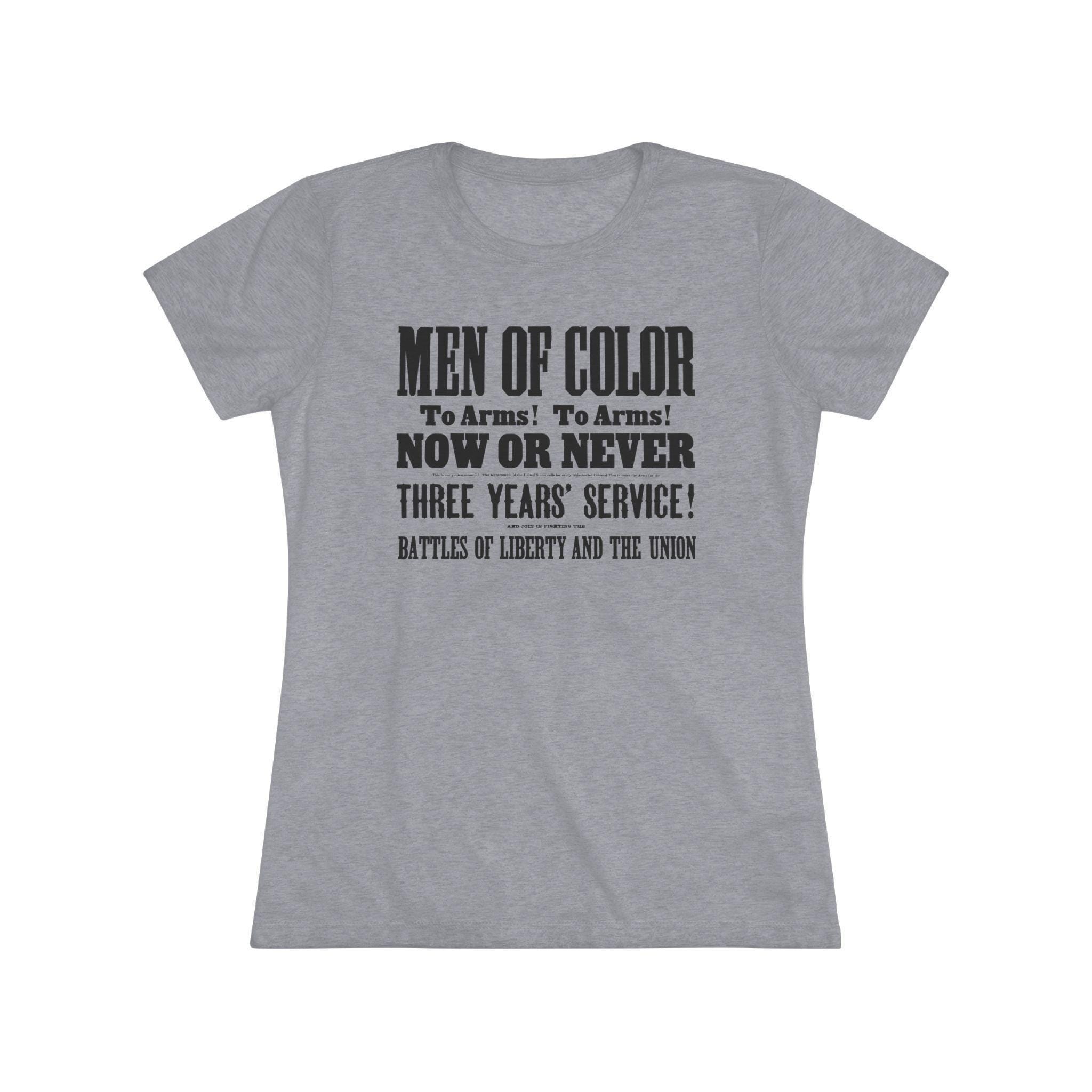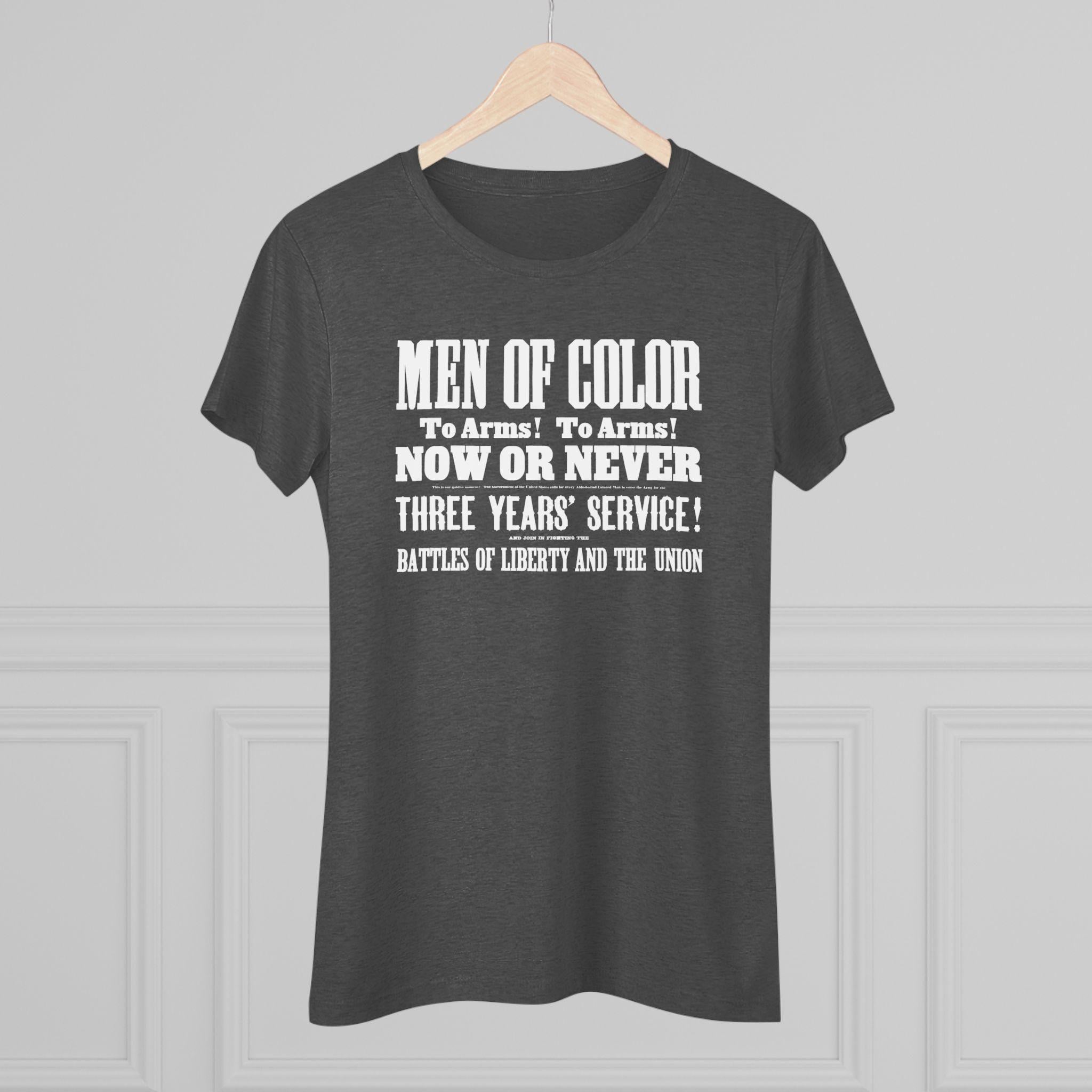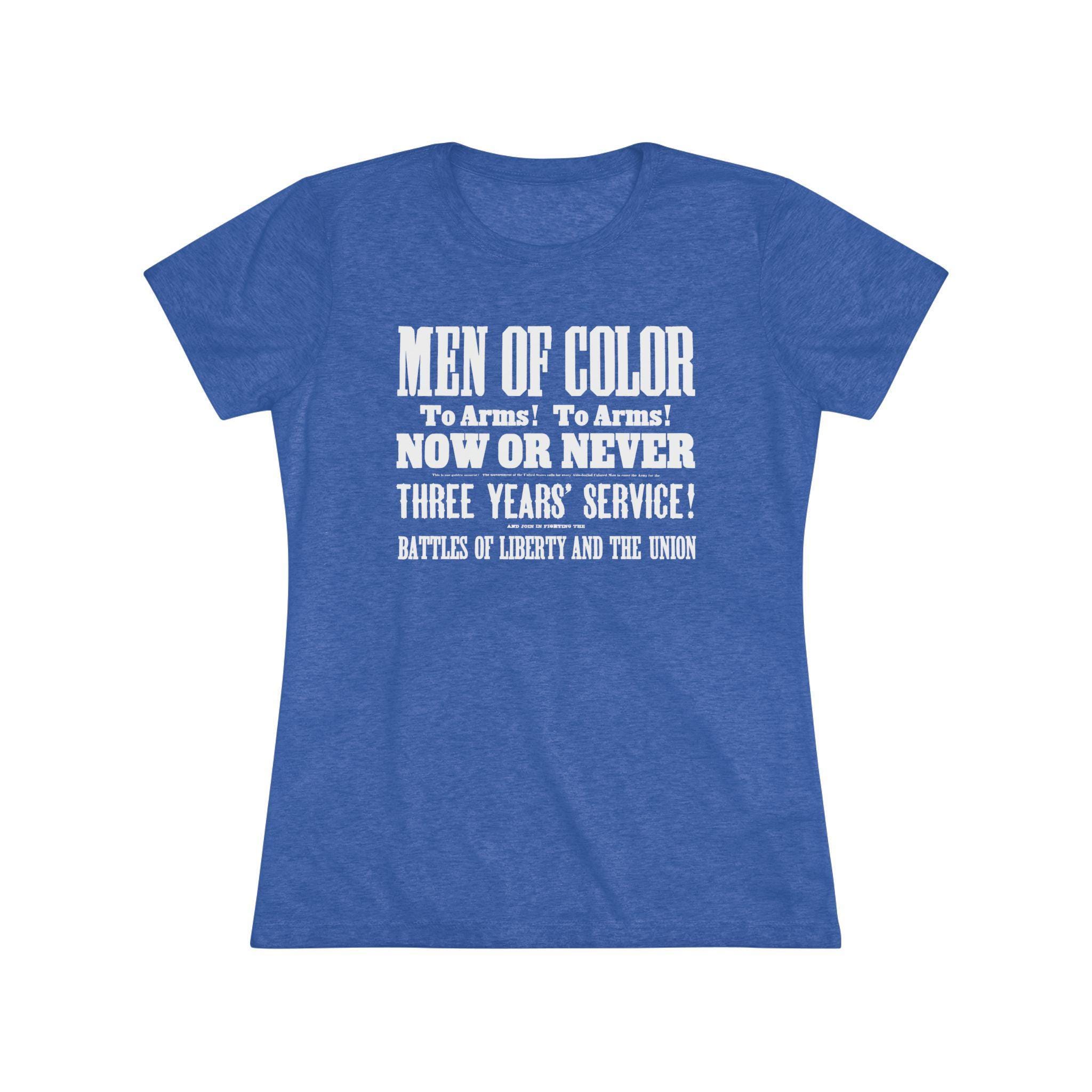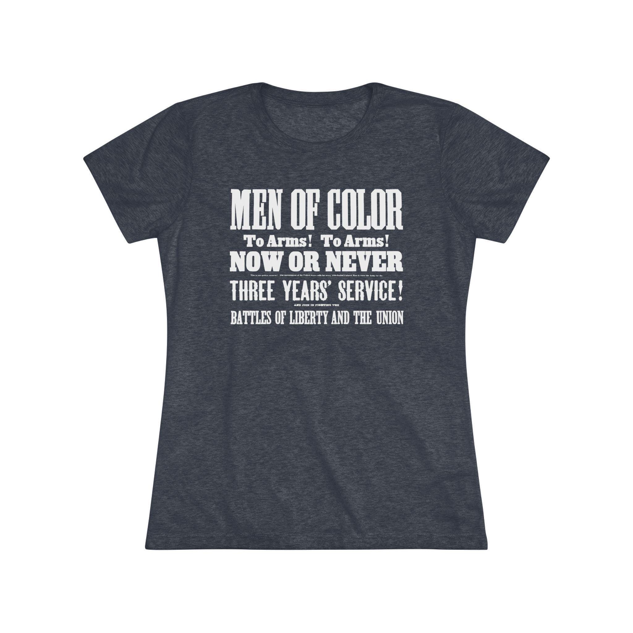 This women's t-shirt combines a powerful piece of American history with a comfortable and stylish fit. The design is a restored excerpt from an 1863 Philadelphia poster, a direct and emotional appeal for Black men to take up arms in the "BATTLES OF LIBERTY AND THE UNION." The stunning 19th-century typography is a work of art in itself, conveying the urgency of the moment with slogans like "MEN OF COLOR, To Arms! To Arms!" and "NOW OR NEVER!" This soft, contoured tee is a perfect way to wear a piece of profound history that speaks to the crucial role of Black soldiers in their own liberation.