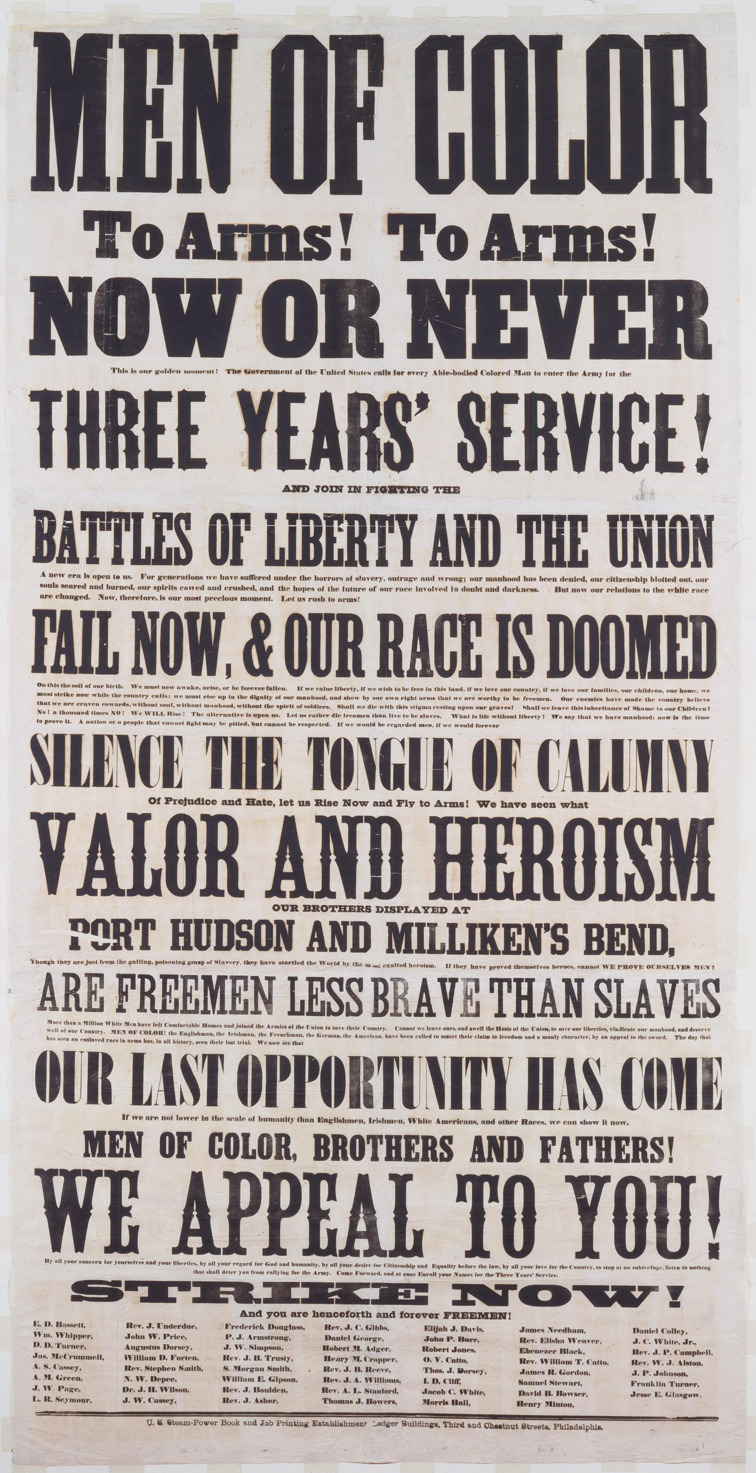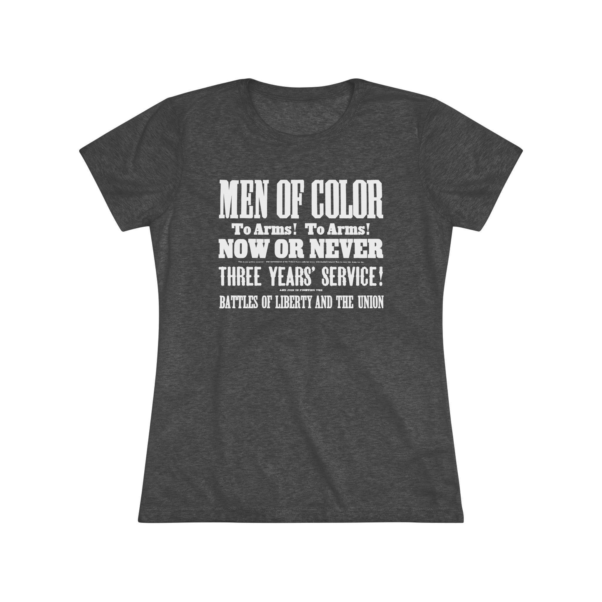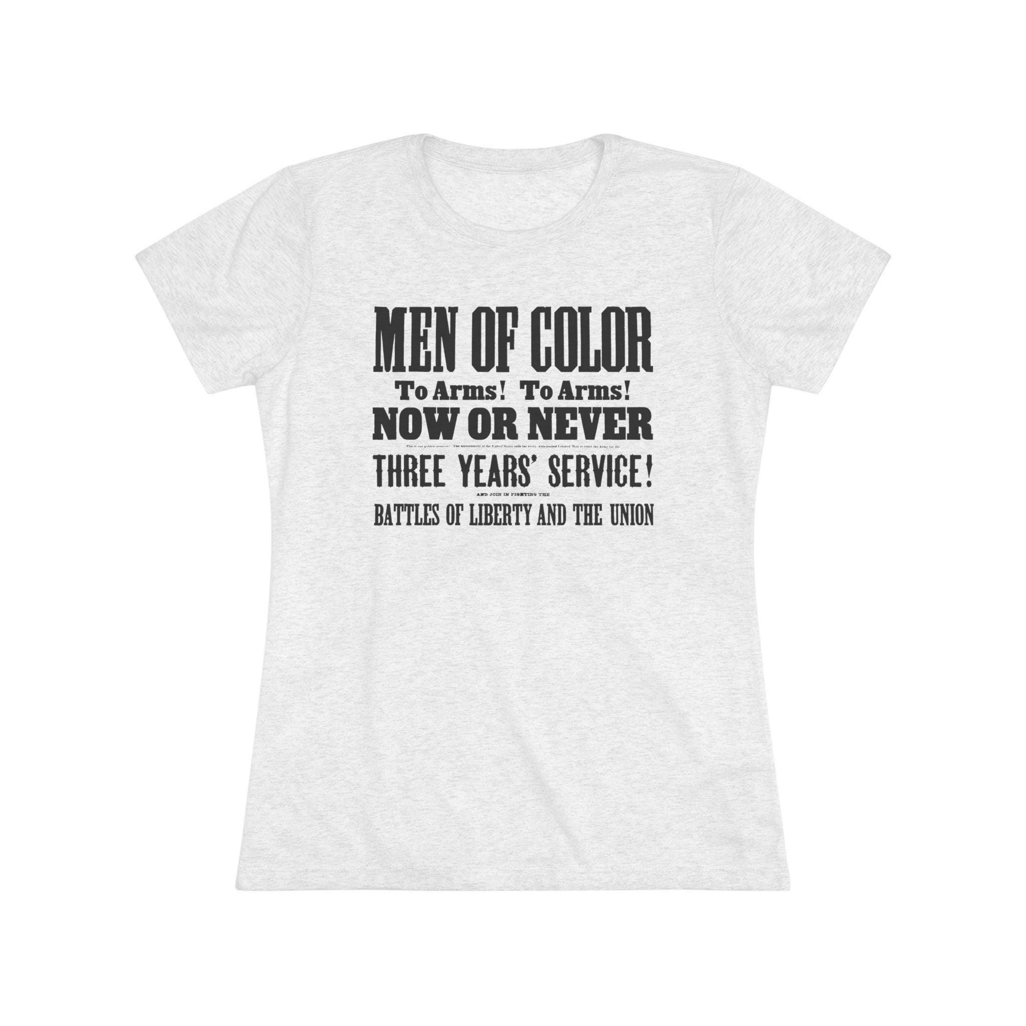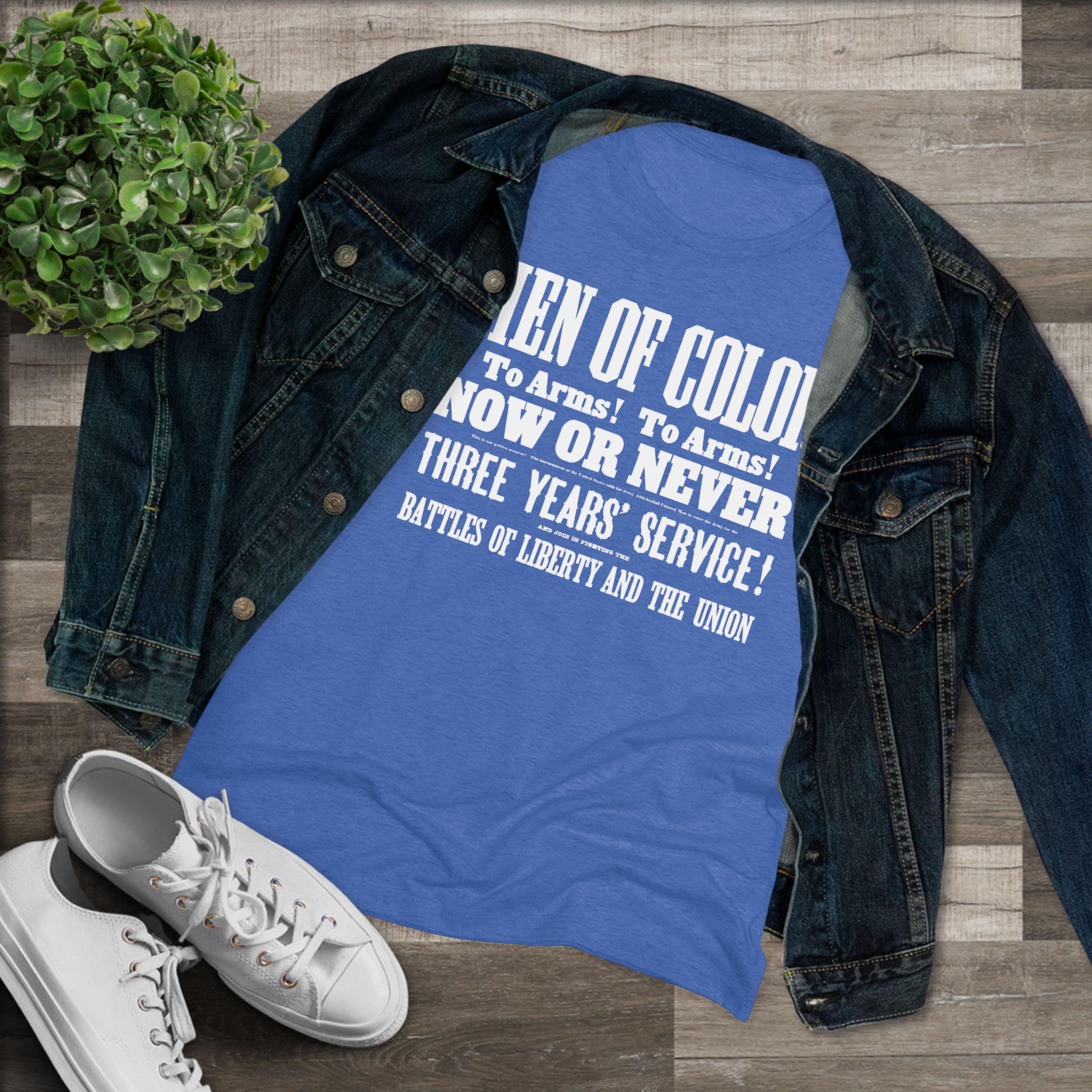 This women's t-shirt combines a powerful piece of American history with a comfortable and stylish fit. The design is a restored excerpt from an 1863 Philadelphia poster, a direct and emotional appeal for Black men to take up arms in the "BATTLES OF LIBERTY AND THE UNION." The stunning 19th-century typography is a work of art in itself, conveying the urgency of the moment with slogans like "MEN OF COLOR, To Arms! To Arms!" and "NOW OR NEVER!" This soft, contoured tee is a perfect way to wear a piece of profound history that speaks to the crucial role of Black soldiers in their own liberation.