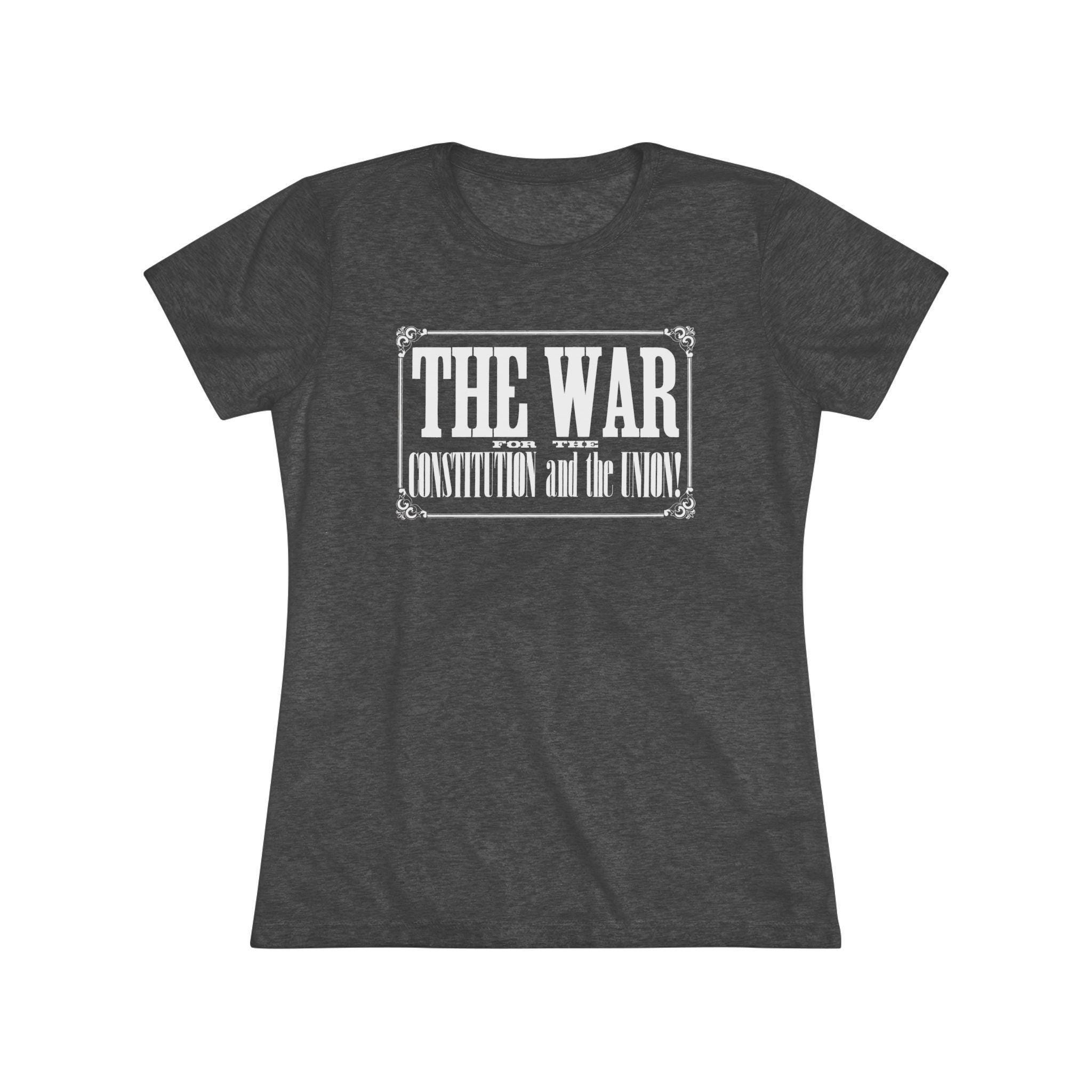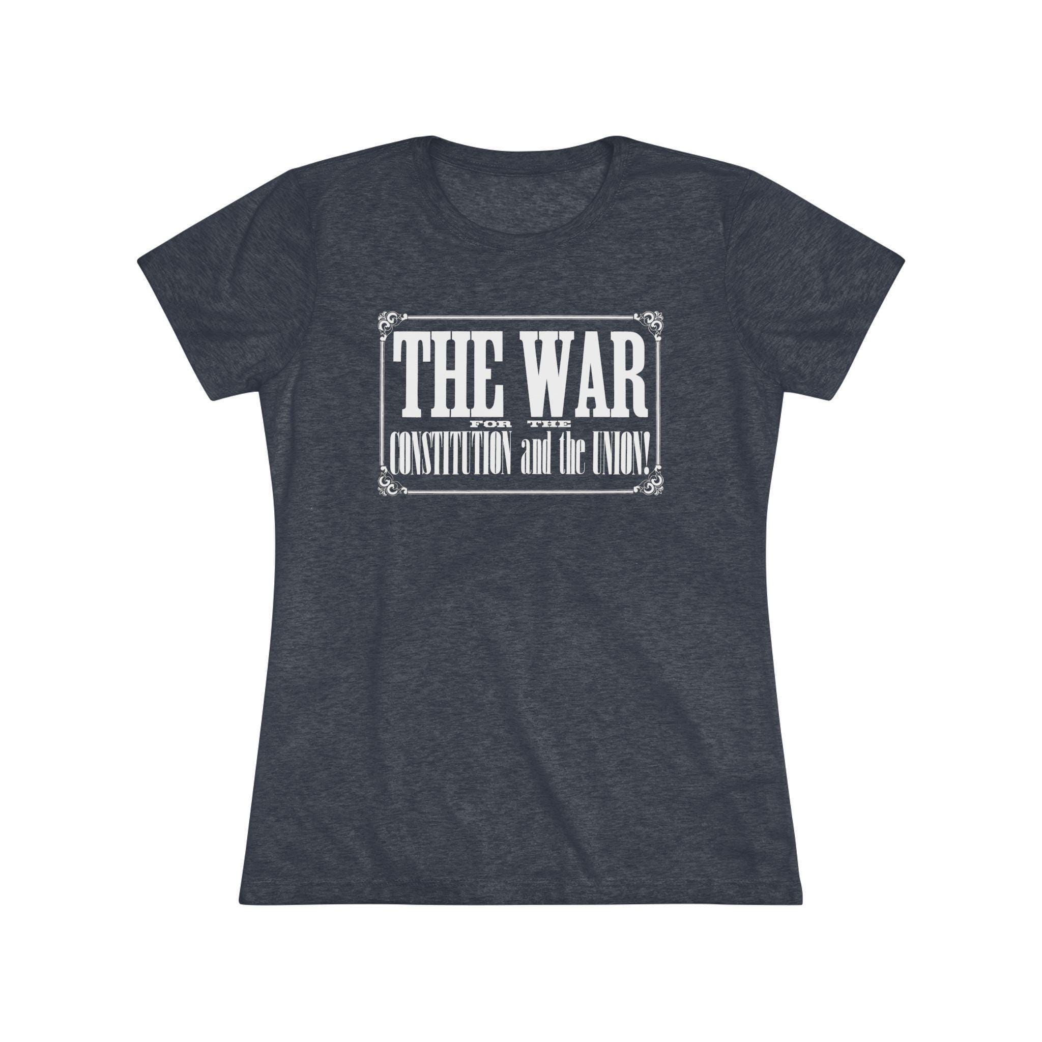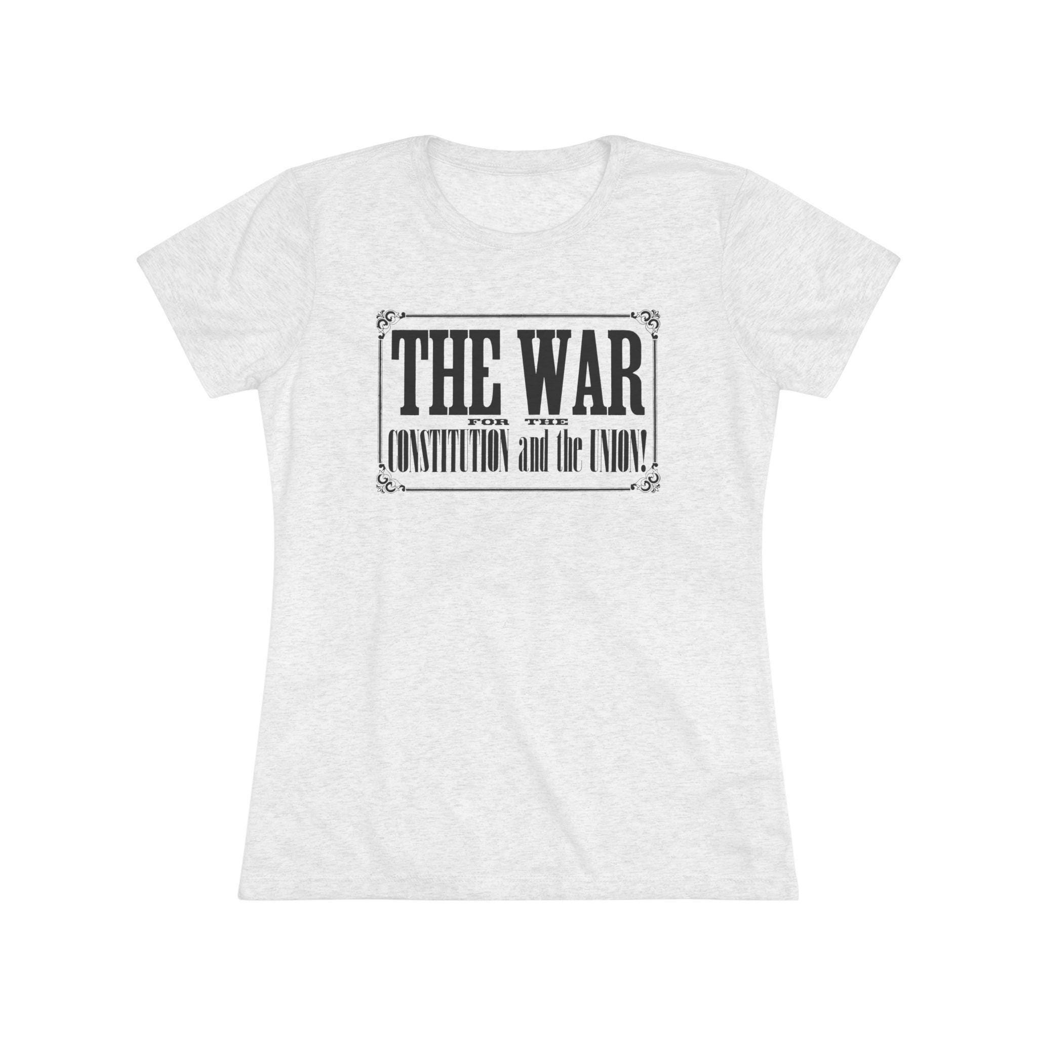 This women's t-shirt combines a powerful historical statement with a comfortable and stylish fit. The design is the bold, typographic headline from an 1862 Civil War recruitment poster: "THE WAR FOR THE CONSTITUTION and the UNION!" Presented within its original ornate frame, it's a beautiful example of 19th-century graphic design. This soft, contoured tee is a perfect way to wear a piece of profound history that speaks to the enduring principles of the nation.