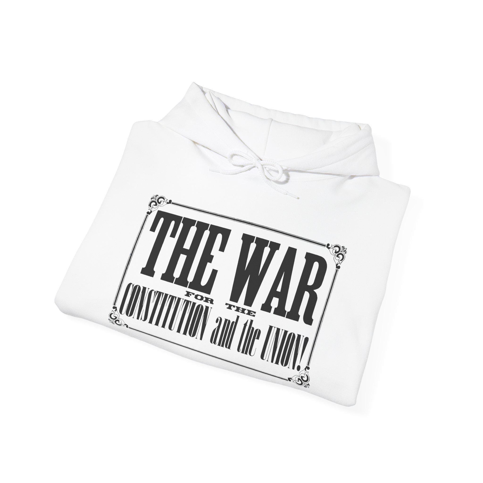 This comfortable and warm hoodie features a stunning piece of 19th-century typography, taken from a Civil War recruitment poster. The design isolates the powerful, framed headline, a clear and resolute statement that the fight was "THE WAR FOR THE CONSTITUTION and the UNION!" With a soft fleece interior and a spacious front pocket, this hoodie is a wearable piece of art for anyone who values the foundational principles of American law and unity.