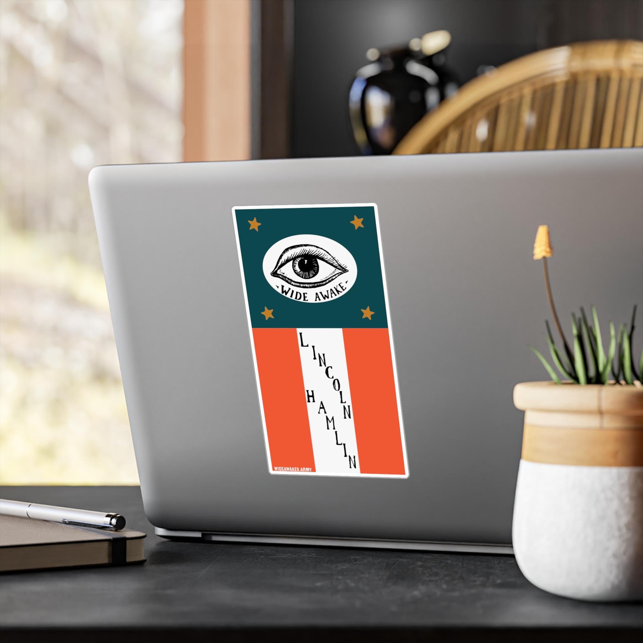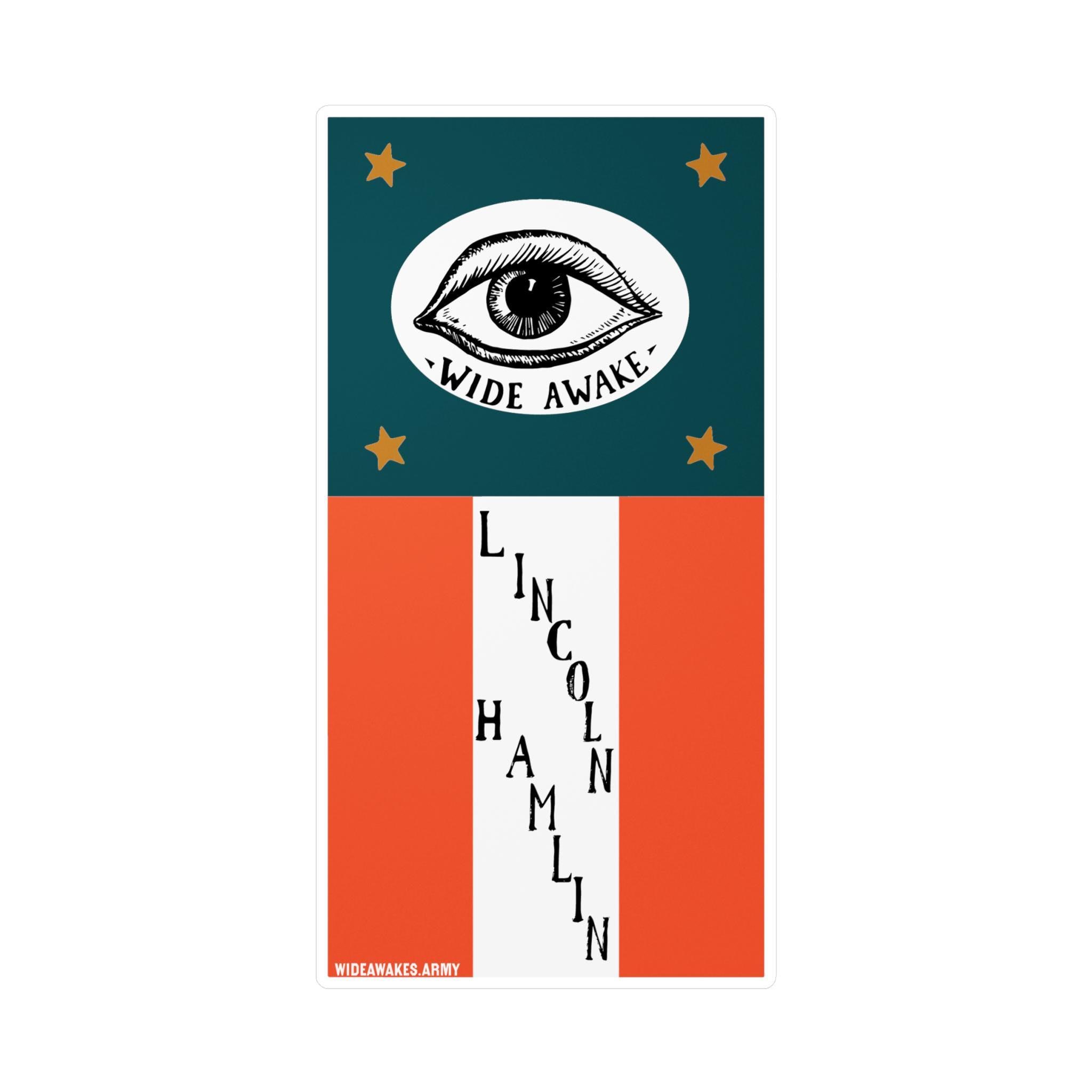This durable vinyl decal is a faithful reproduction of a complete, vertically-oriented parade banner carried by the "Wide Awakes" during the 1860 presidential election. The design has a wonderful, authentic "folk art" feel, capturing the grassroots energy of the movement. The banner evokes the American flag, with a blue field at the top and red and white stripes below. The upper section features the charming, hand-drawn "WIDE AWAKES" eye emblem, surrounded by four gold stars. On the stripes below, the names of the candidates, "LINCOLN" and "HAMLIN," are displayed in a unique, cascading arrangement. It's a complete piece of historical ephemera, perfect for anyone who loves the authentic, handmade art of 19th-century political movements.