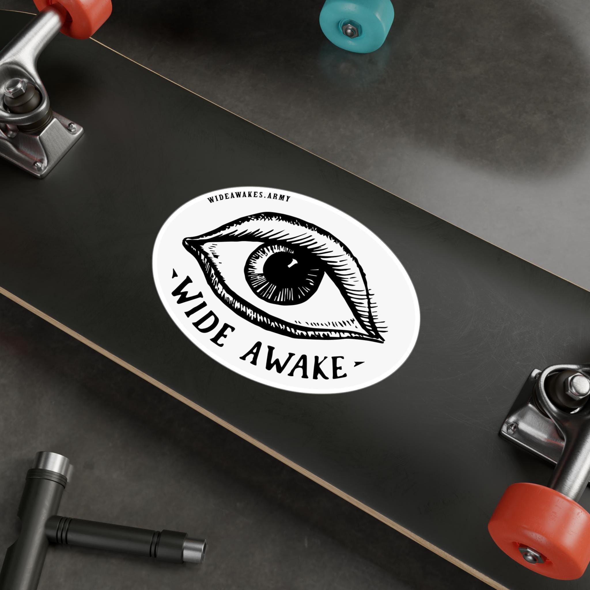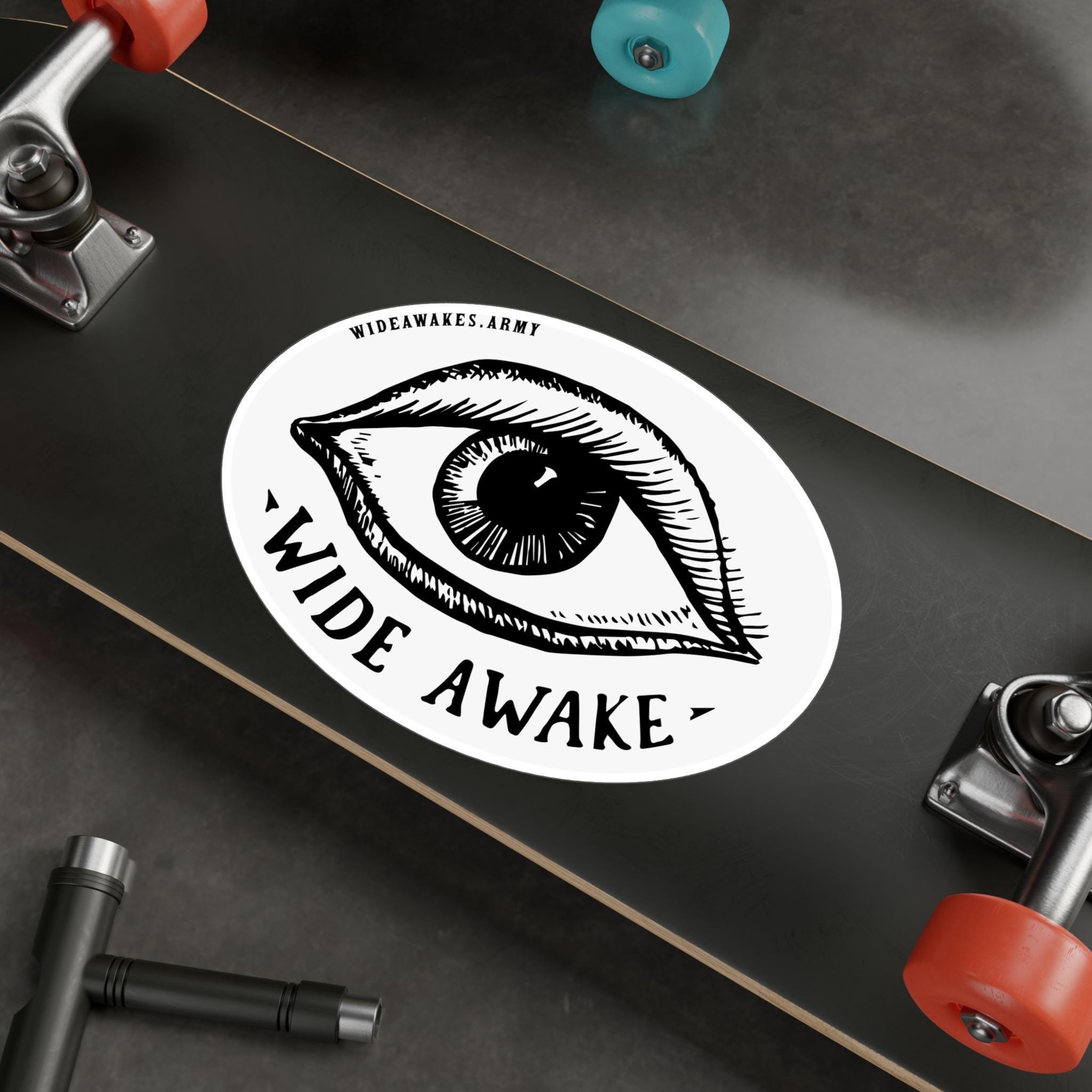 This durable vinyl decal features a unique and charming design from the heart of the 1860 presidential campaign. The artwork is a restored detail from an authentic Wide Awakes parade banner, showcasing a more "naive," hand-drawn style. It features an illustrative eye with lashes and lids, surrounded by a hand-lettered serif font proclaiming "WIDE AWAKE," complete with charming "carat" flourishes. This isn't a slick, mass-produced design; it's a tribute to the authentic, grassroots artistry of the political movements of the past. Perfect for any surface that needs a touch of genuine historical character.