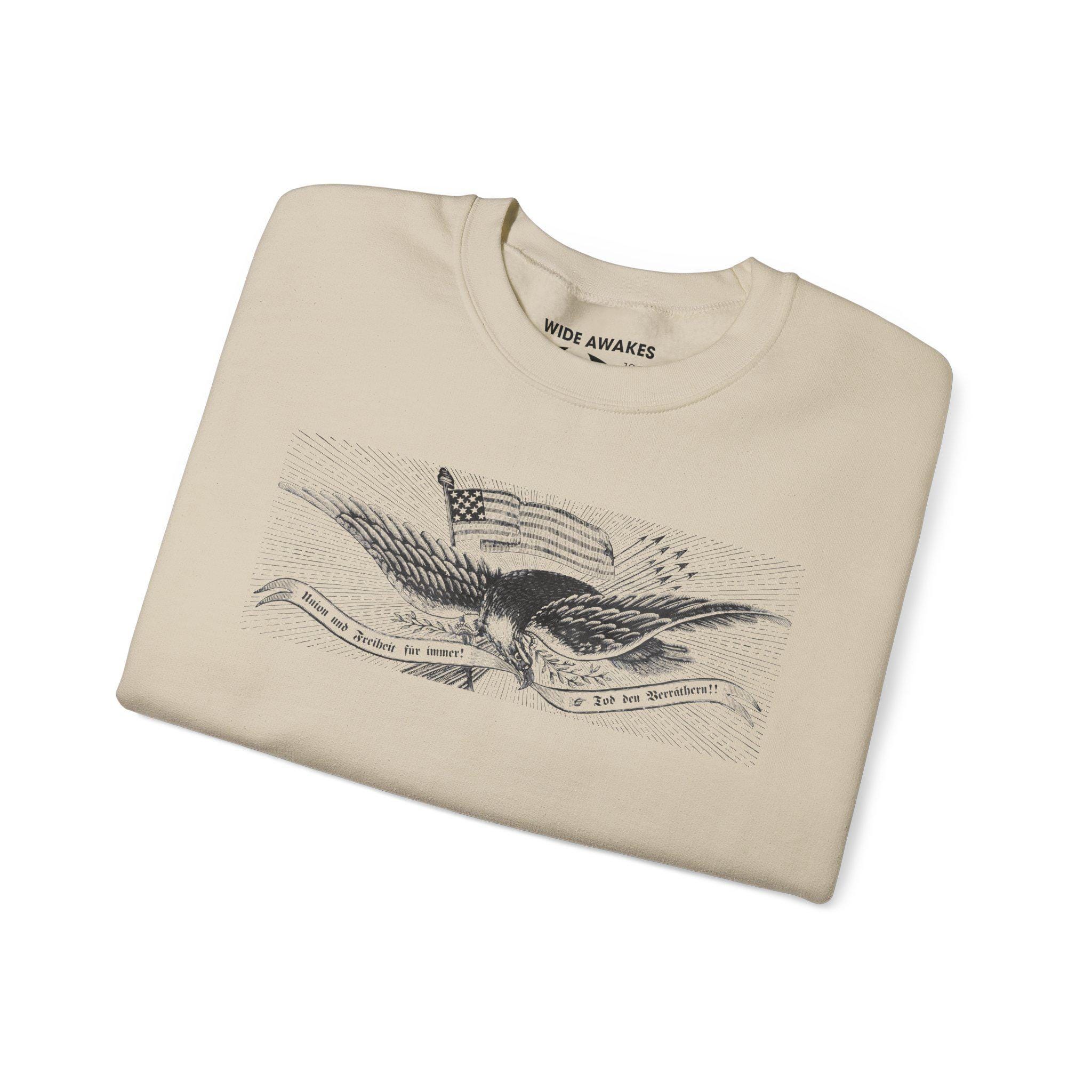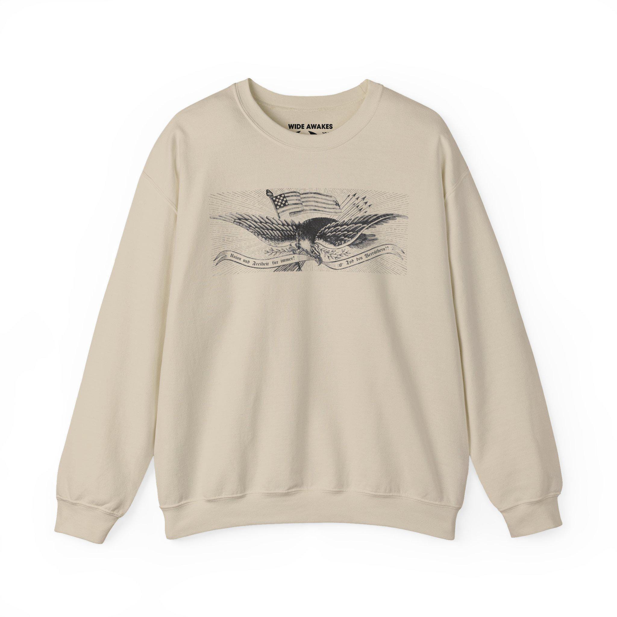 Stay warm this fall with a cozy crewneck sweatshirt that tells a powerful story of immigrant patriotism and radical politics. The design is the central eagle illustration from a rare German-language Civil War recruitment poster. The eagle carries a flag topped with a revolutionary Phrygian cap and a banner proclaiming "Union und Freiheit für Immer! Tod den Verräthern!" This imagery speaks directly to the "Forty-Eighter" Germans who saw the Union cause as a continuation of their own fight for freedom. It's a comfortable and deeply meaningful piece of wearable history.