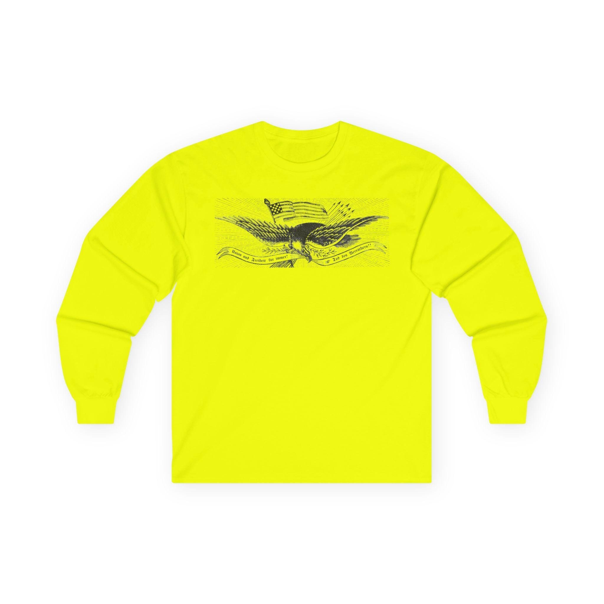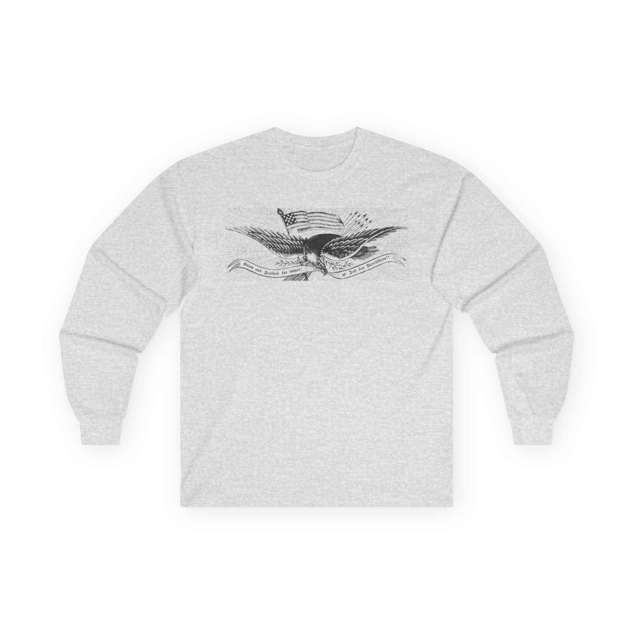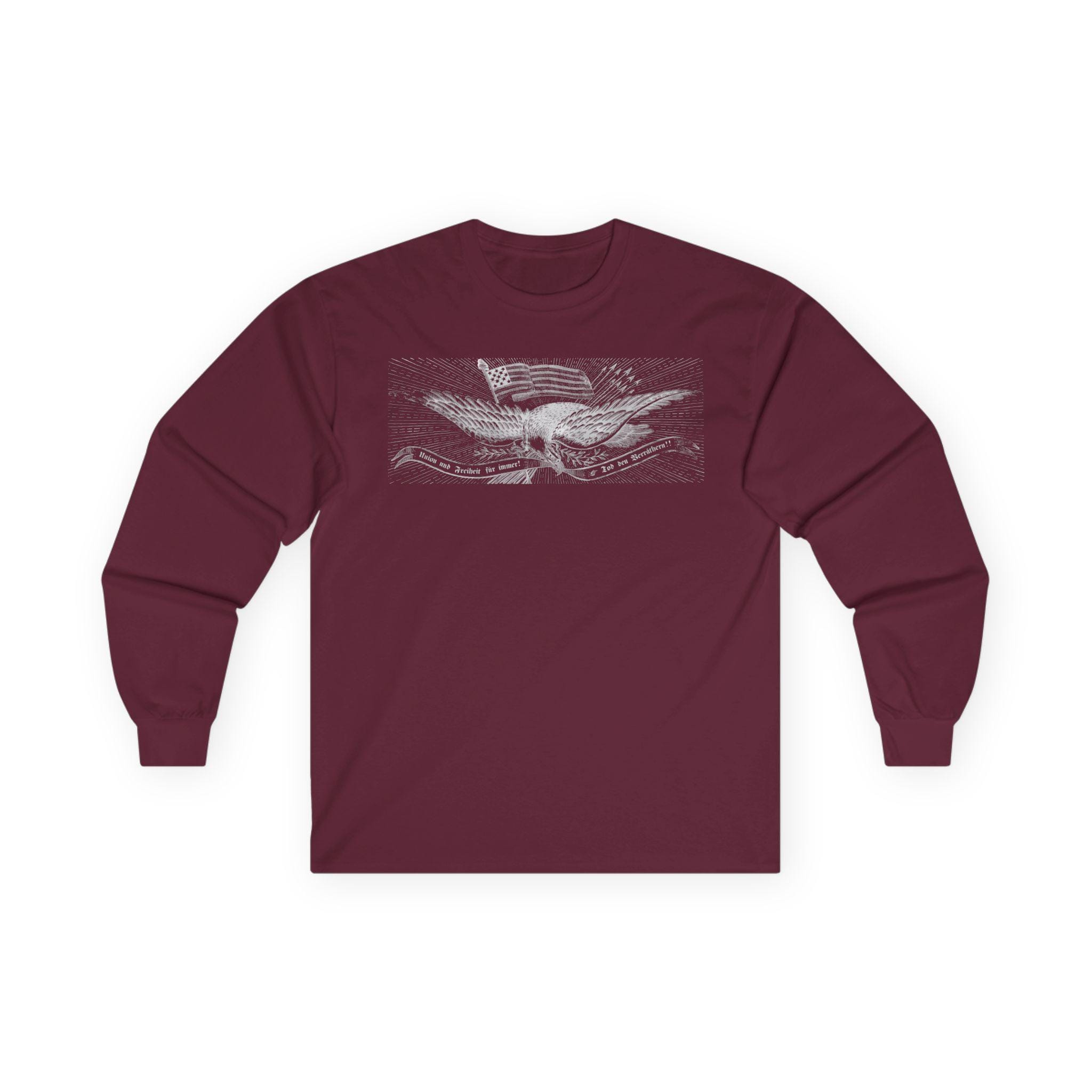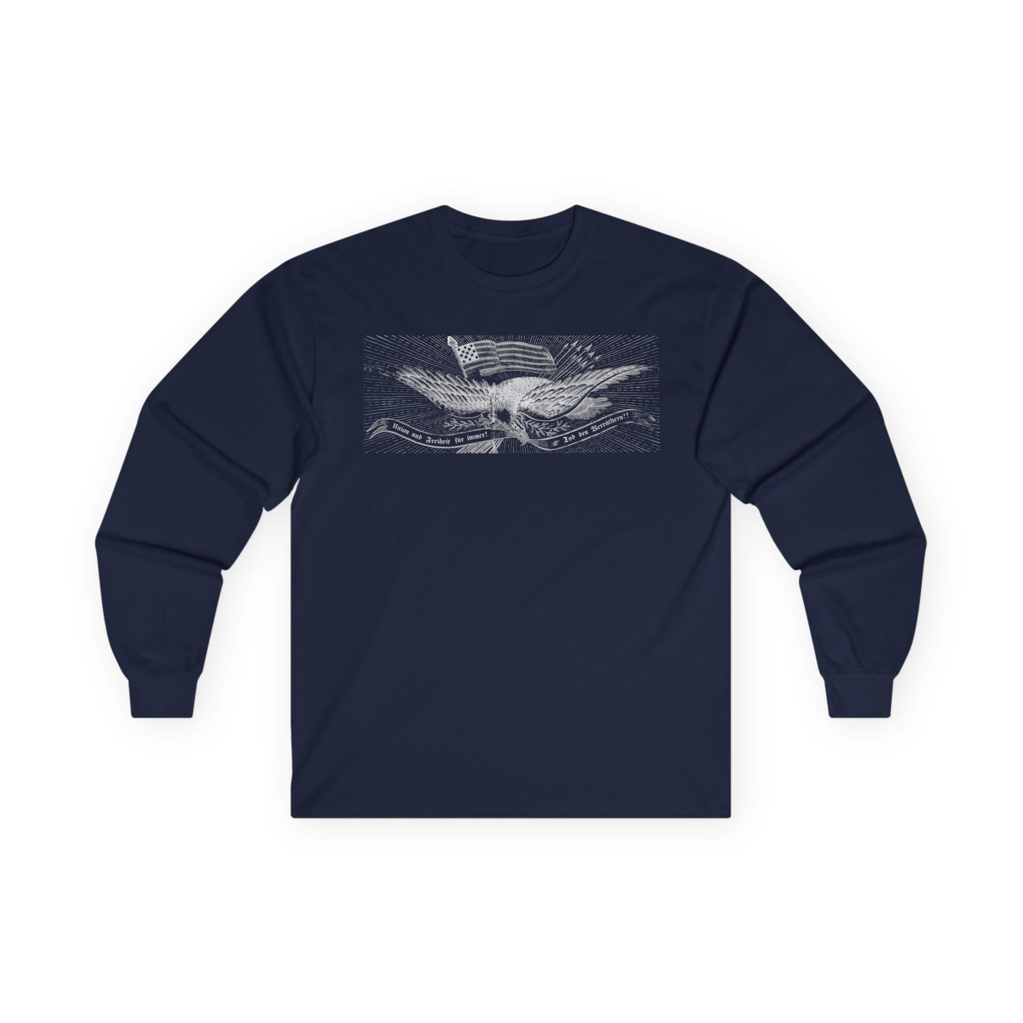 This comfortable longsleeve tee is the perfect layer for fall and a fantastic piece of unique American history. The design is the central eagle illustration from a German-language Civil War recruitment poster. It features the revolutionary Phrygian cap atop the flag and the fierce motto "Union und Freiheit für Immer! Tod den Verräthern!" in classic Fraktur script. It’s a stylish and intelligent piece of apparel celebrating immigrant patriotism and the radical roots of the Union cause.