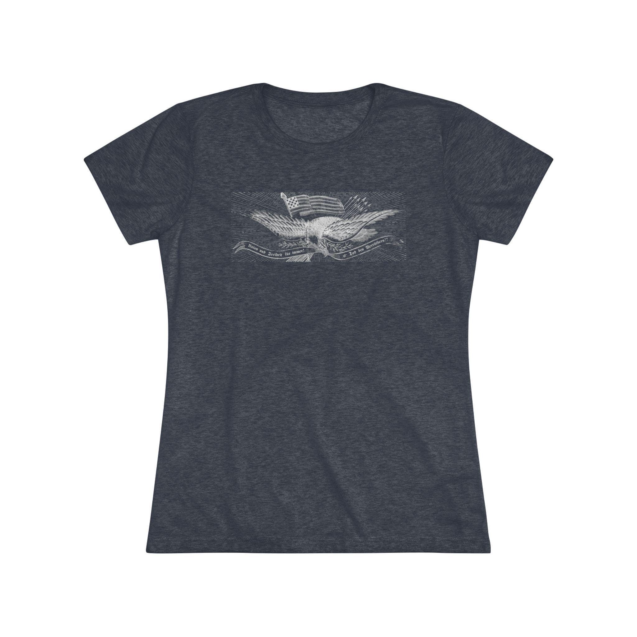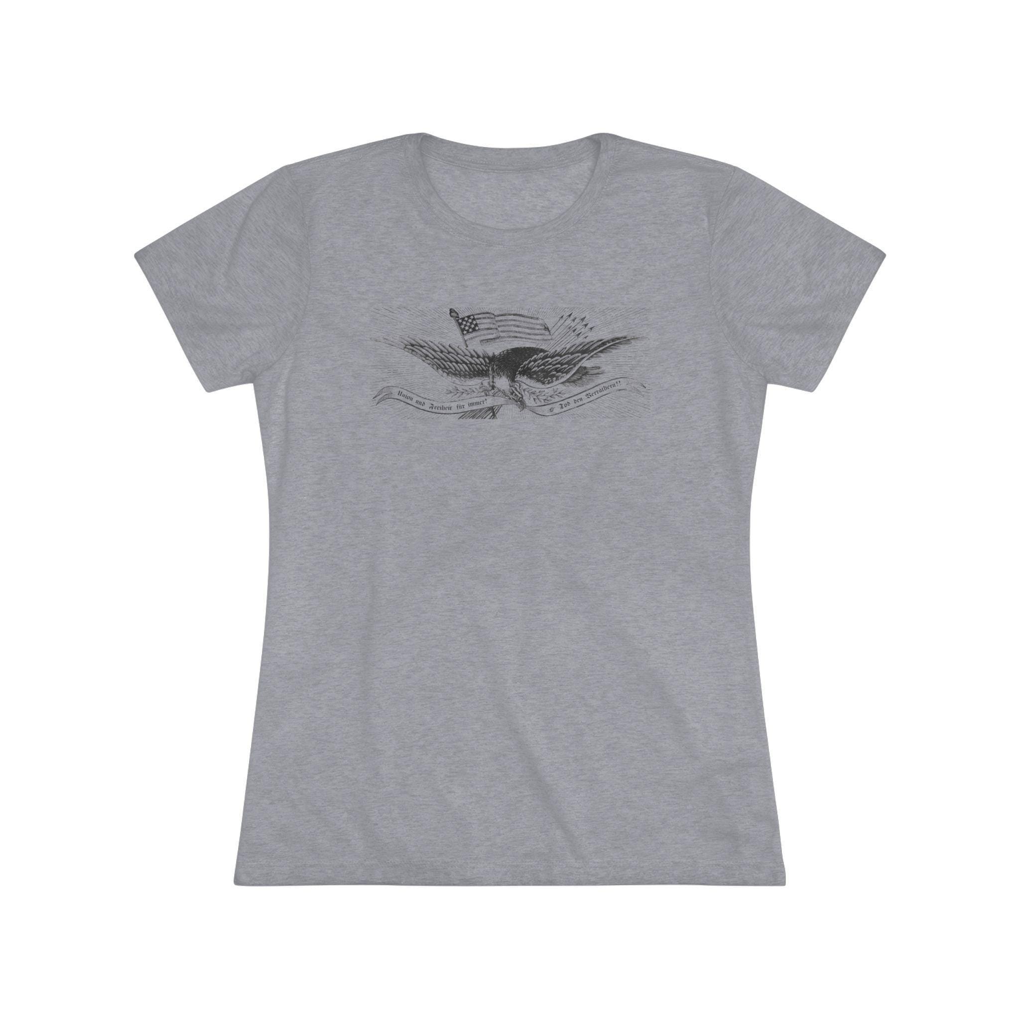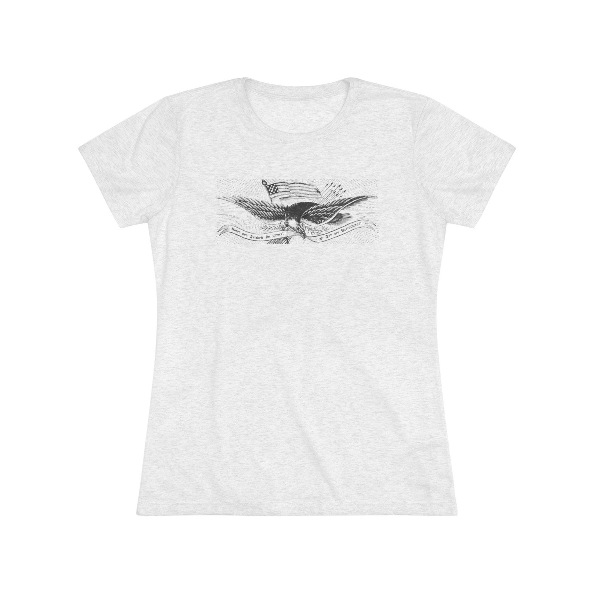 This women's t-shirt combines a powerful piece of immigrant and radical history with a comfortable and stylish fit. The design is the patriotic eagle from a rare German-language Civil War recruitment poster. It features the revolutionary Phrygian cap and the uncompromising Fraktur motto "Union und Freiheit für Immer! Tod den Verräthern!"—a message deeply resonant with the "Forty-Eighter" German immigrants who fled oppression. This soft, contoured tee is a perfect way to wear a piece of profound history that speaks to the diverse coalition that fought for the Union.