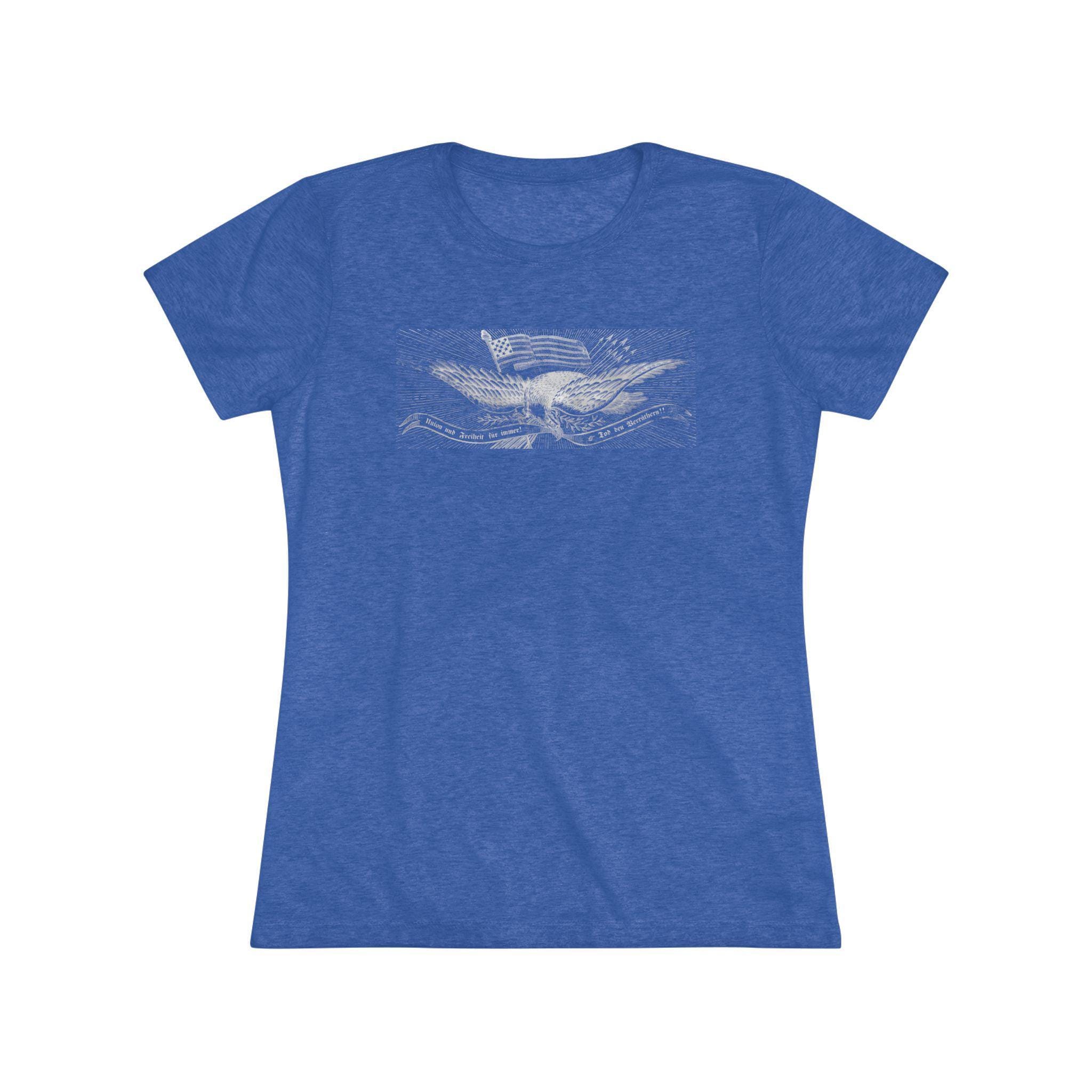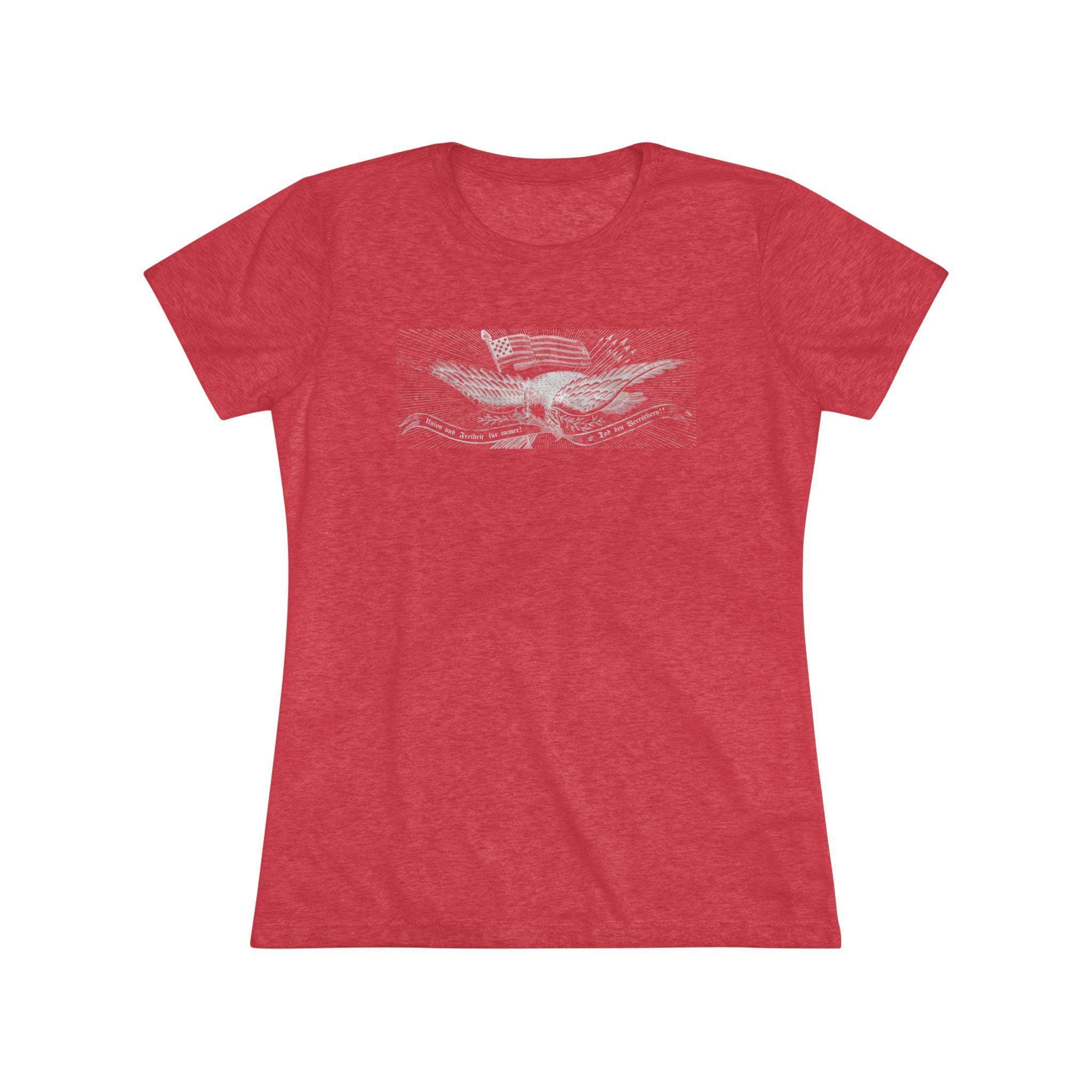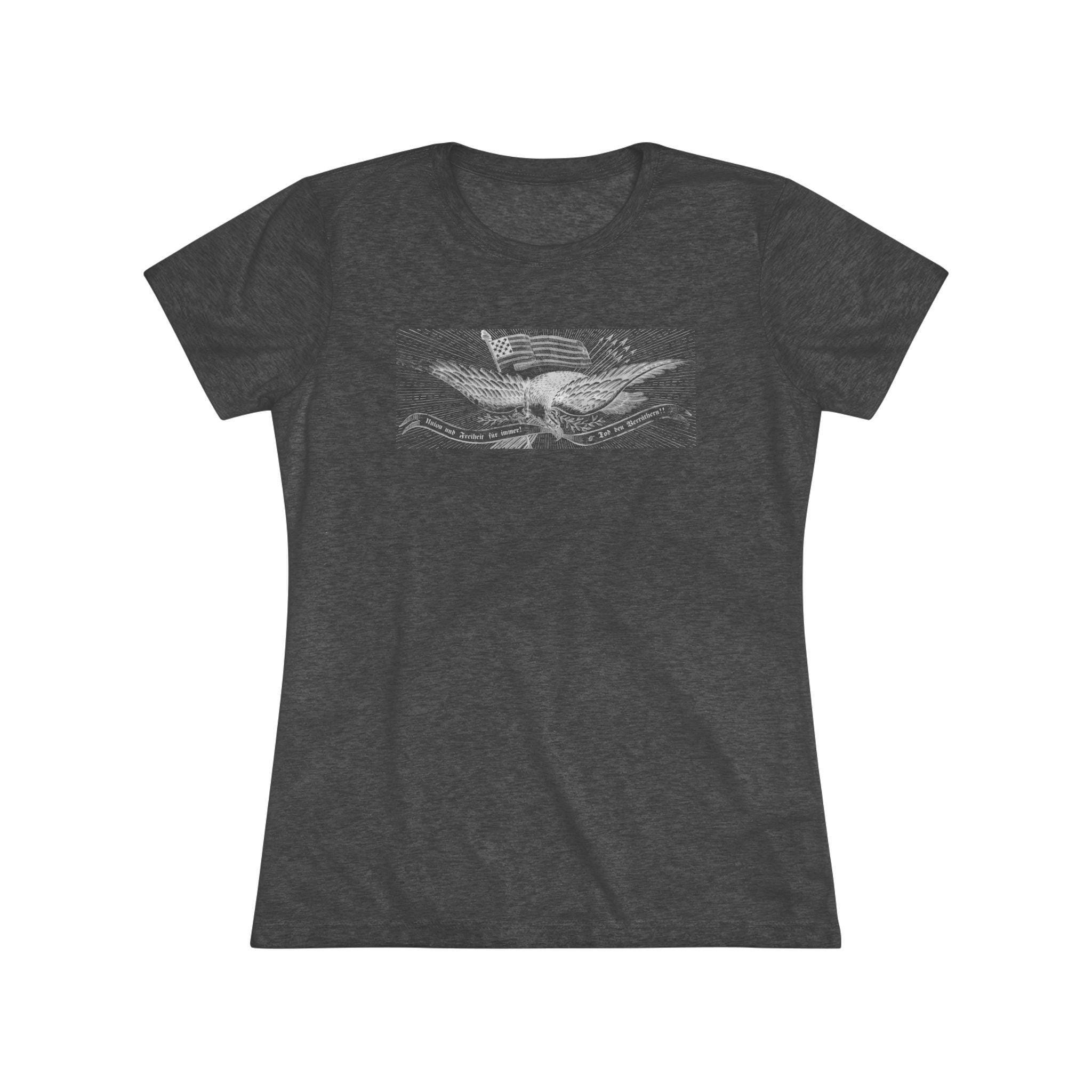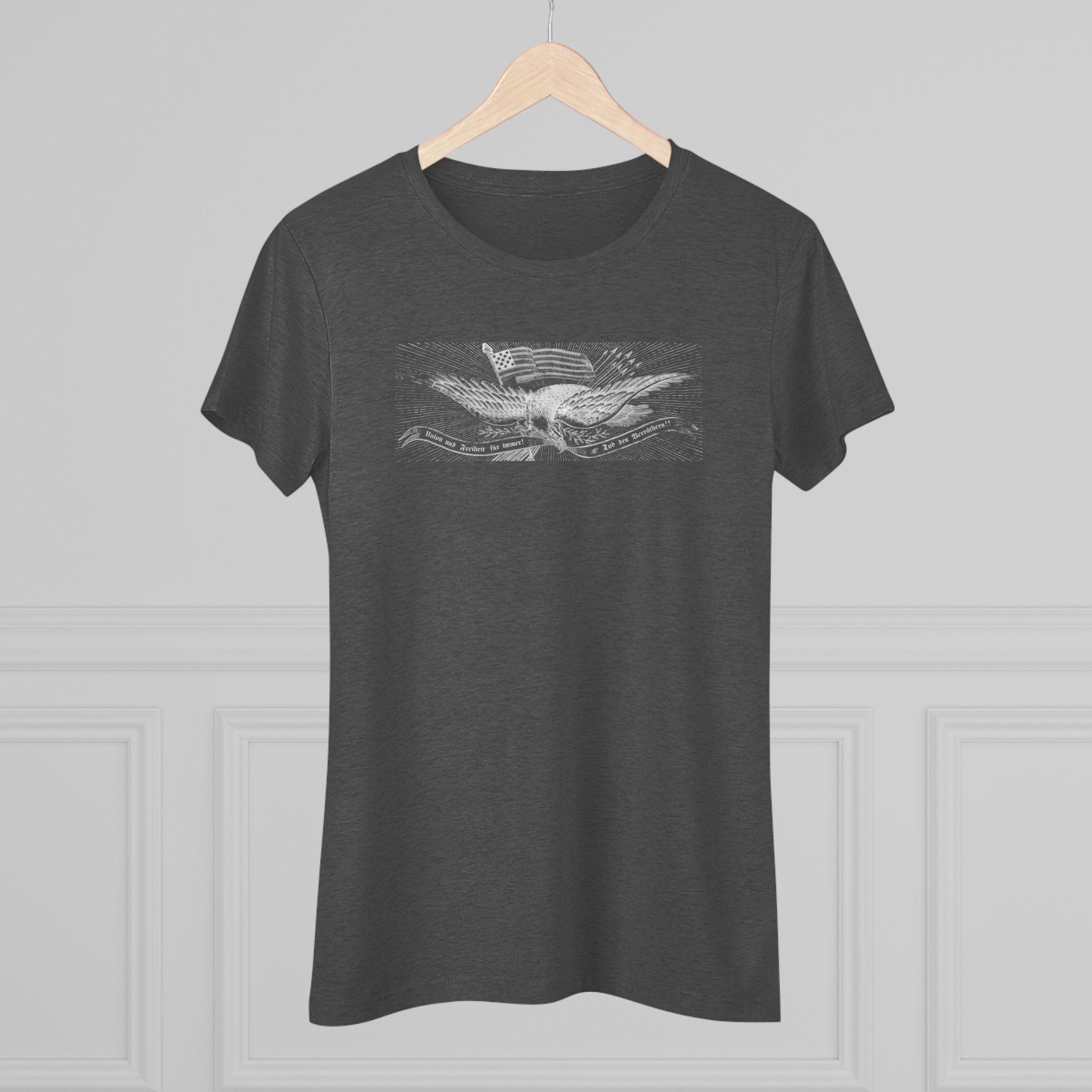 This women's t-shirt combines a powerful piece of immigrant and radical history with a comfortable and stylish fit. The design is the patriotic eagle from a rare German-language Civil War recruitment poster. It features the revolutionary Phrygian cap and the uncompromising Fraktur motto "Union und Freiheit für Immer! Tod den Verräthern!"—a message deeply resonant with the "Forty-Eighter" German immigrants who fled oppression. This soft, contoured tee is a perfect way to wear a piece of profound history that speaks to the diverse coalition that fought for the Union.