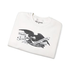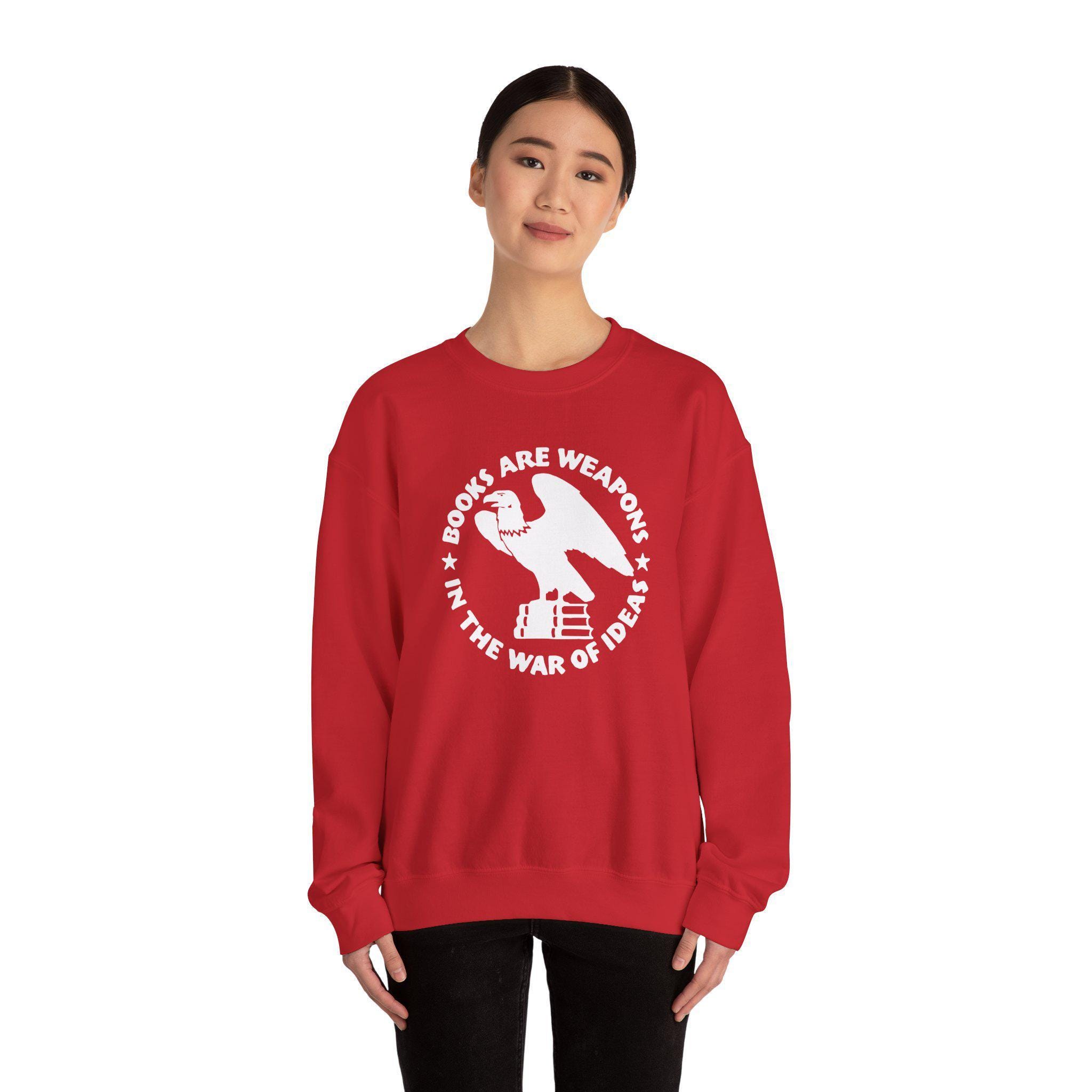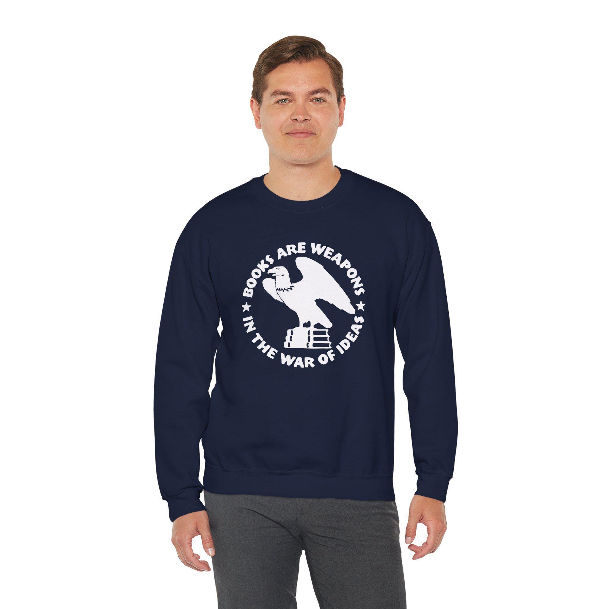 Stay warm this fall with a cozy crewneck sweatshirt that carries a powerful message about the enduring power of knowledge. The design is a restored emblem from the Brooklyn Public Library, originally used during WWII. It features an eagle perched on books, encircled by the declaration: "BOOKS ARE WEAPONS IN THE WAR OF IDEAS." It's a comfortable and deeply meaningful piece for librarians, teachers, students, and anyone who believes in the vital role of books and ideas in defending freedom.