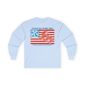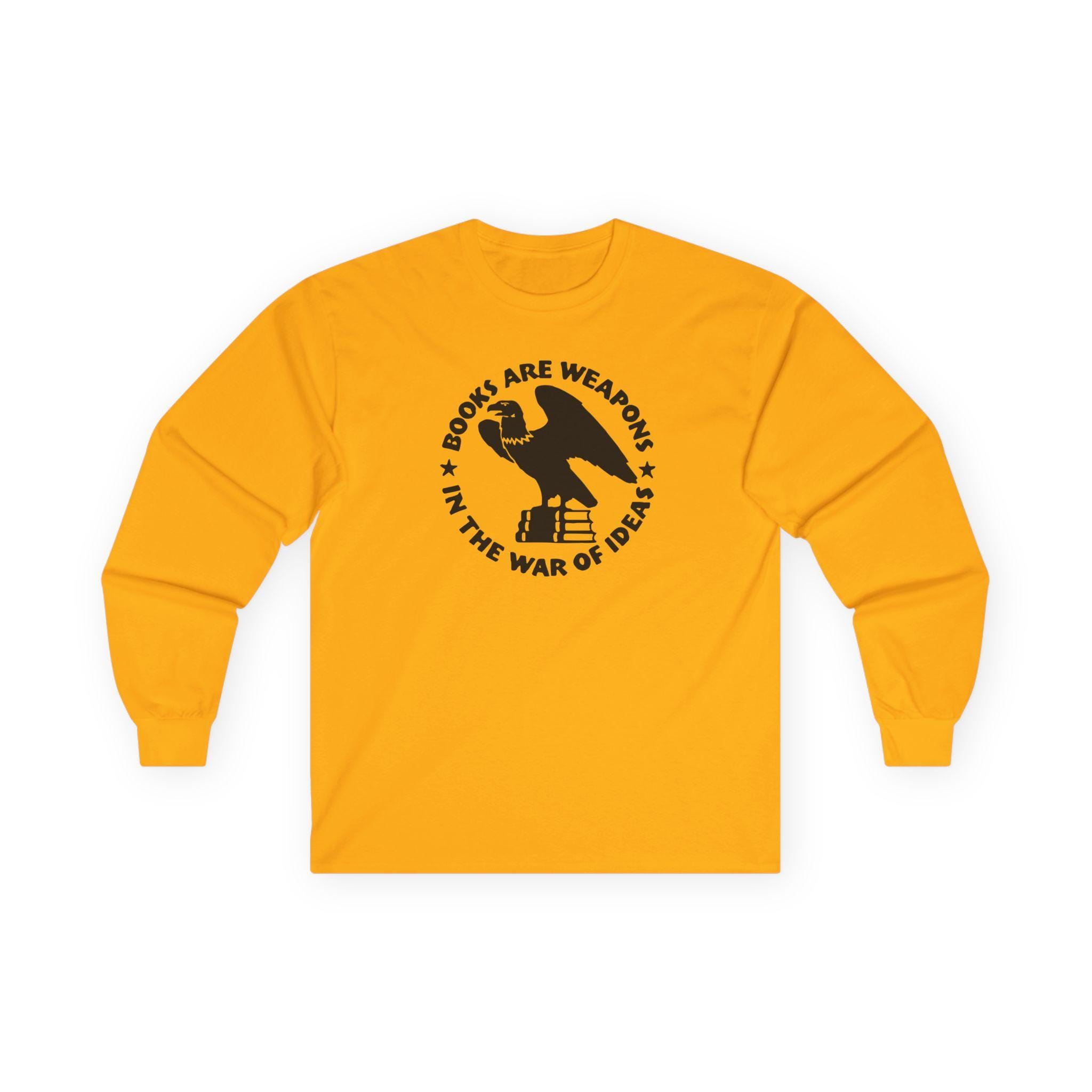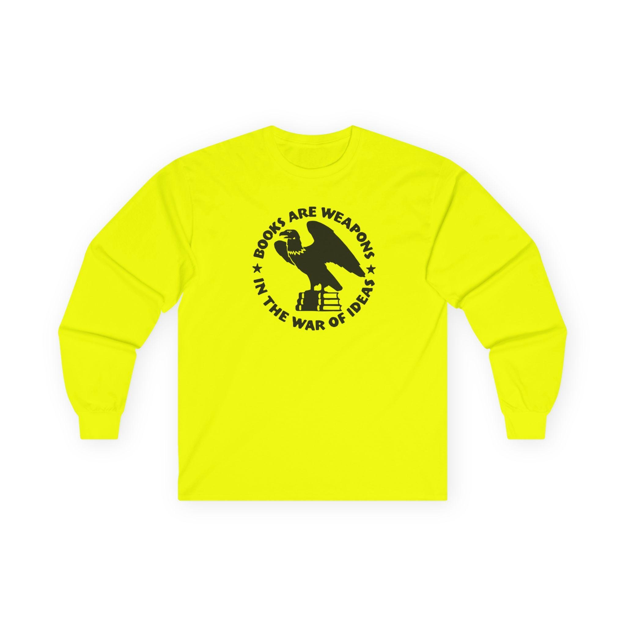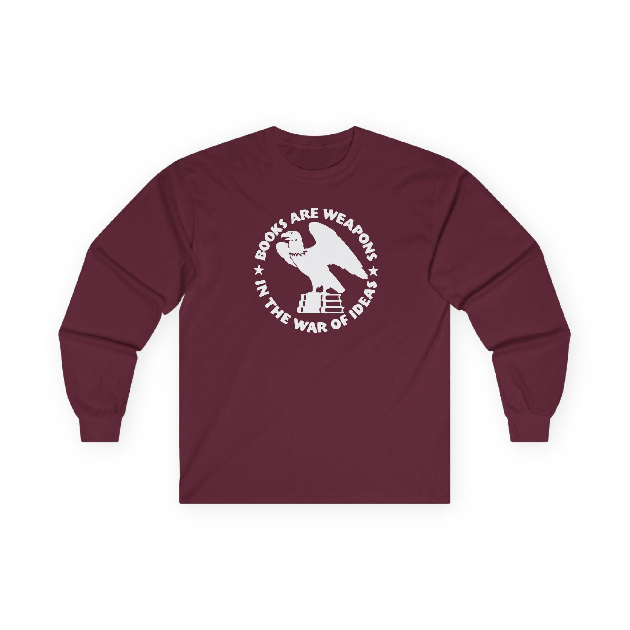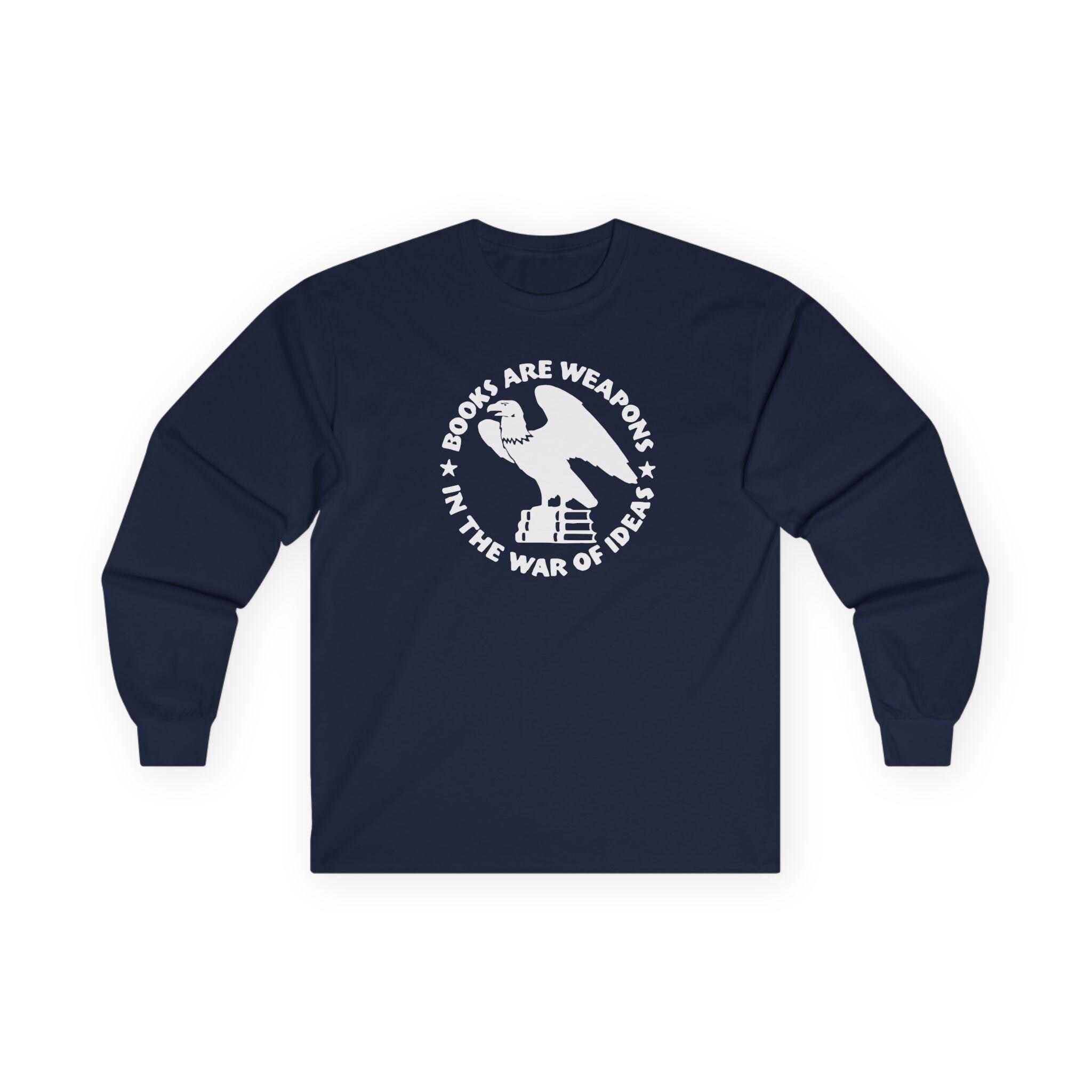 This comfortable longsleeve tee is the perfect layer for fall and carries a profound historical message. The design is a restored emblem from the Brooklyn Public Library, originally used during WWII and the immediate postwar period. It depicts an eagle atop a stack of books, encircled by the bold statement: "BOOKS ARE WEAPONS IN THE WAR OF IDEAS." It’s a stylish and intelligent piece of apparel for anyone who champions intellectual freedom and believes in the power of the written word.