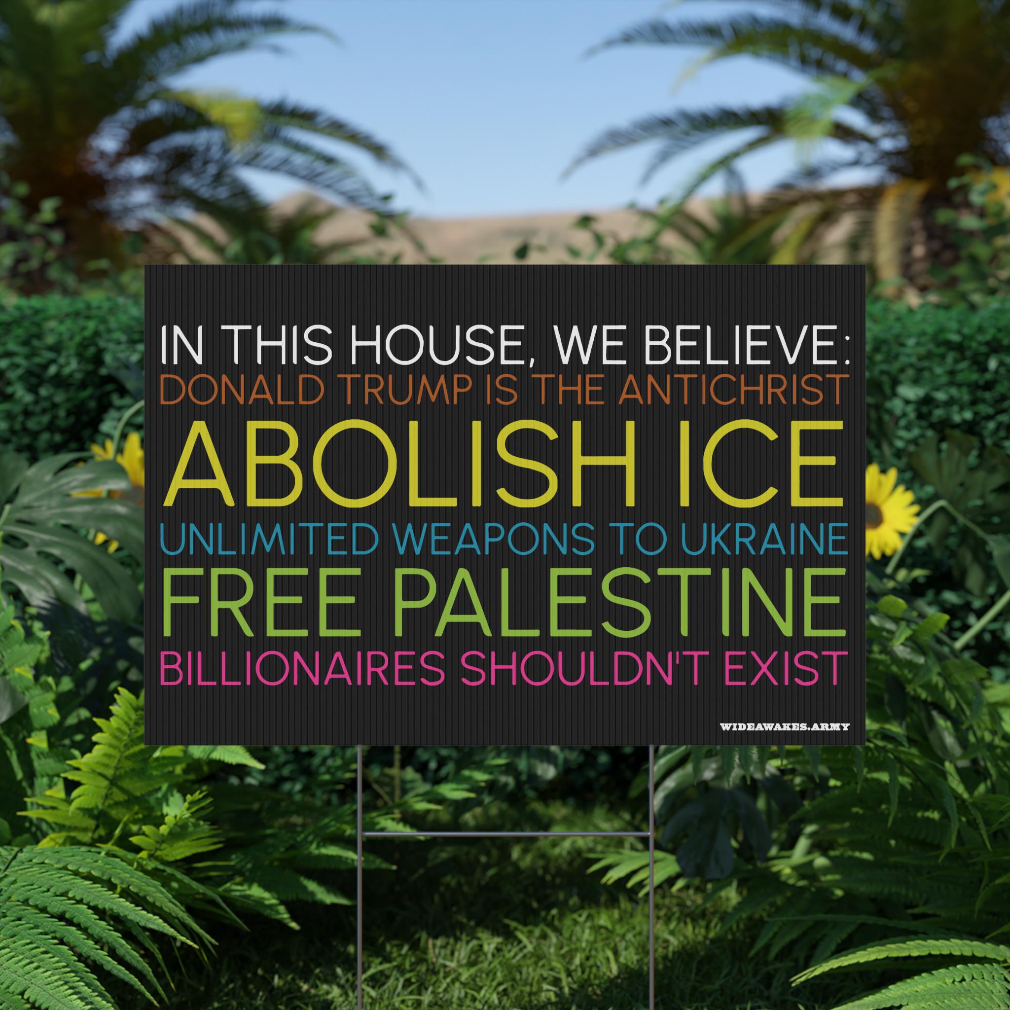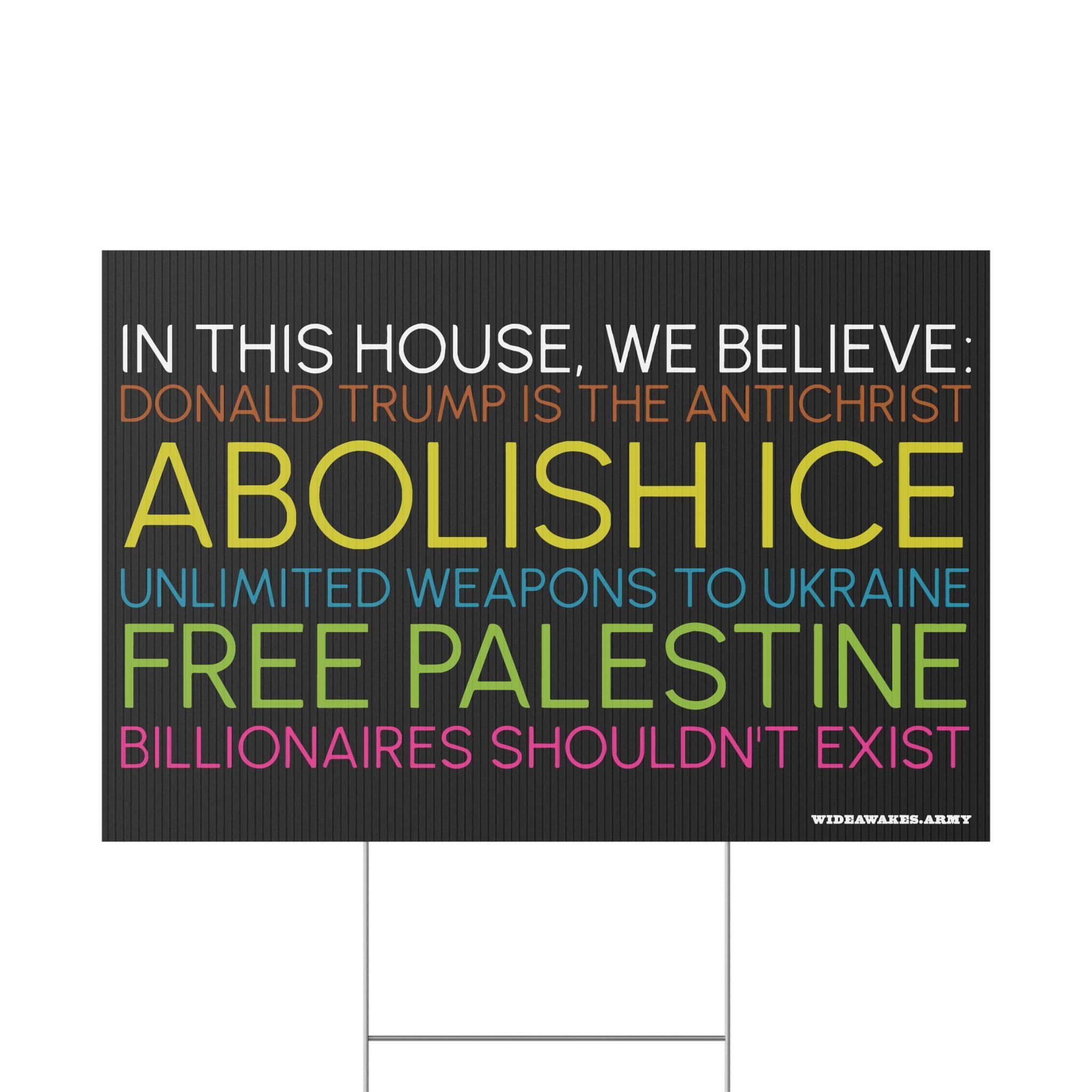 It's a brilliant piece of political satire that perfectly captures how the abuses of recent years have radicalized the rank-and-file. Made of durable, weatherproof corrugated plastic, this sign is ready to make a statement in your neighborhood.