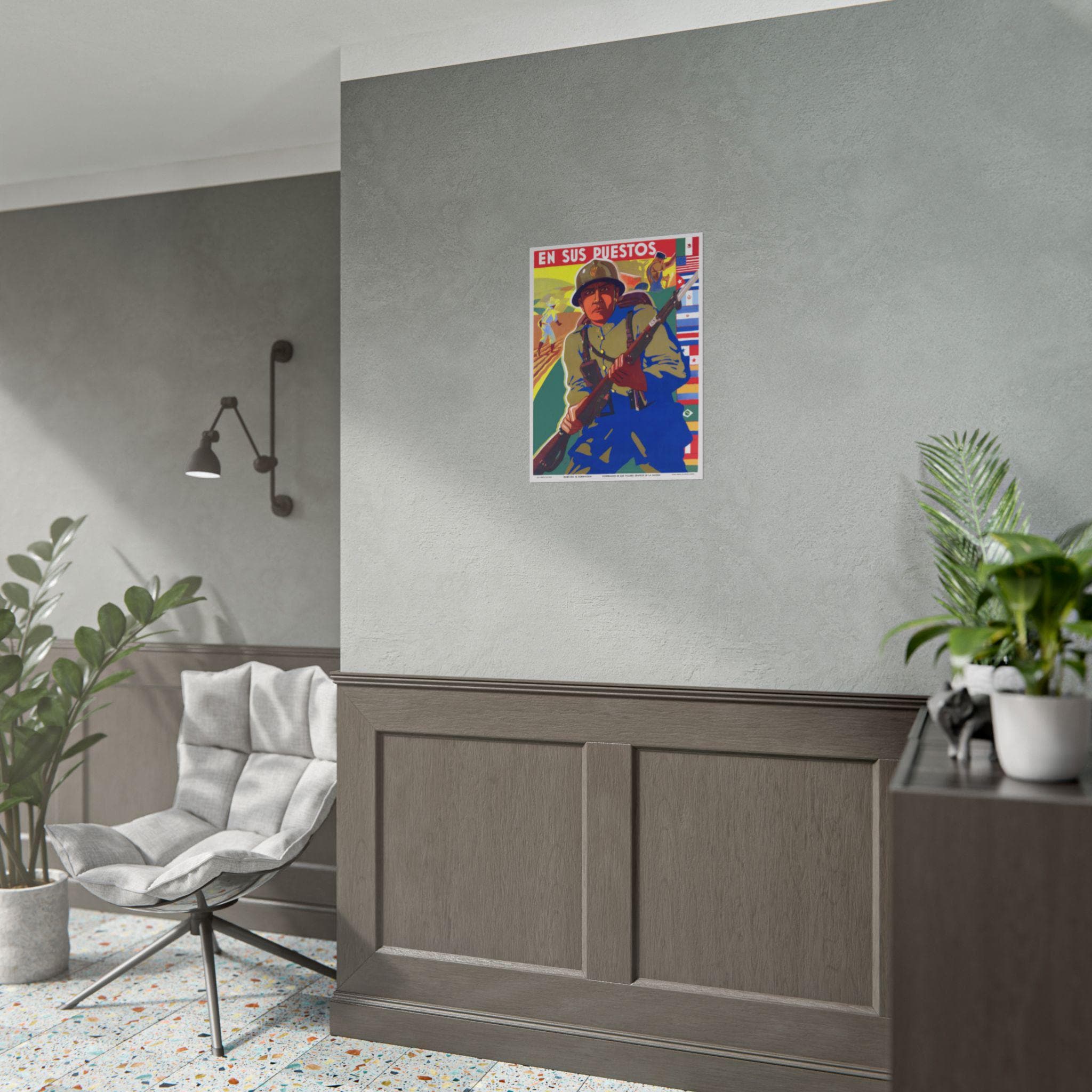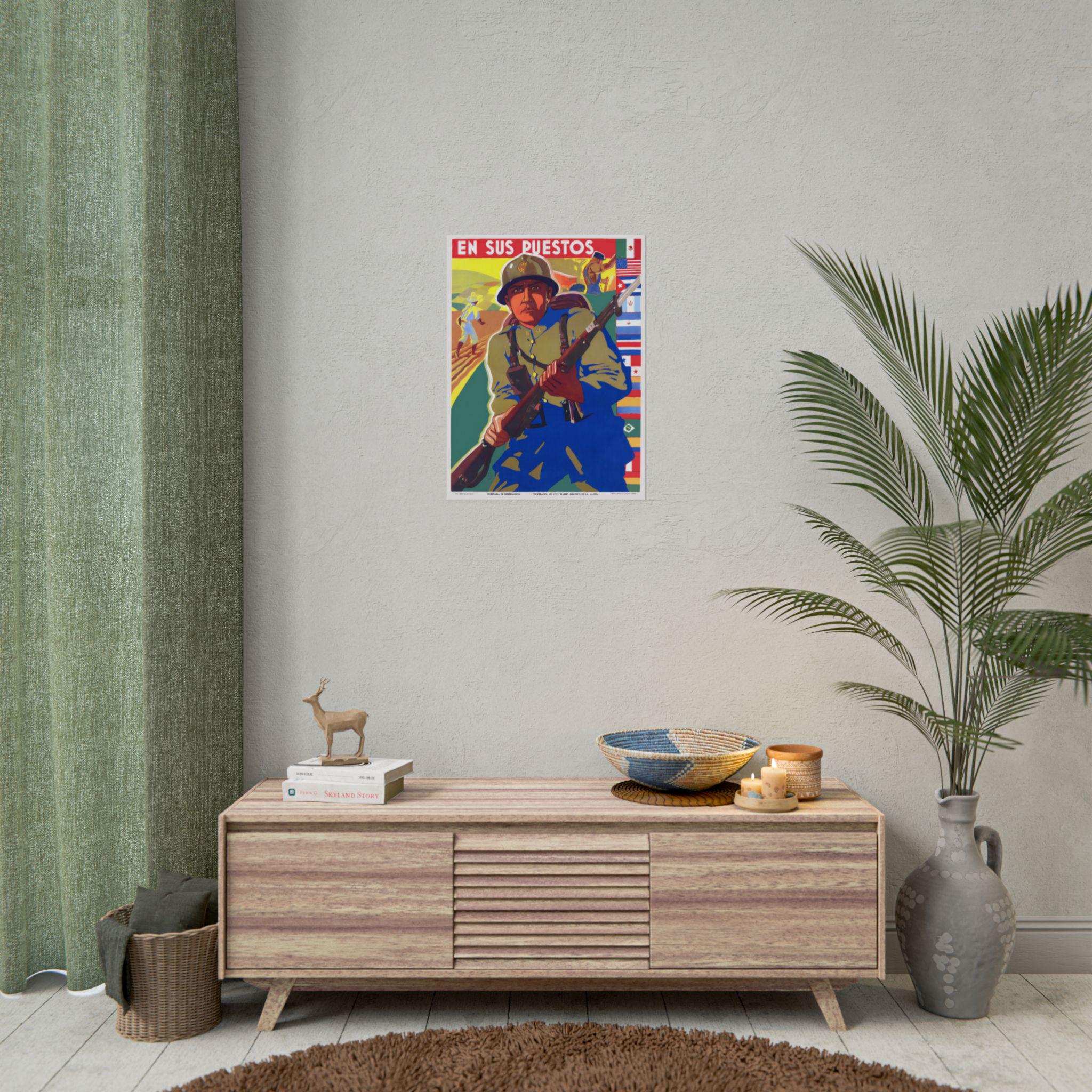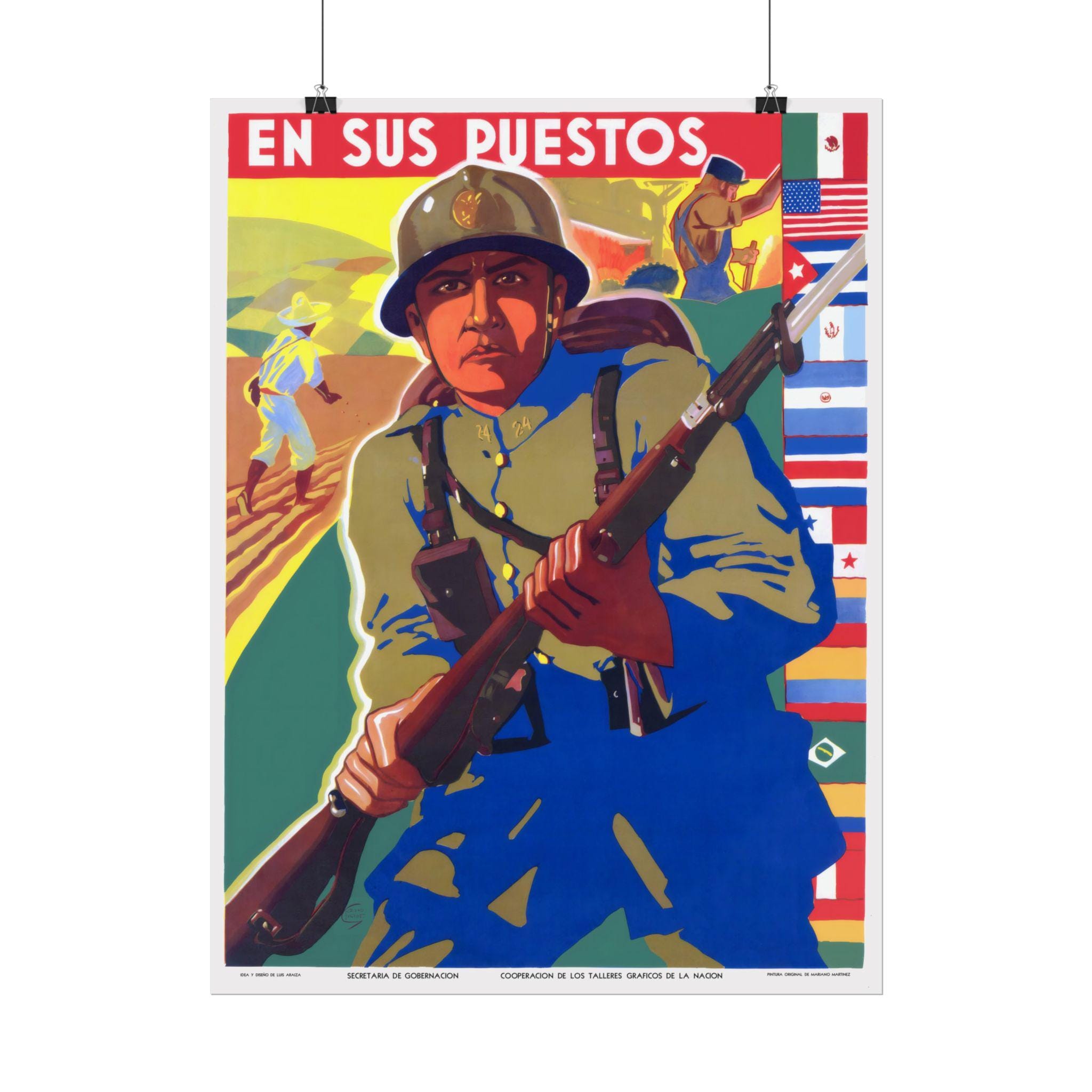This high-quality poster is our own original digital restoration of a vibrant 1940s propaganda piece by the artist Mariano Martinez. The artwork is a powerful call for a unified national effort, showing the three pillars of the war effort in one frame. In the foreground, a determined Mexican soldier stands ready with his rifle. Behind him, the home front is represented by a steel mill worker at his station and a farmer sowing his fields. The simple, powerful declaration "EN SUS PUESTOS" ("To Your Stations") urges every citizen to do their part. The piece is also a stunning celebration of pan-American solidarity, with the right border featuring a beautiful stack of flags from the Allied Latin American nations, from Mexico and Brazil to the United States and Cuba.