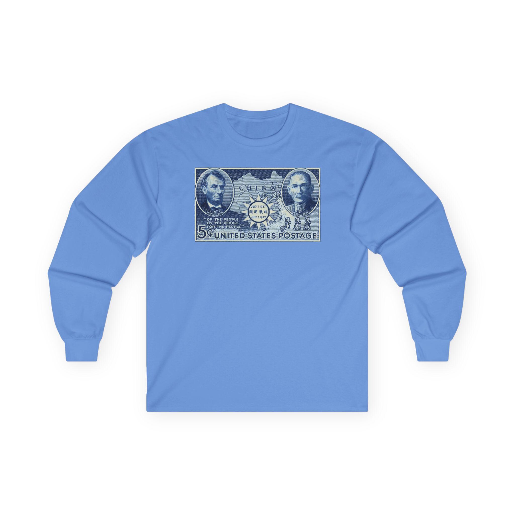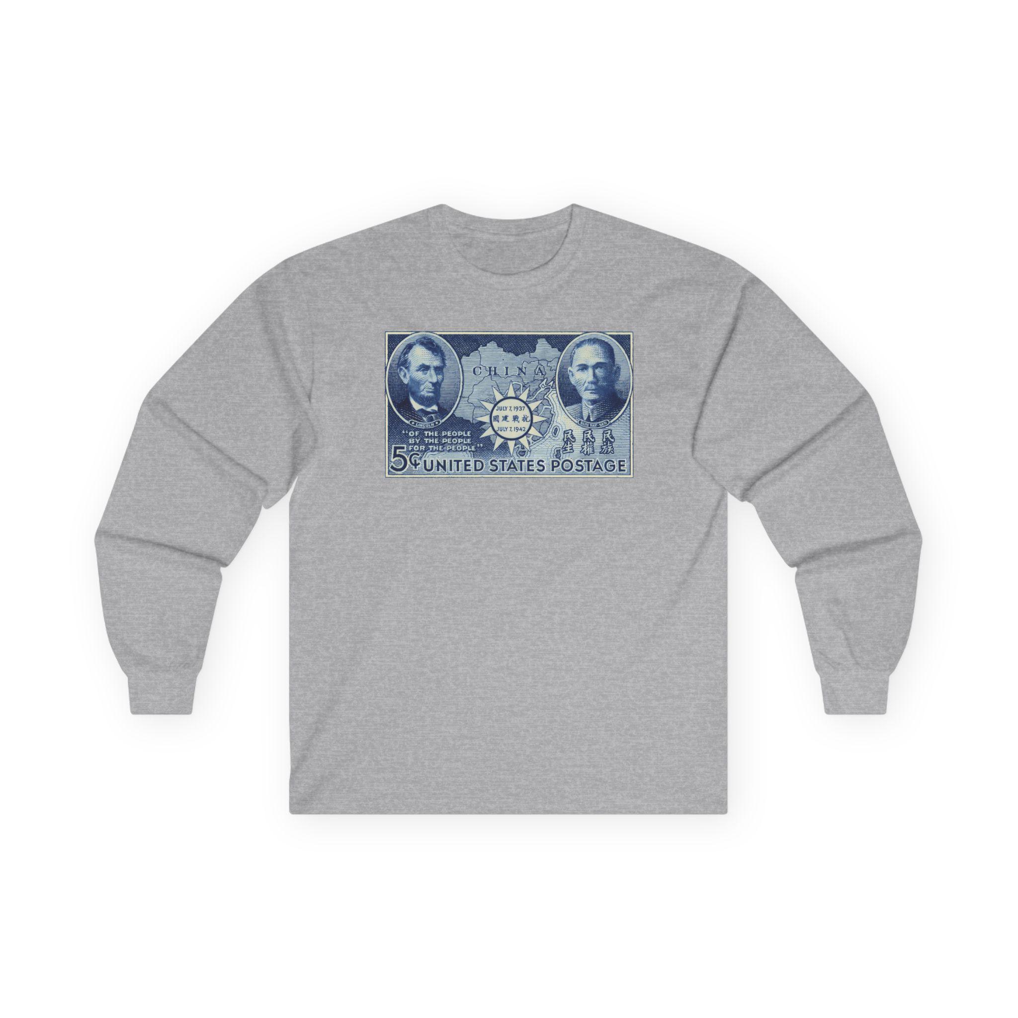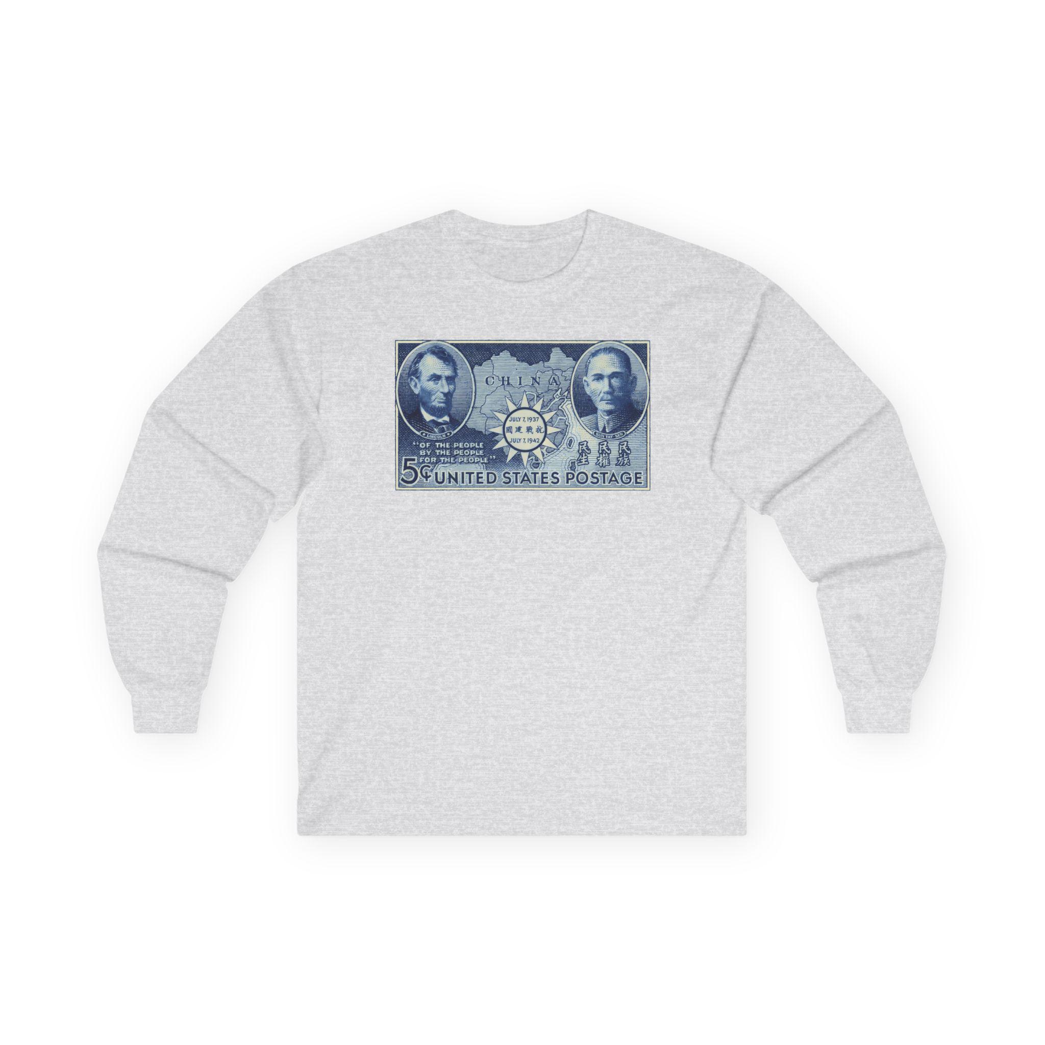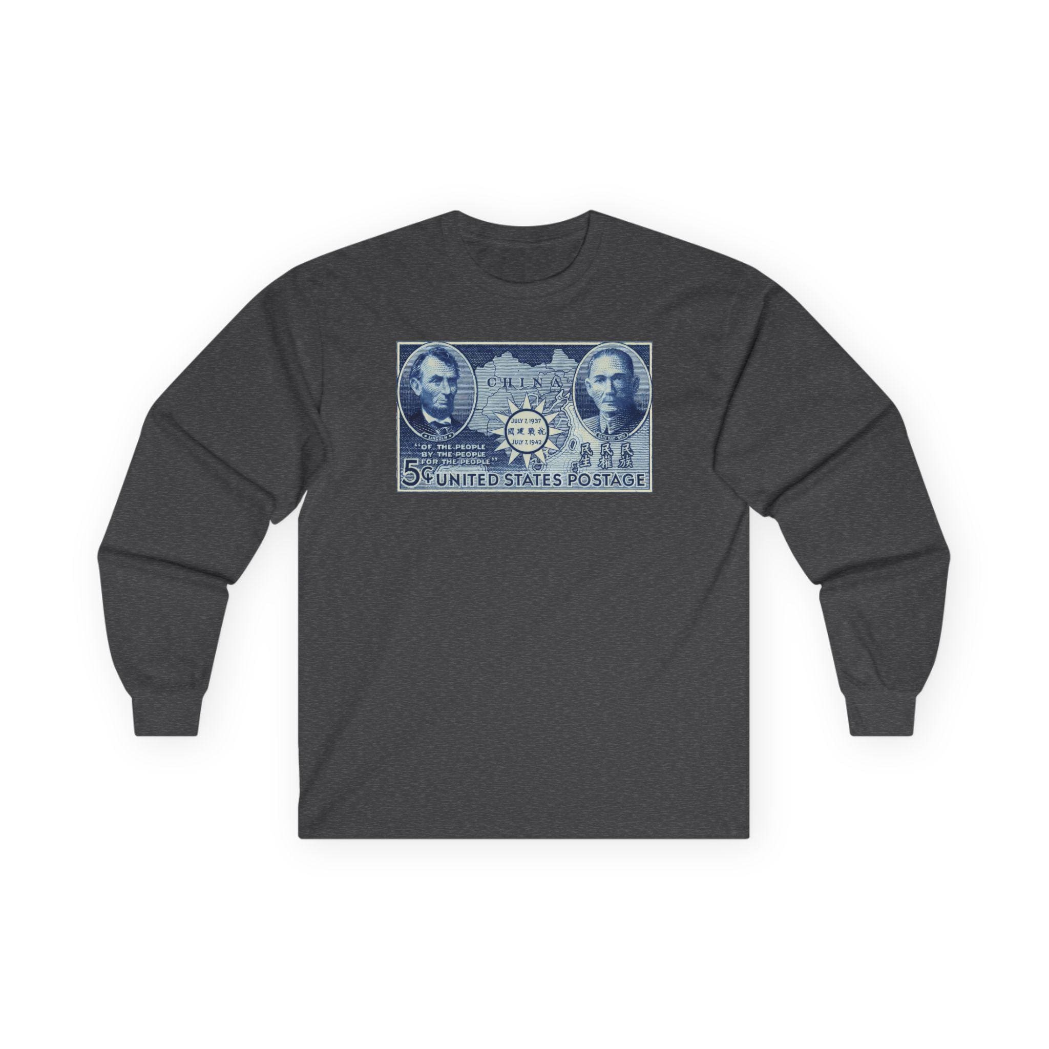 This comfortable longsleeve tee features a fascinating piece of WWII propaganda and art. The design is a restored 1942 postage stamp commemorating five years of Chinese resistance against Imperial Japan. The artwork is a stunning blue engraving that links the American Civil War to the Second World War through the figures of Abraham Lincoln and Sun Yat-sen. By placing Lincoln's Gettysburg Address quotes next to Sun's "Three Principles," the stamp argues for a shared legacy of democratic revolution. Perfect for layering, this shirt is a deep dive into international history.