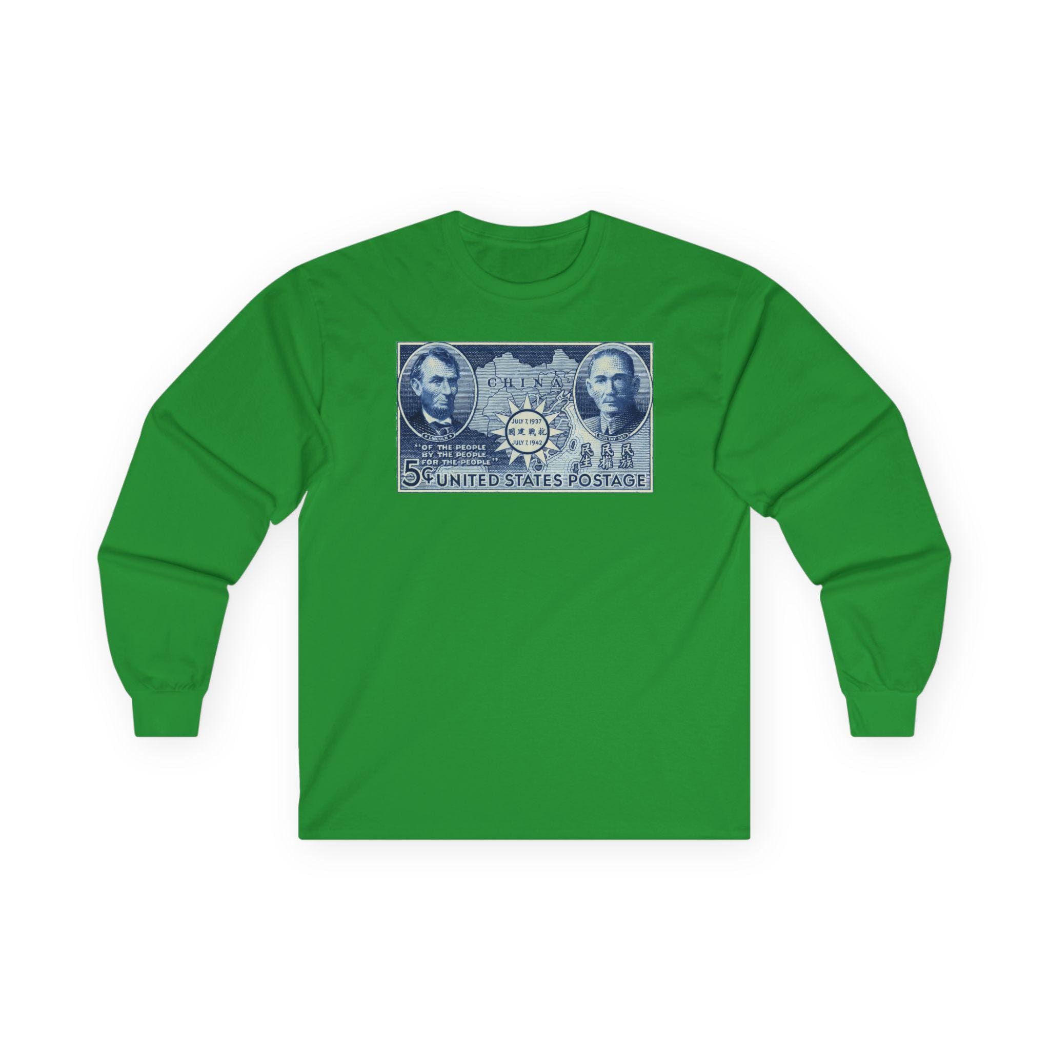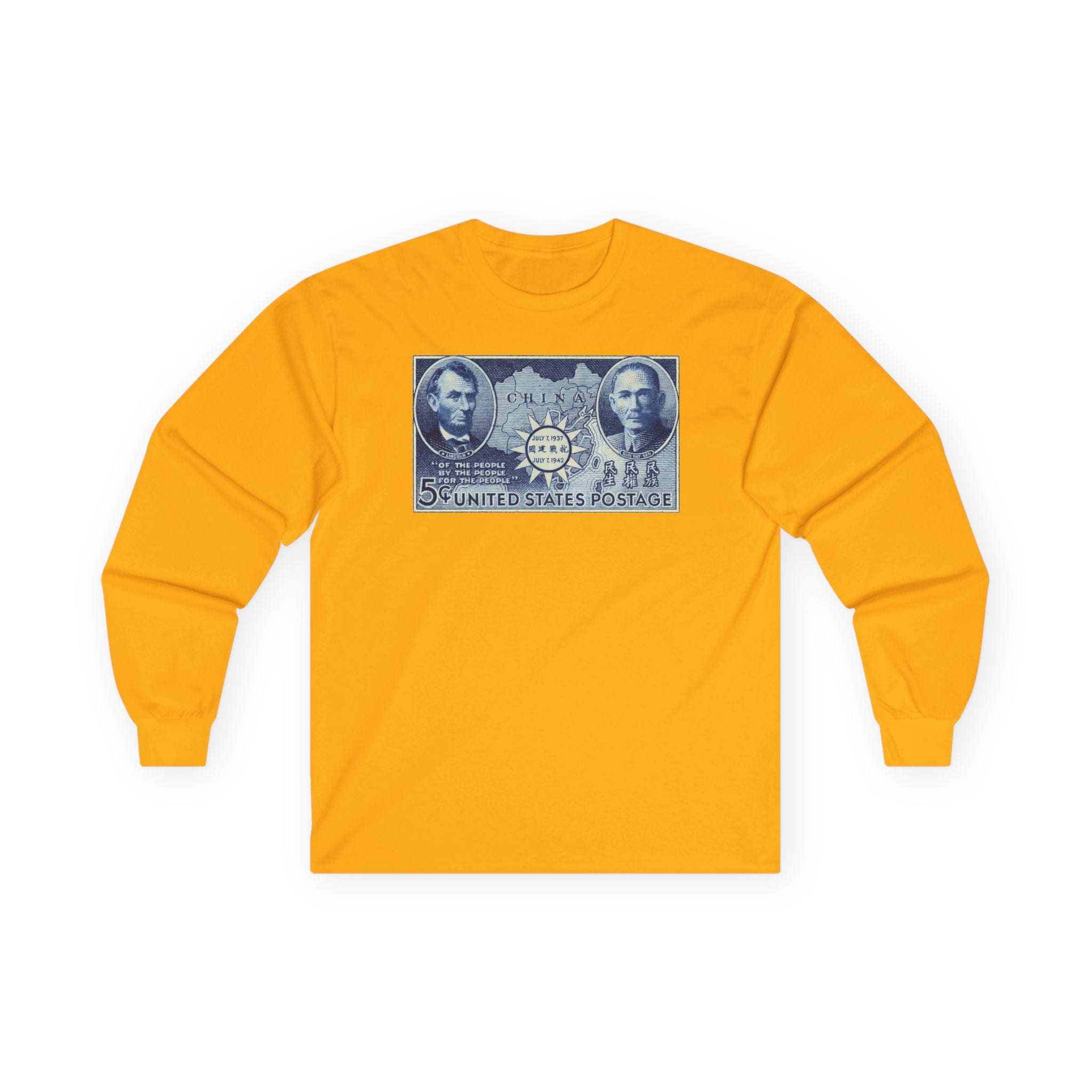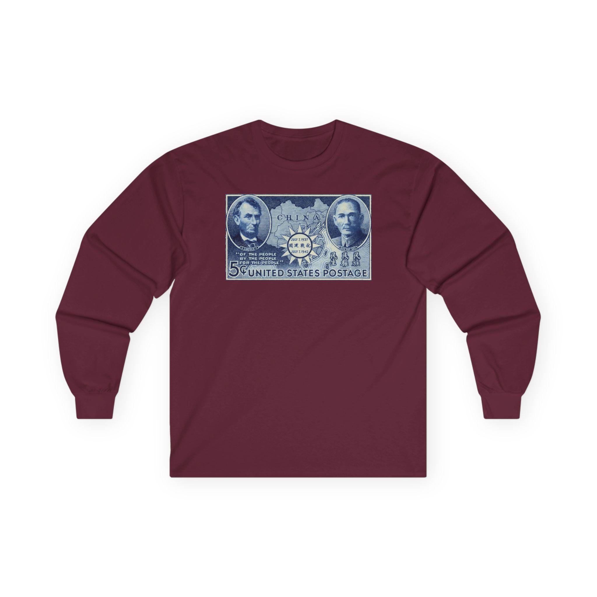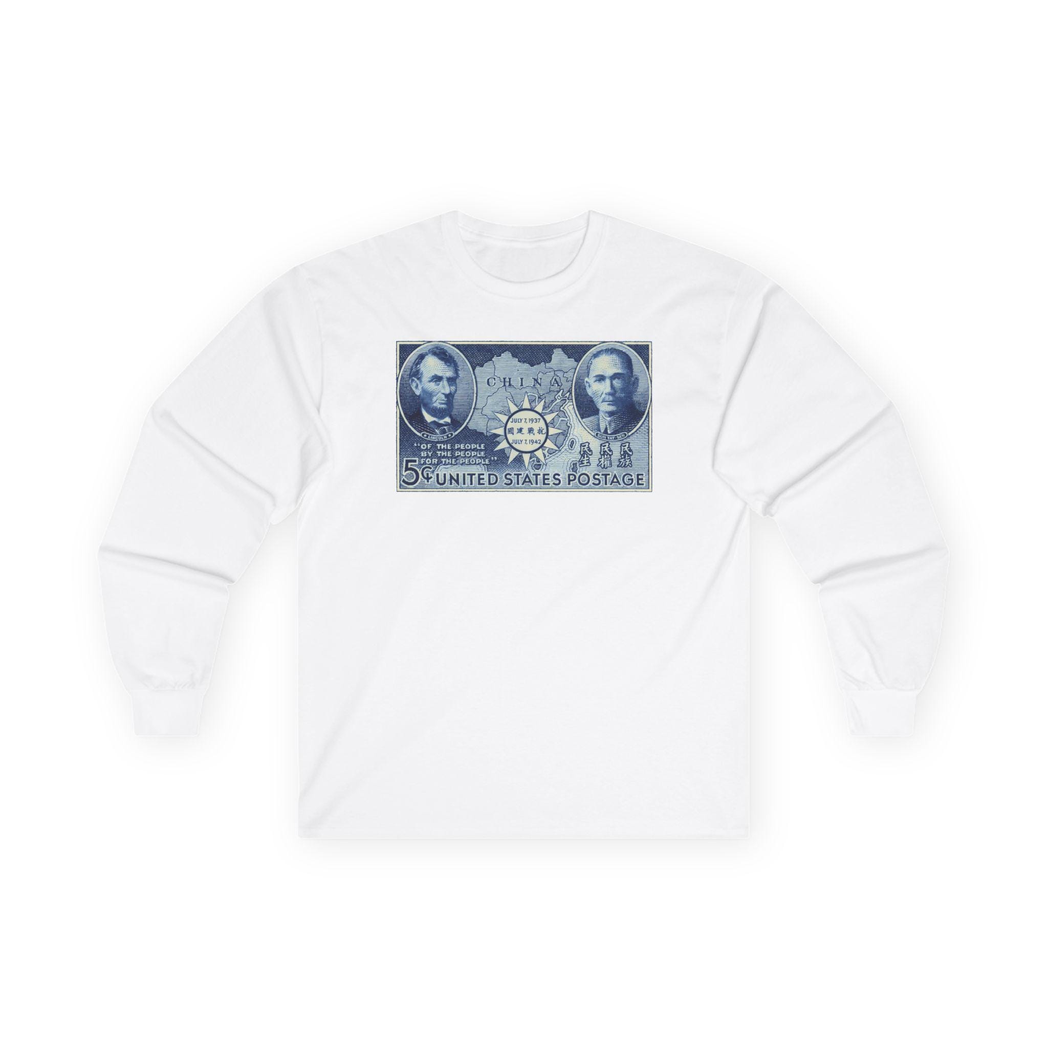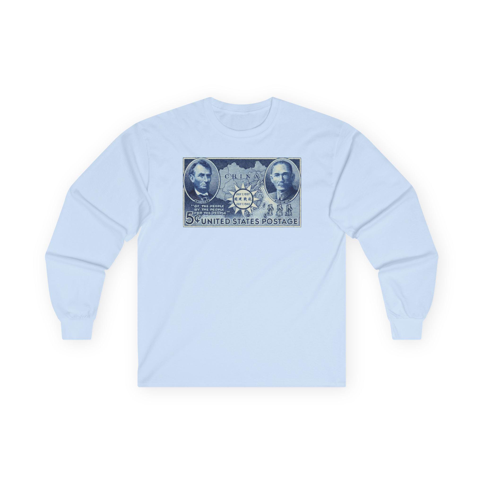 This comfortable longsleeve tee features a fascinating piece of WWII propaganda and art. The design is a restored 1942 postage stamp commemorating five years of Chinese resistance against Imperial Japan. The artwork is a stunning blue engraving that links the American Civil War to the Second World War through the figures of Abraham Lincoln and Sun Yat-sen. By placing Lincoln's Gettysburg Address quotes next to Sun's "Three Principles," the stamp argues for a shared legacy of democratic revolution. Perfect for layering, this shirt is a deep dive into international history.
