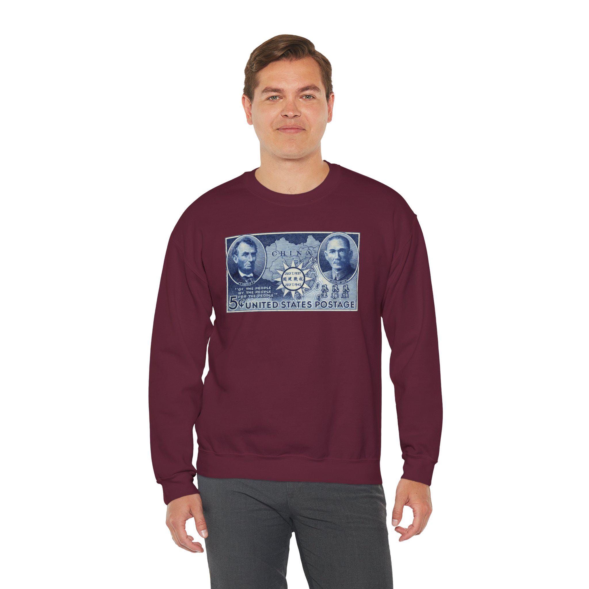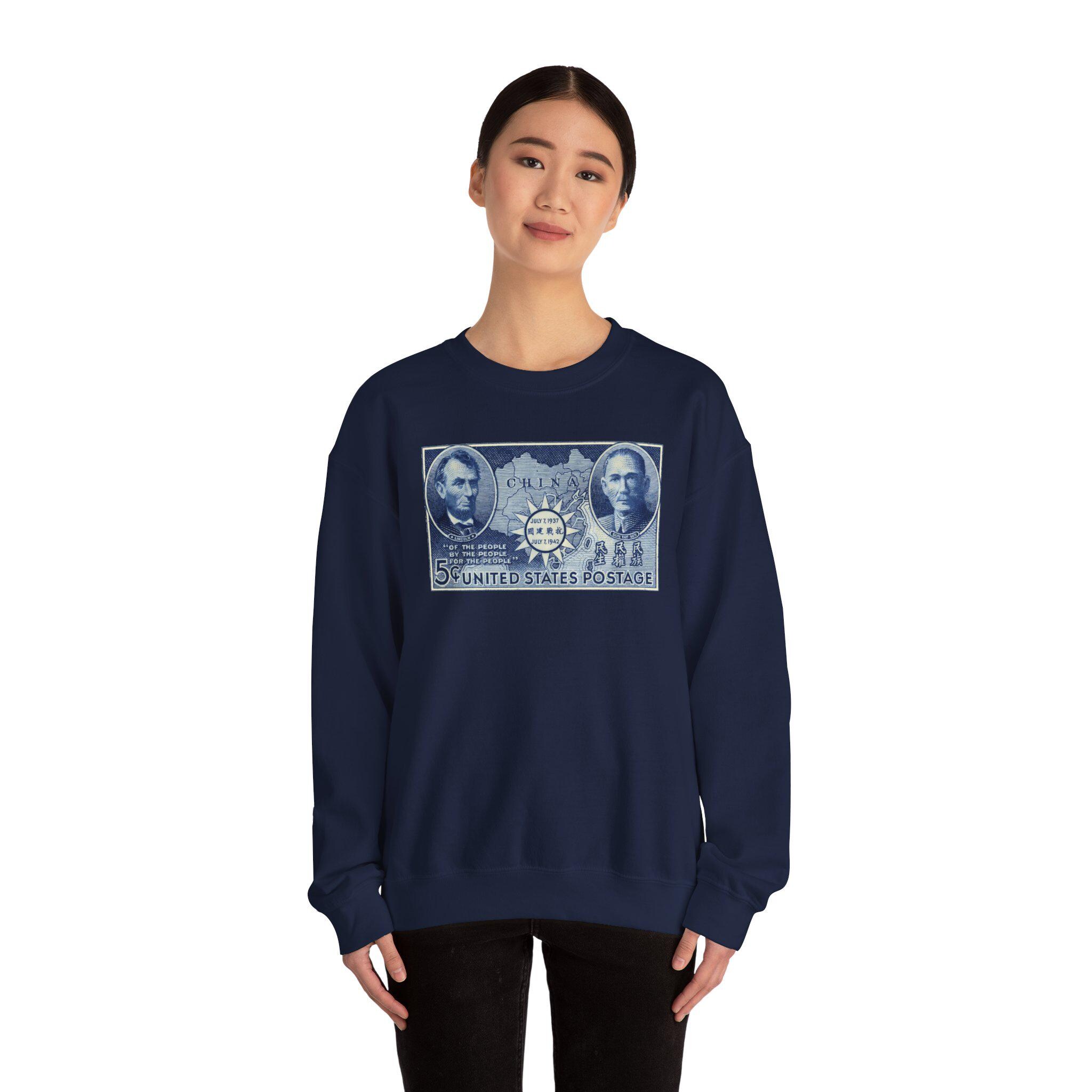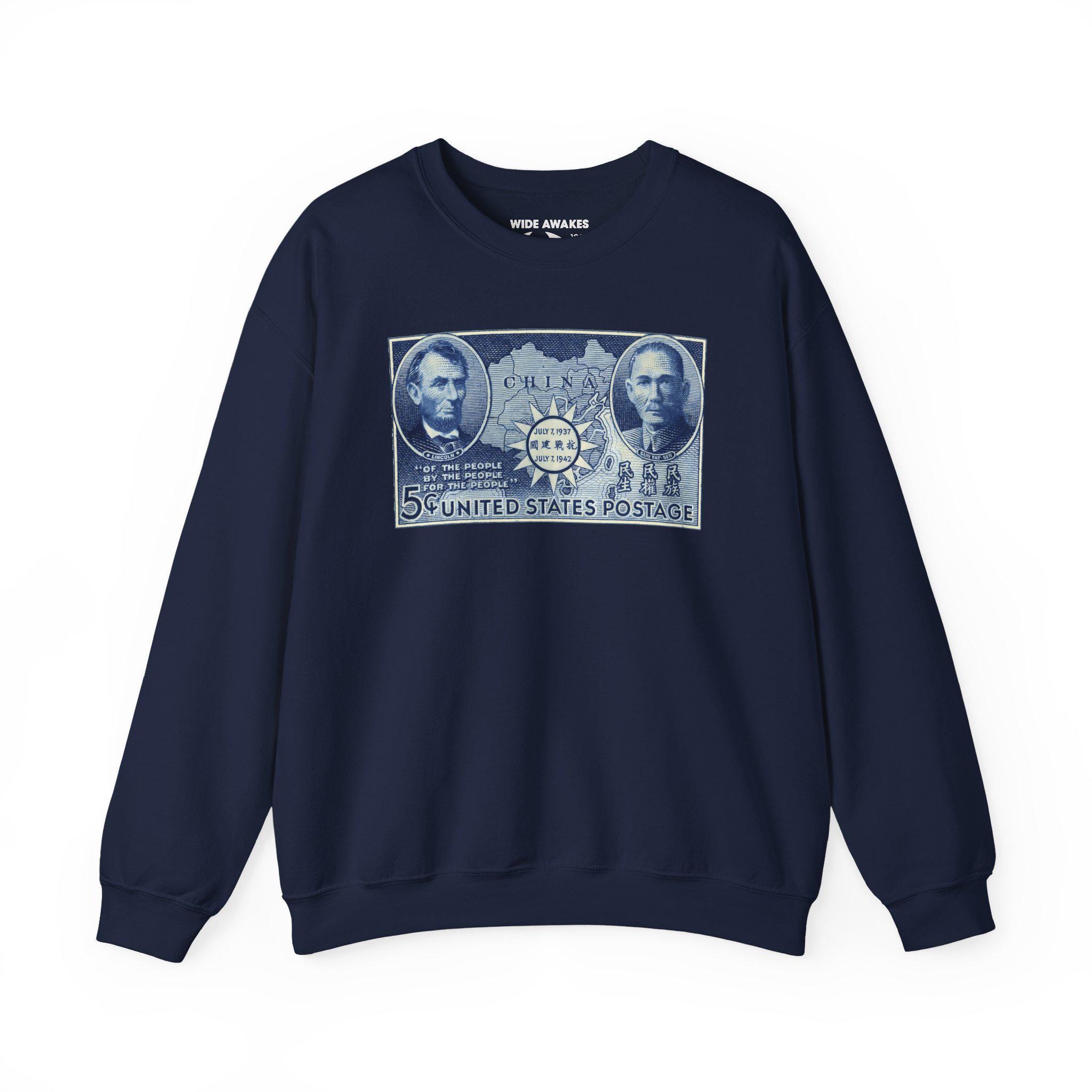 Stay warm this fall with a sweatshirt that showcases a beautiful example of 1940s design. This crewneck features a restored 1942 US postage stamp commemorating the Chinese resistance. The detailed blue engraving creates a sophisticated vintage look. The subject matter is profound: it parallels the ideals of Abraham Lincoln with those of Sun Yat-sen, suggesting that the fight against tyranny is a shared global heritage. It's a unique piece of history that connects the American Civil War, the Chinese Revolution, and World War II.