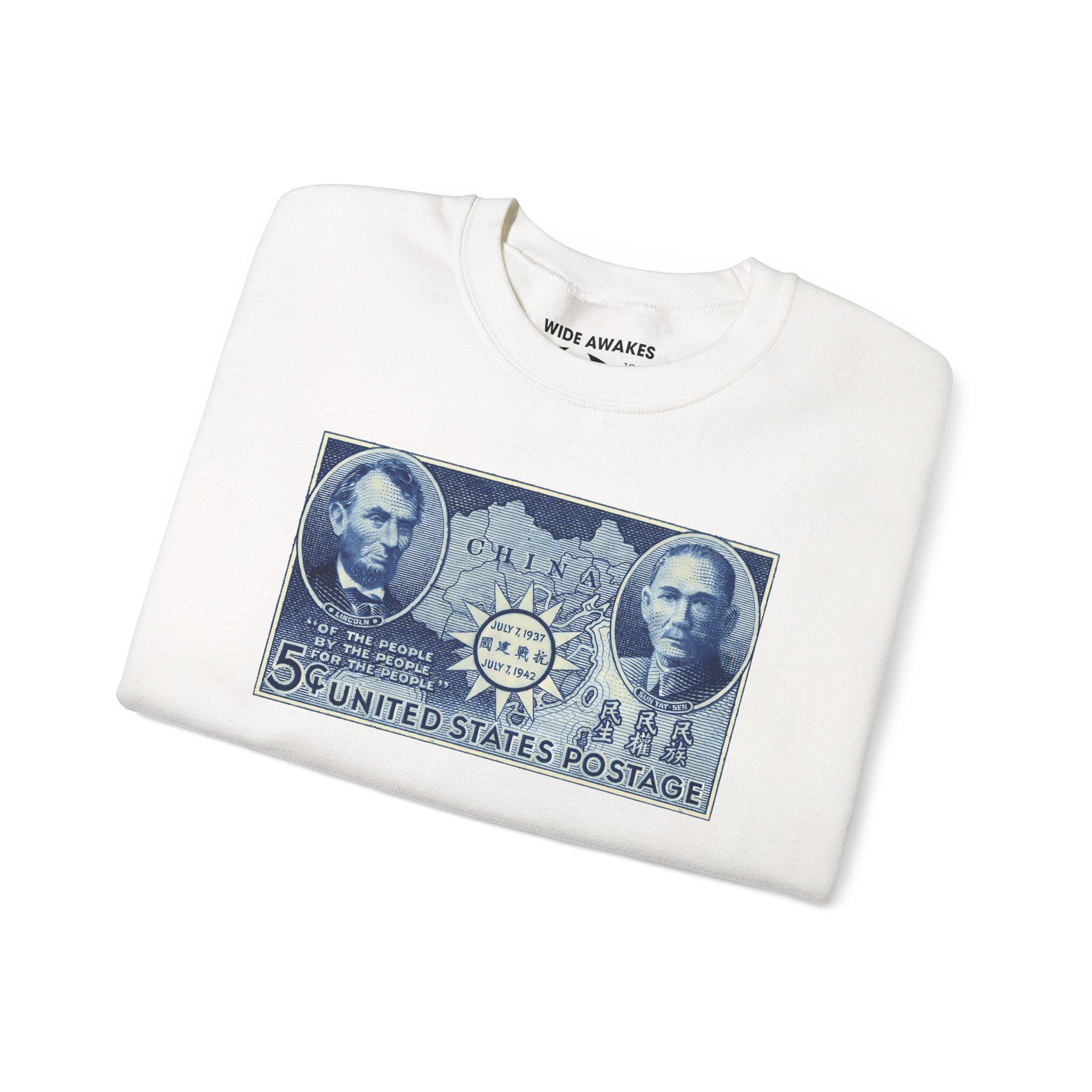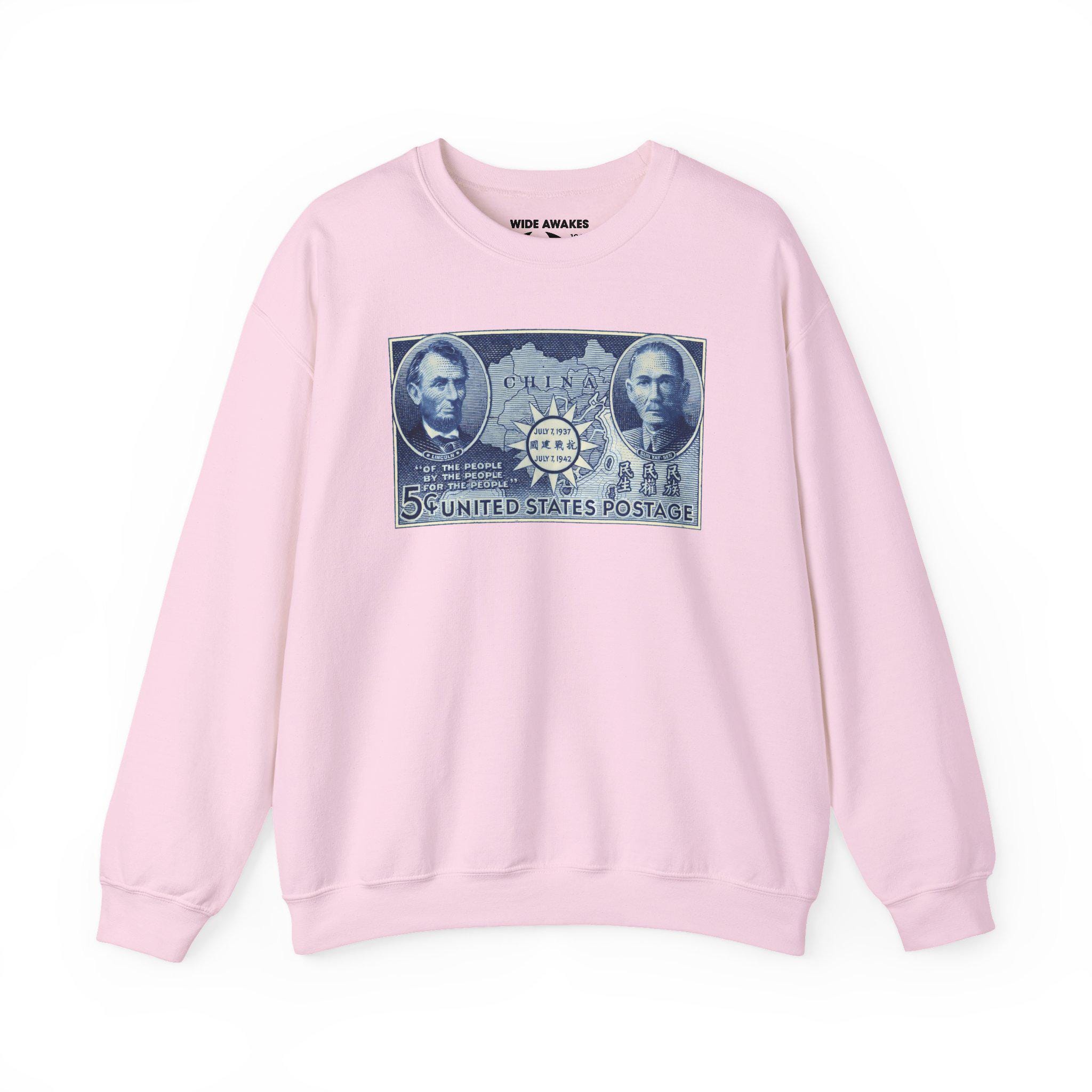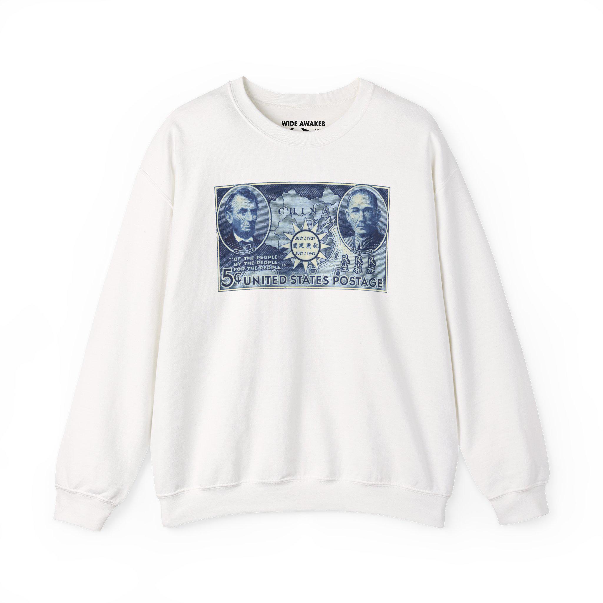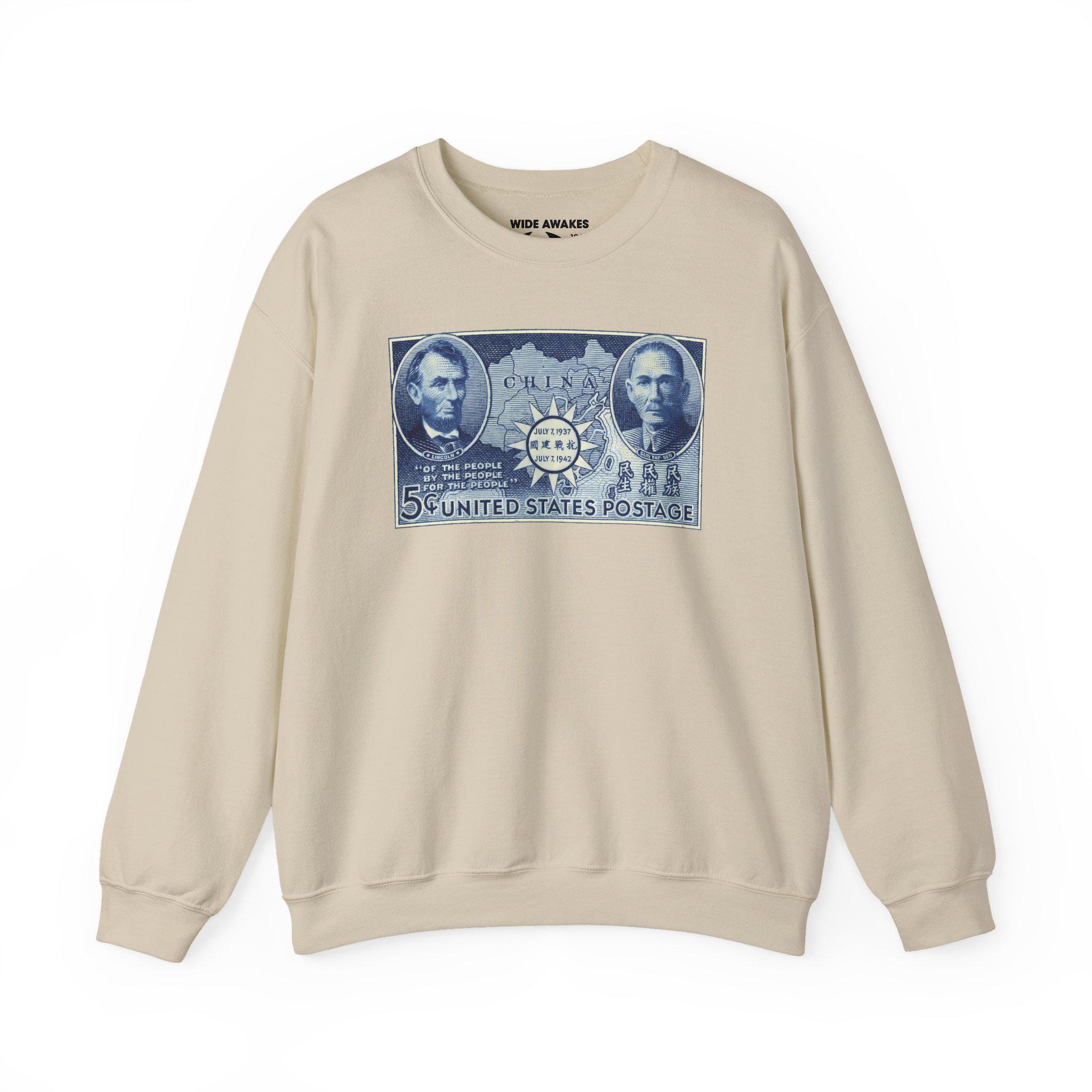 Stay warm this fall with a sweatshirt that showcases a beautiful example of 1940s design. This crewneck features a restored 1942 US postage stamp commemorating the Chinese resistance. The detailed blue engraving creates a sophisticated vintage look. The subject matter is profound: it parallels the ideals of Abraham Lincoln with those of Sun Yat-sen, suggesting that the fight against tyranny is a shared global heritage. It's a unique piece of history that connects the American Civil War, the Chinese Revolution, and World War II.