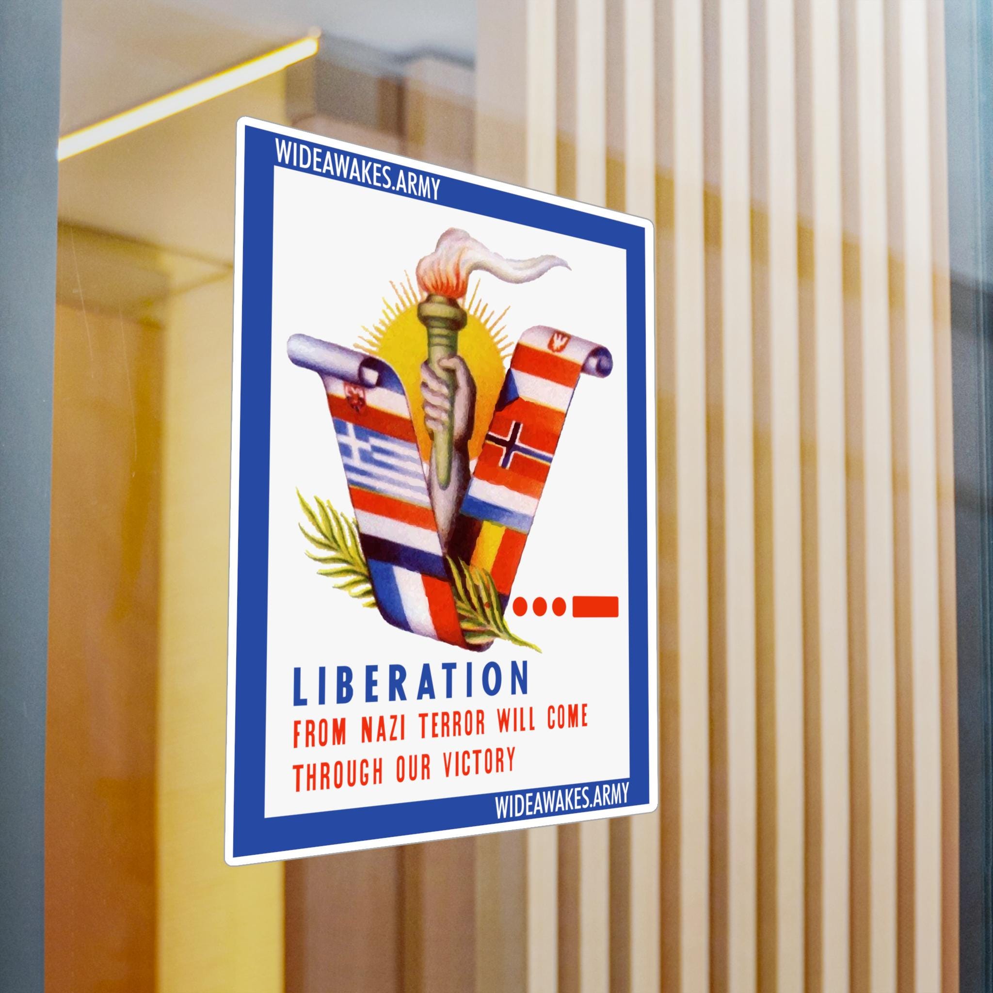 This durable vinyl decal features a digitally restored design from a rare World War II envelope stamp with a specific, powerful message. The artwork isn't just a collection of Allied flags; it is a tribute to the Occupied Nations of Europe. The flags of Yugoslavia, Greece, the Netherlands, France, Belgium, Luxembourg, Norway, Czechoslovakia, and Poland unfurl to form a three-dimensional "V" for Victory.