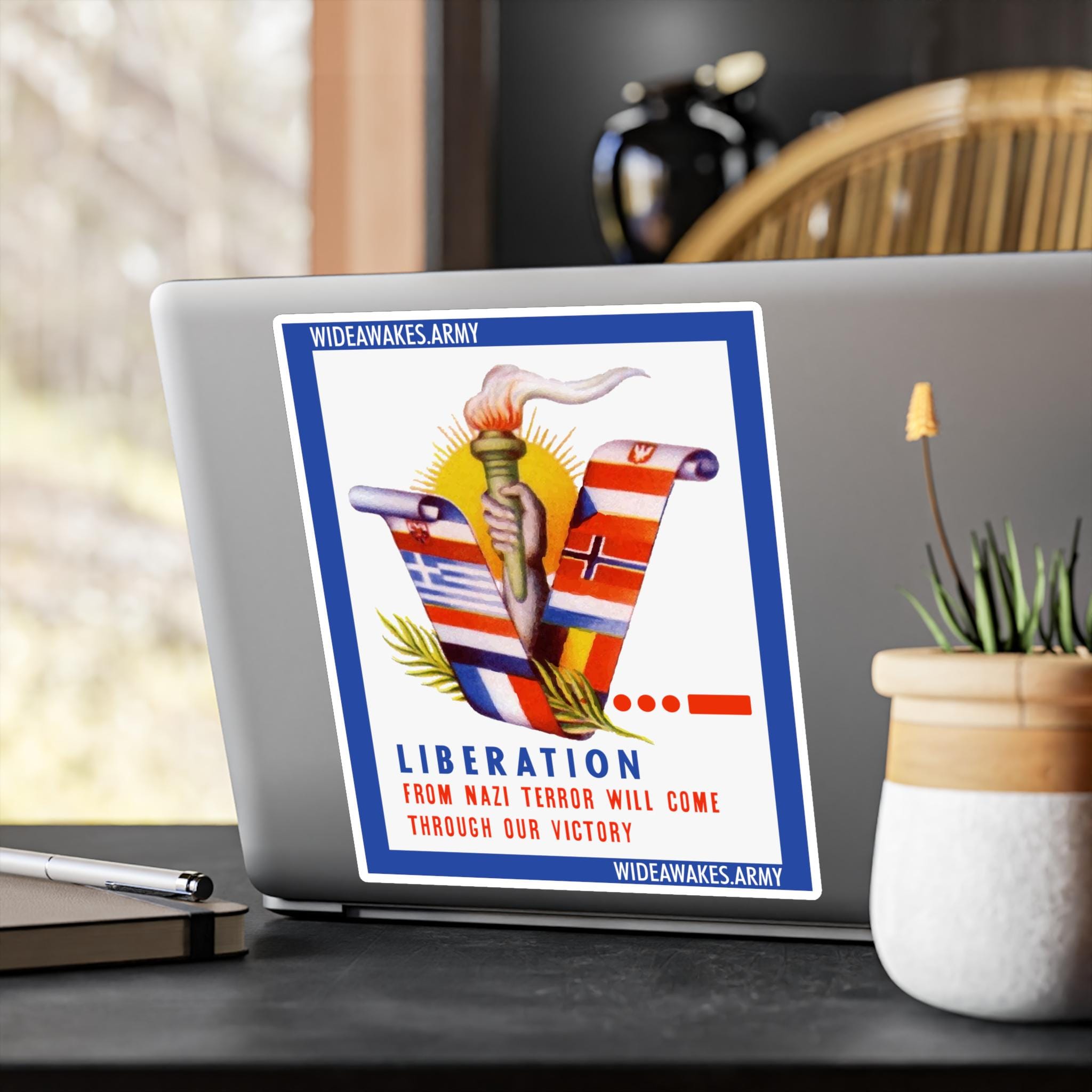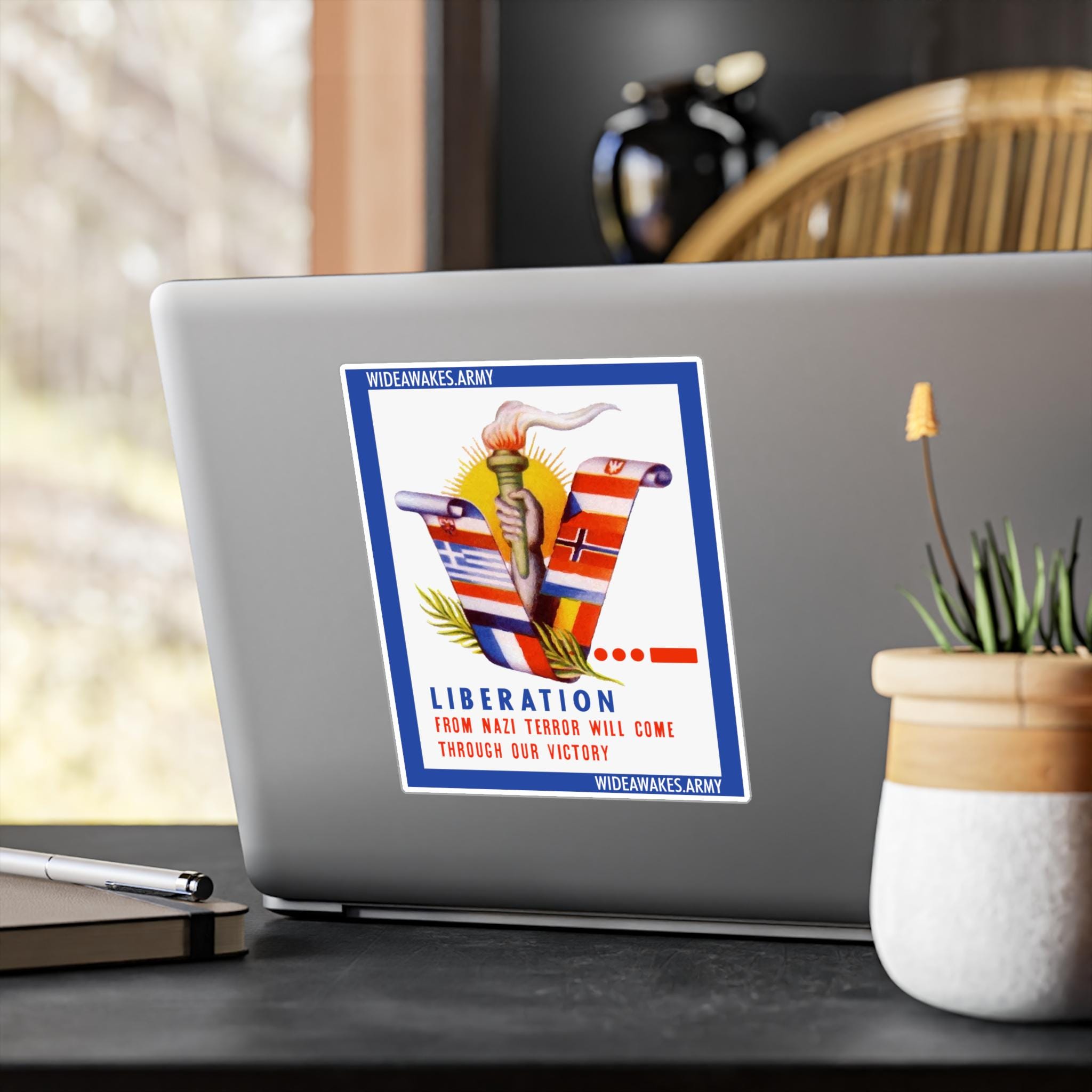 Rising from this coalition of the oppressed is a torch of liberty held against a bright sun, symbolizing the coming dawn. The text delivers the era's solemn vow: "LIBERATION FROM NAZI TYRANNY WILL COME THROUGH OUR VICTORY." It’s a historically significant statement of solidarity and hope, perfect for your car, laptop, or notebook.