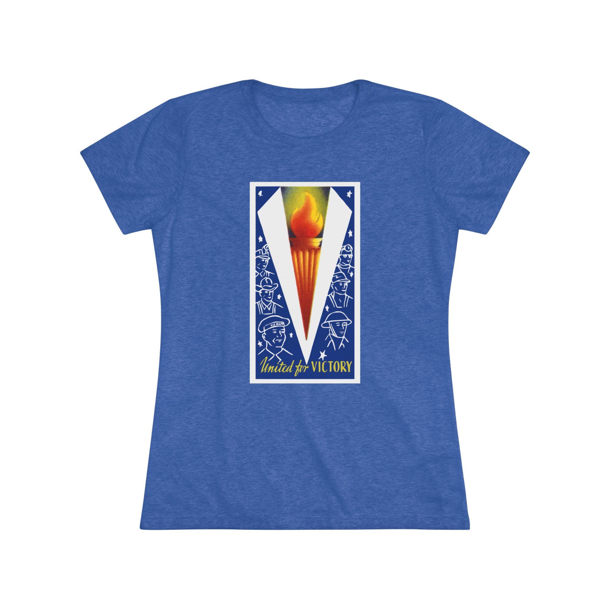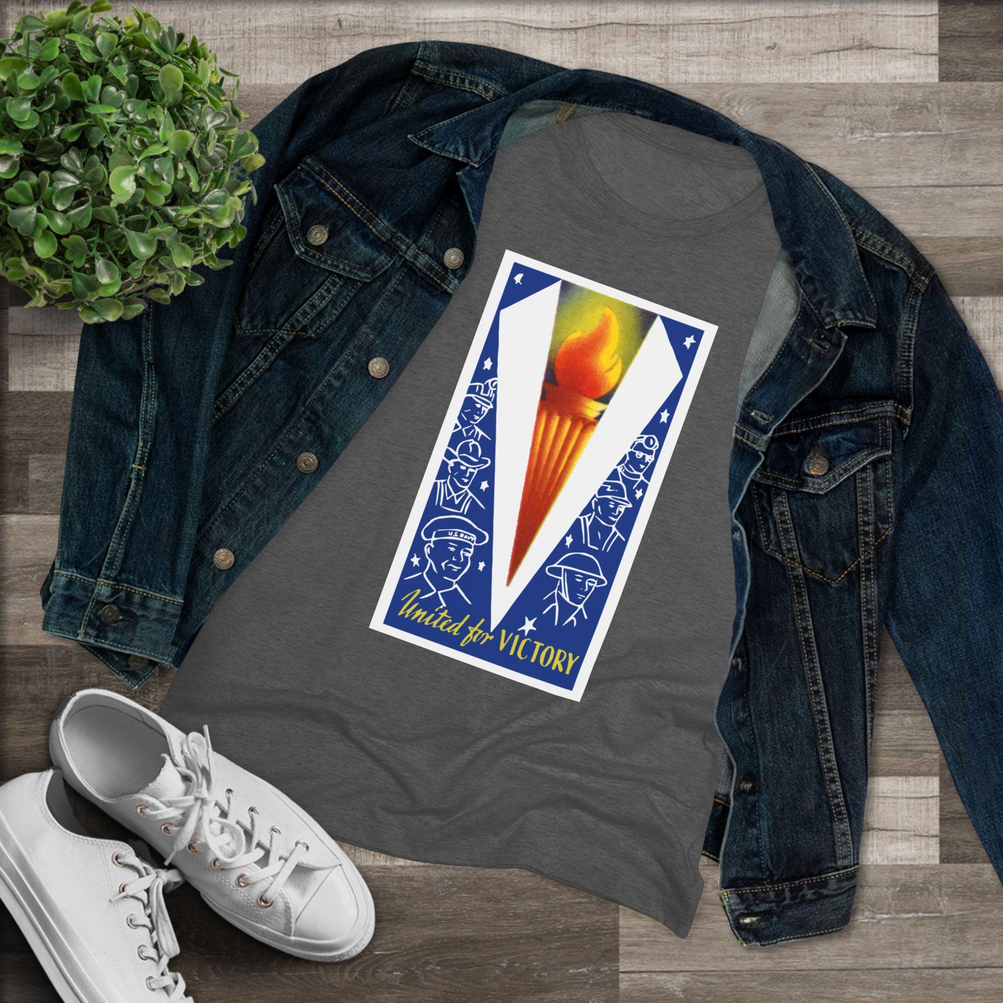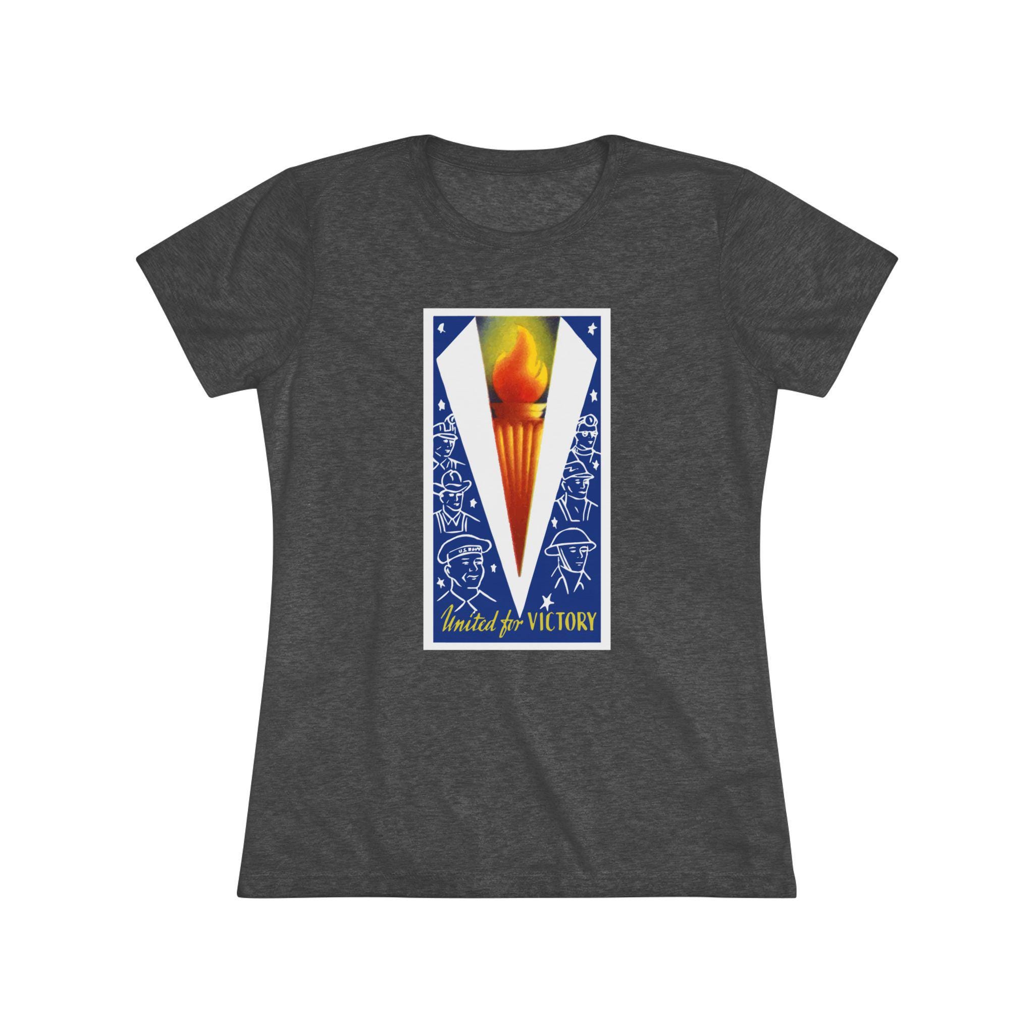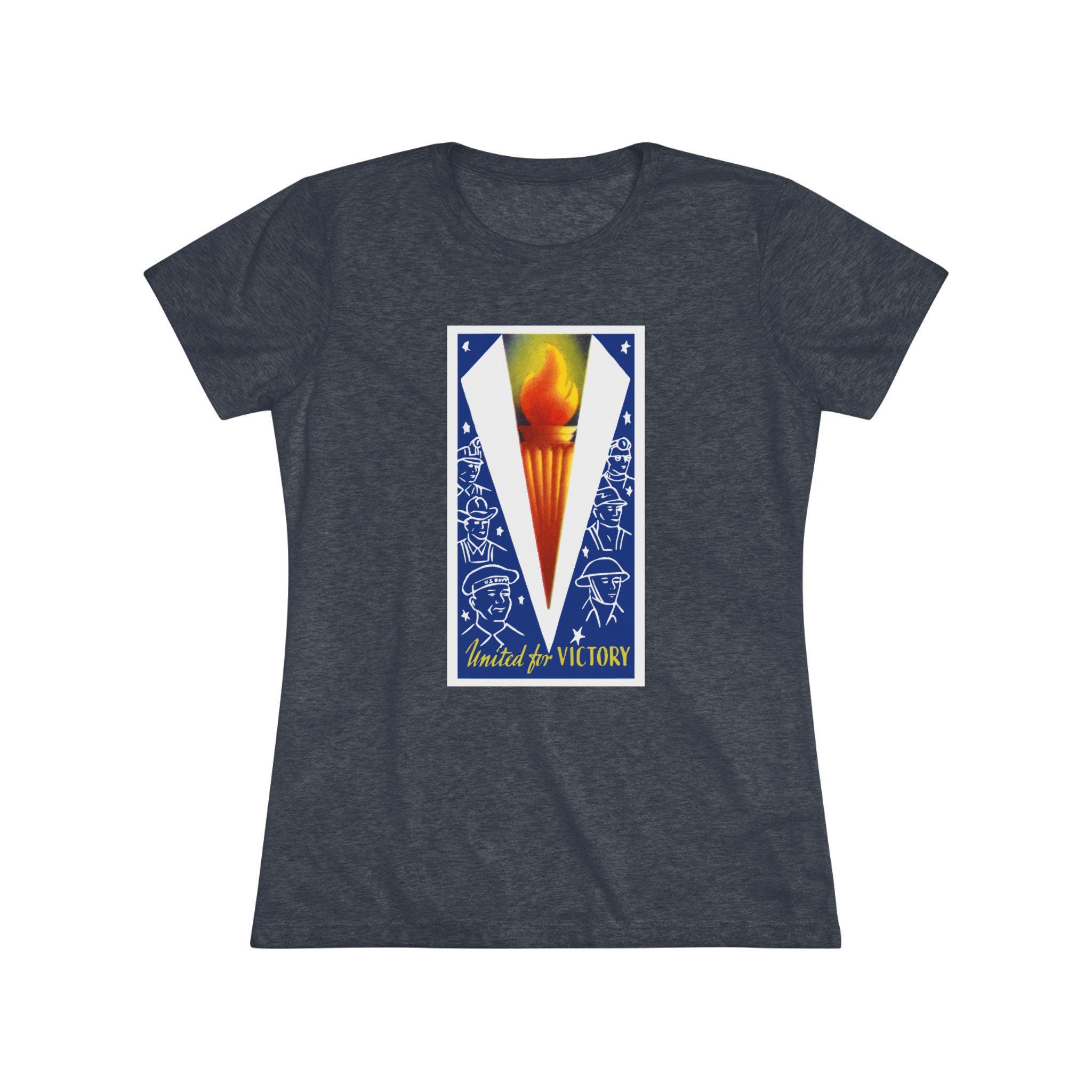 This women's t-shirt combines a powerful piece of World War II history with a comfortable and stylish fit. The restored design highlights the cooperation between the military and the civilian population, featuring line drawings of soldiers and citizens flanking a "V" for Victory. The slogan "United for VICTORY" reminds us of the power of a nation working together. This soft, contoured tee is a perfect way to wear a piece of history that honors the contributions of the entire Greatest Generation.