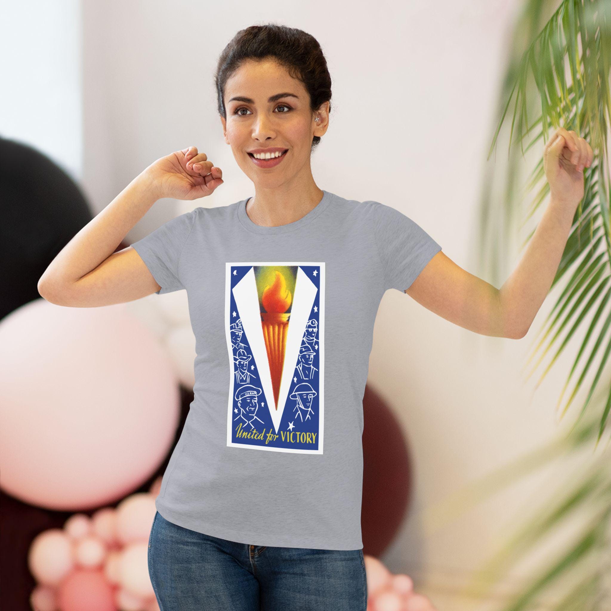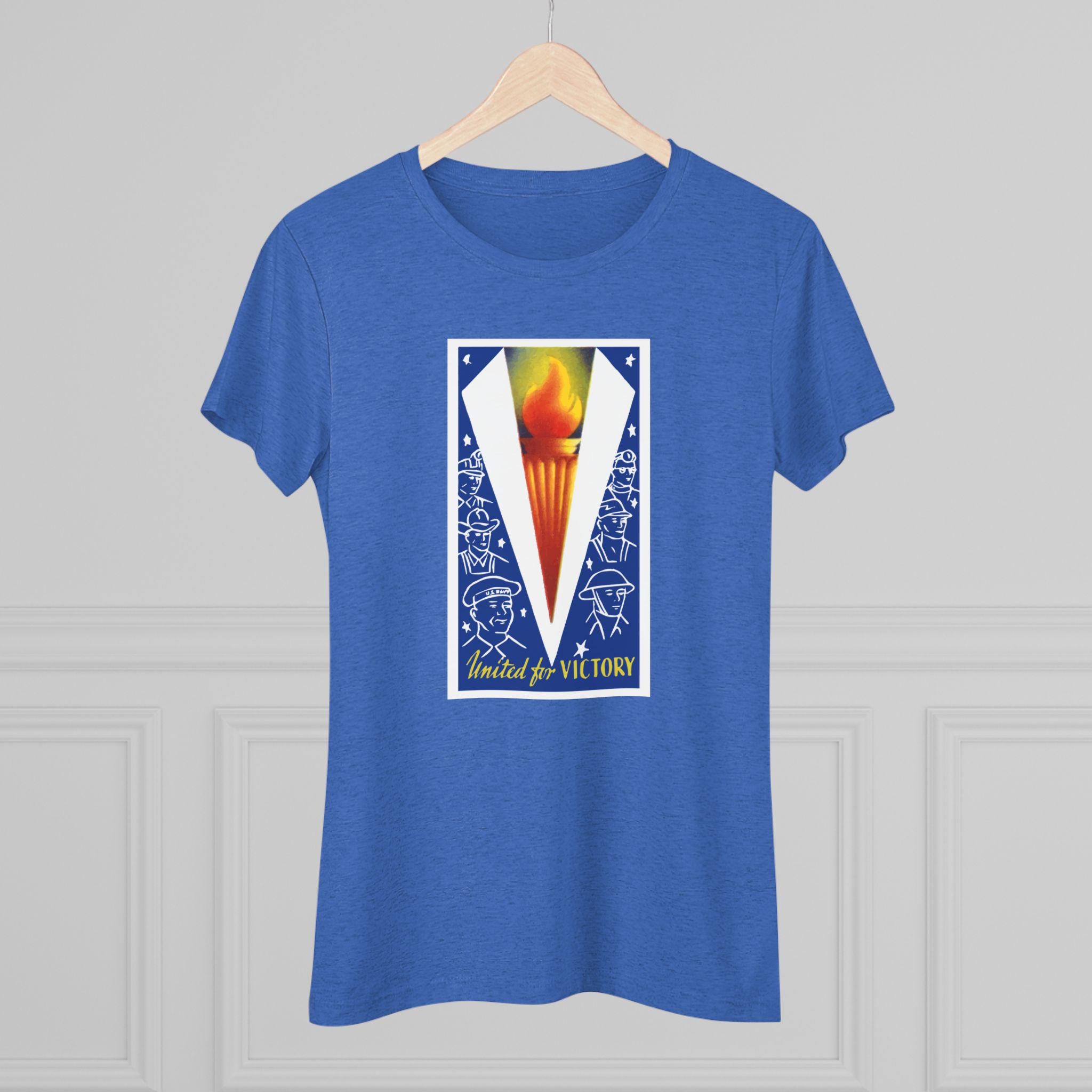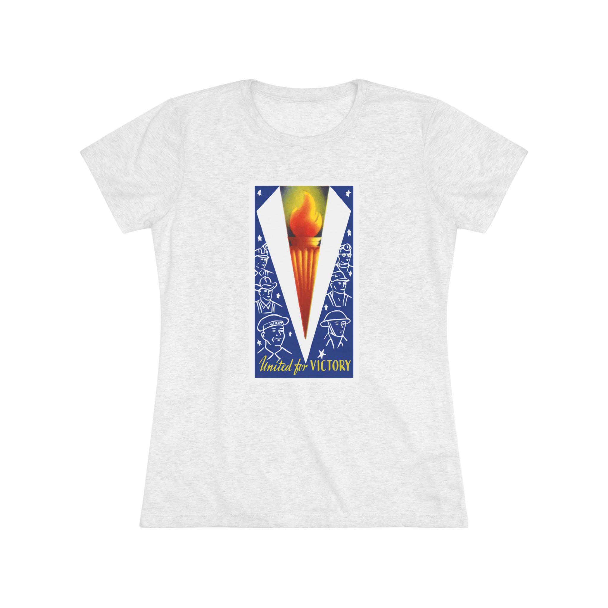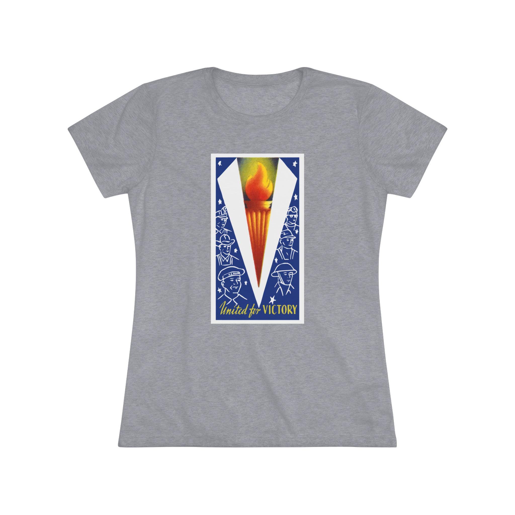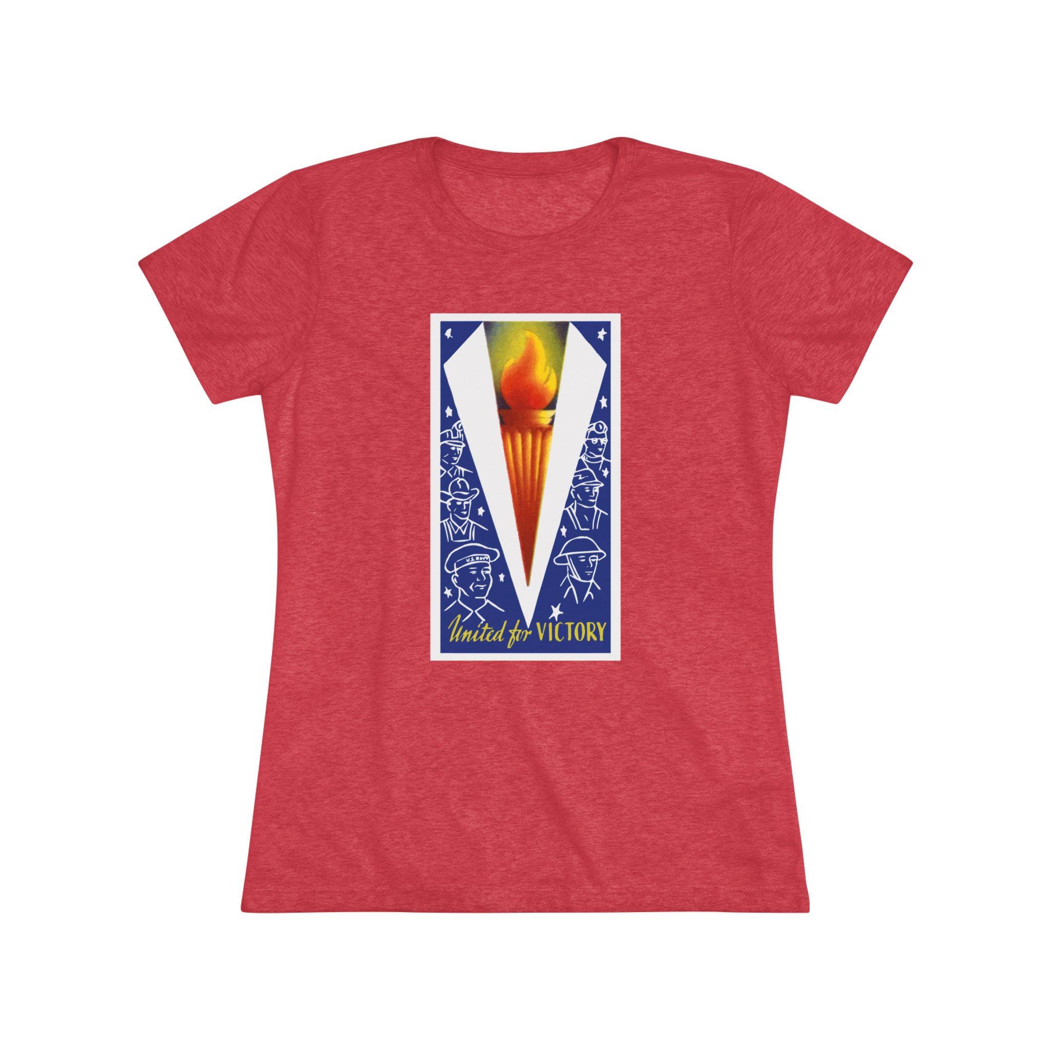 This women's t-shirt combines a powerful piece of World War II history with a comfortable and stylish fit. The restored design highlights the cooperation between the military and the civilian population, featuring line drawings of soldiers and citizens flanking a "V" for Victory. The slogan "United for VICTORY" reminds us of the power of a nation working together. This soft, contoured tee is a perfect way to wear a piece of history that honors the contributions of the entire Greatest Generation.