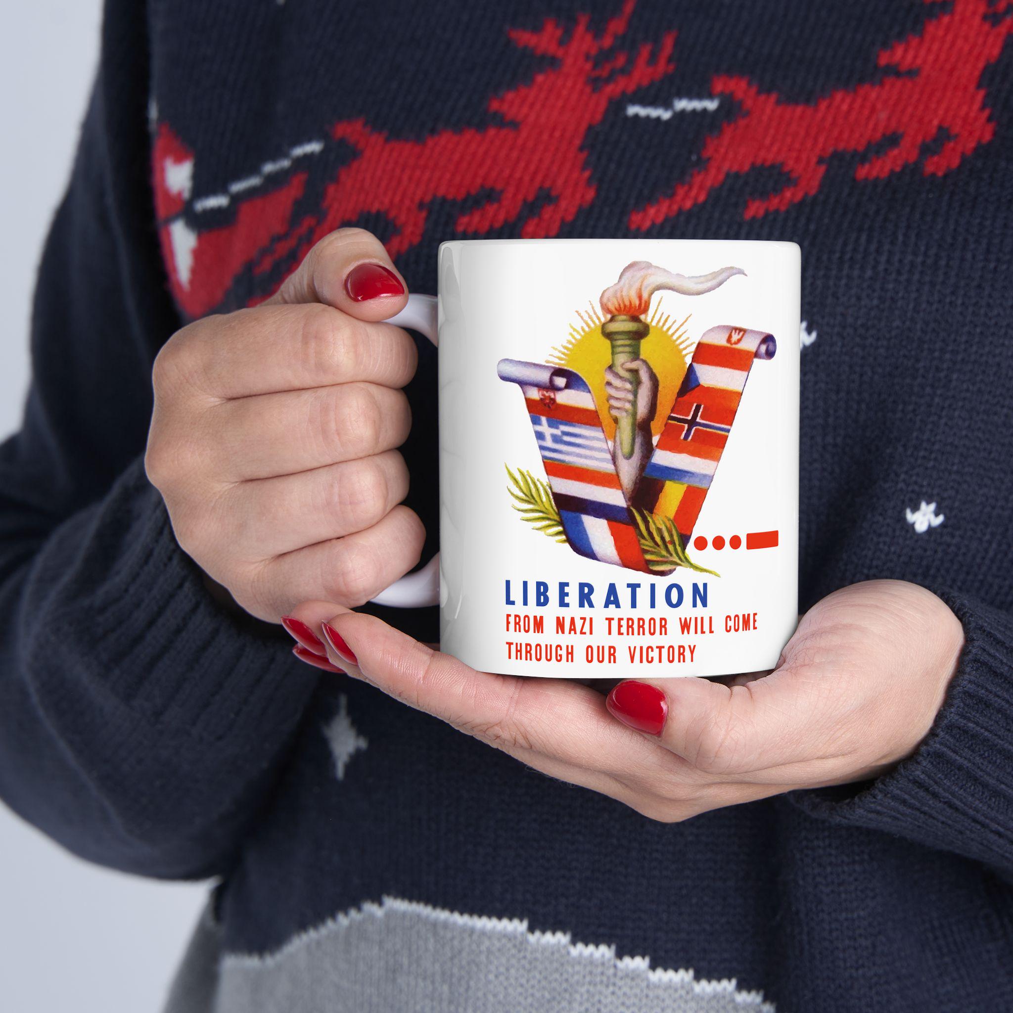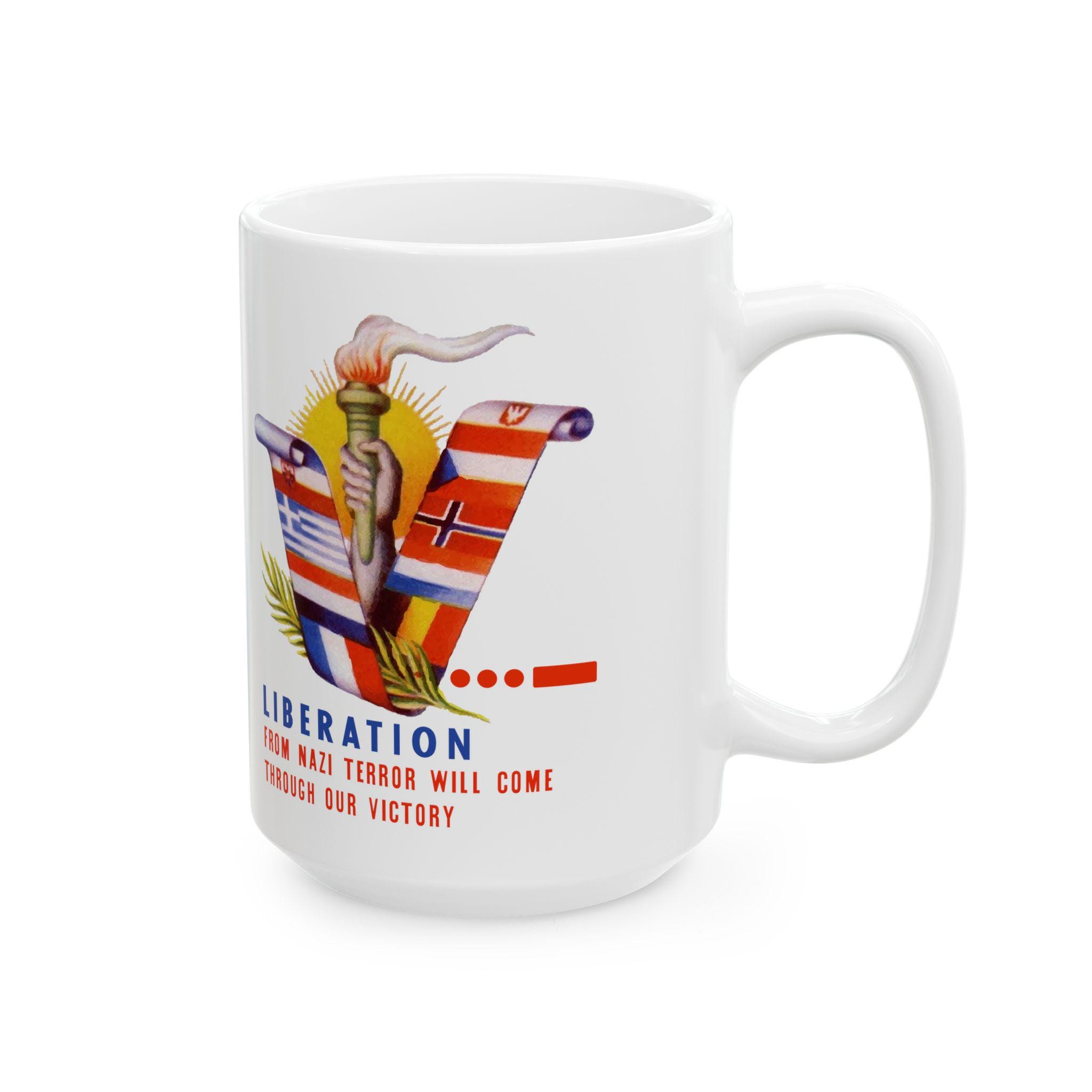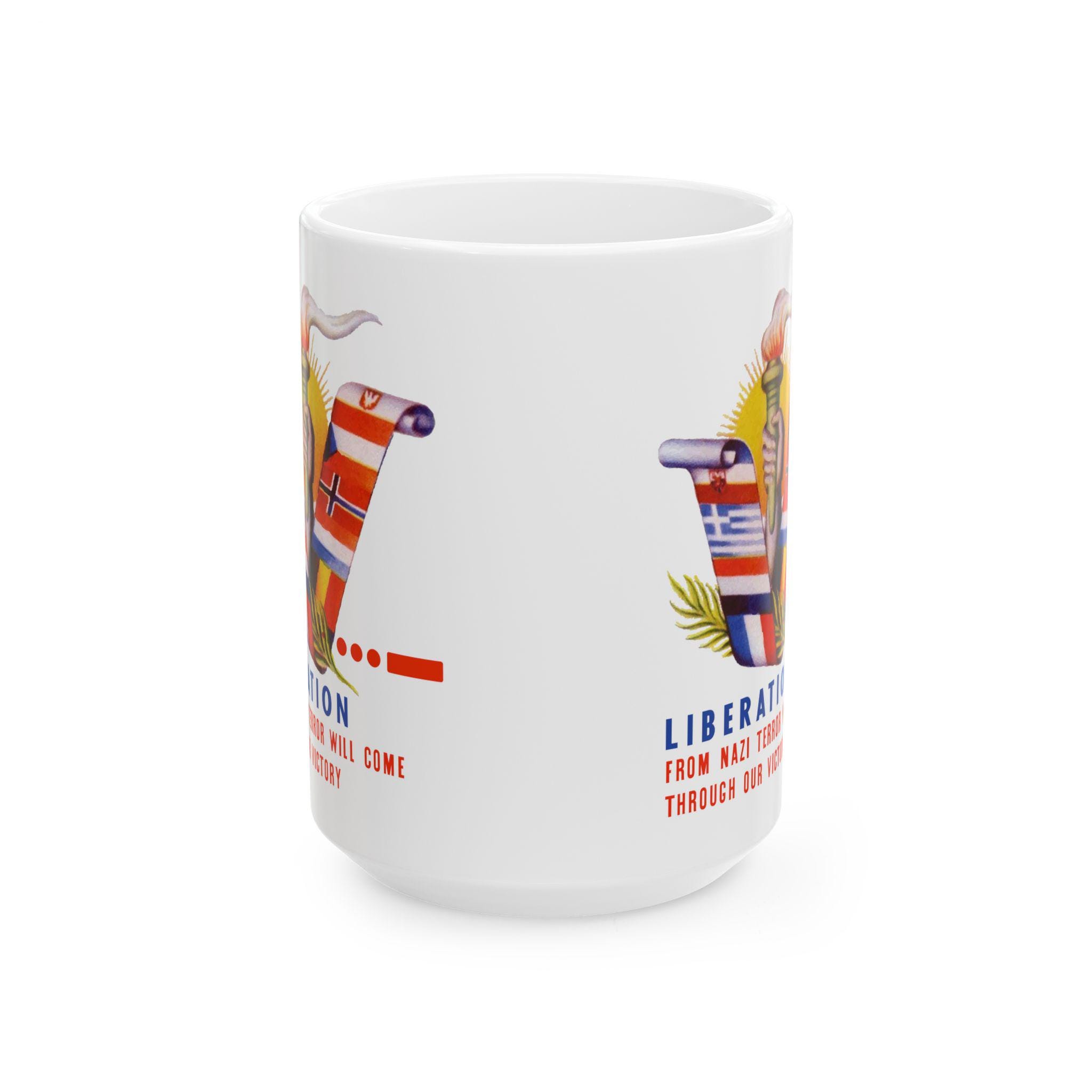 This ceramic mug features a vibrant, digitally restored design from a WWII-era envelope stamp. The artwork wraps around the mug, showcasing a "V" formed by the flags of the Occupied Nations (including Czechoslovakia, Yugoslavia, and the Netherlands), a lit torch, and a bright sun. It serves as a daily reminder of the resolve required to defeat fascism, bearing the motto: "LIBERATION FROM NAZI TYRANNY WILL COME THROUGH OUR VICTORY." Available in 11oz and 15oz sizes, this is a perfect gift for historians or anyone who honors the struggle for a free world.