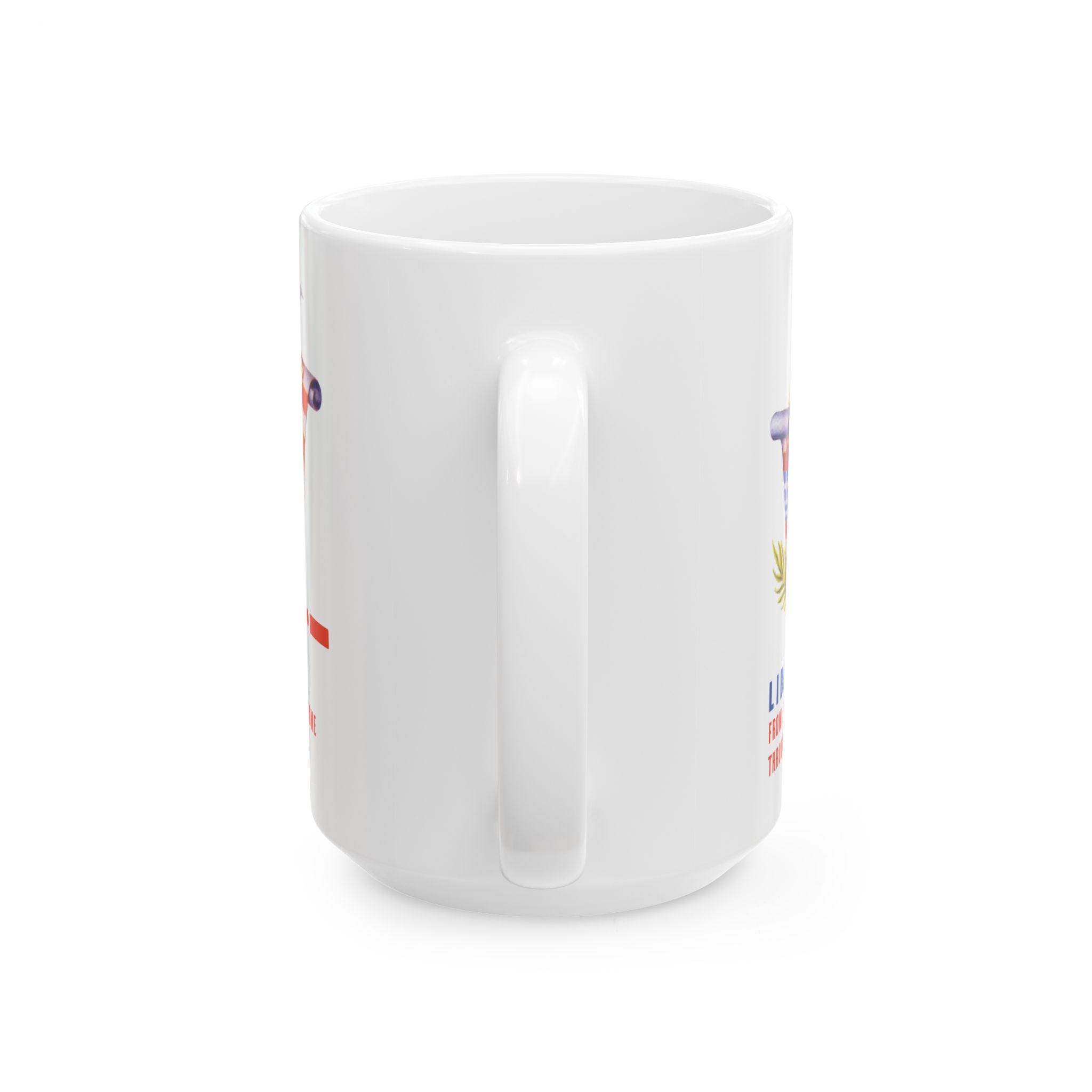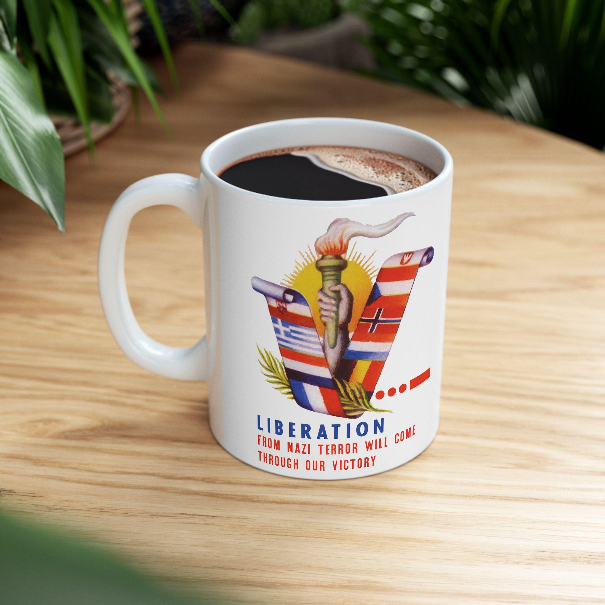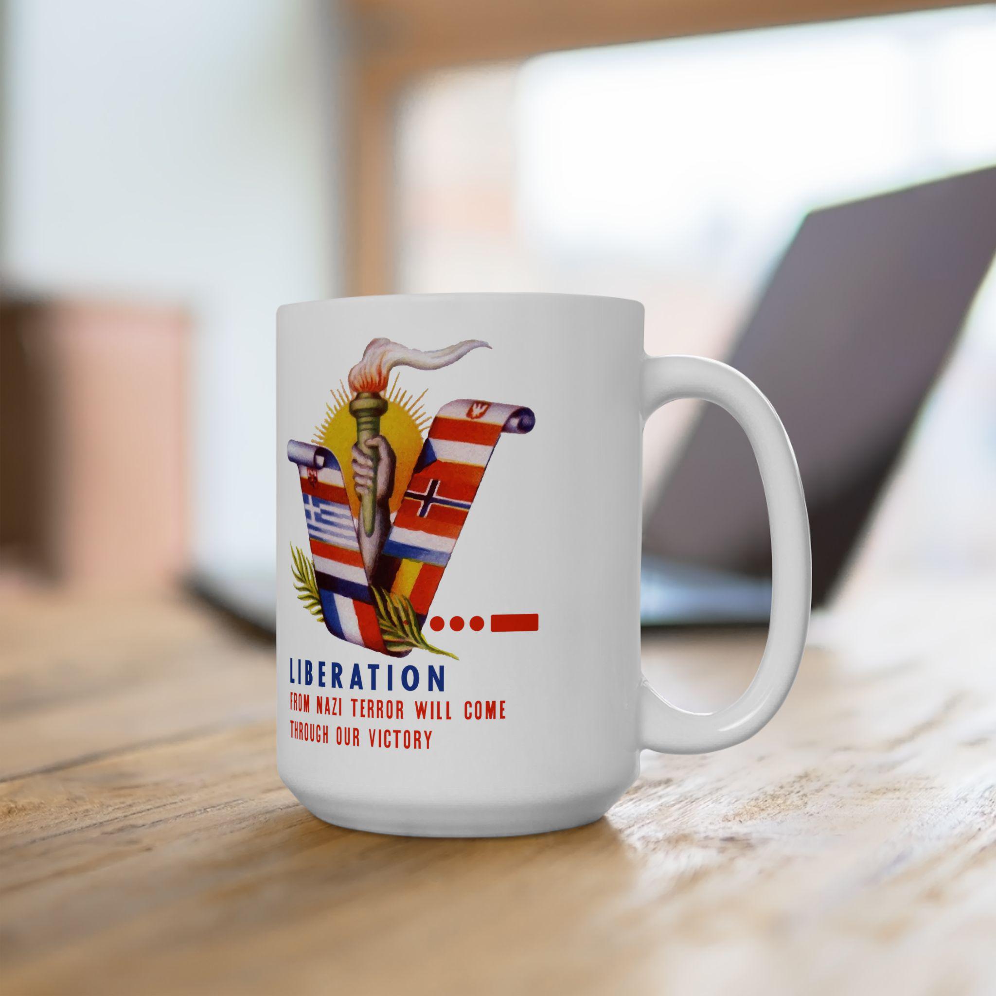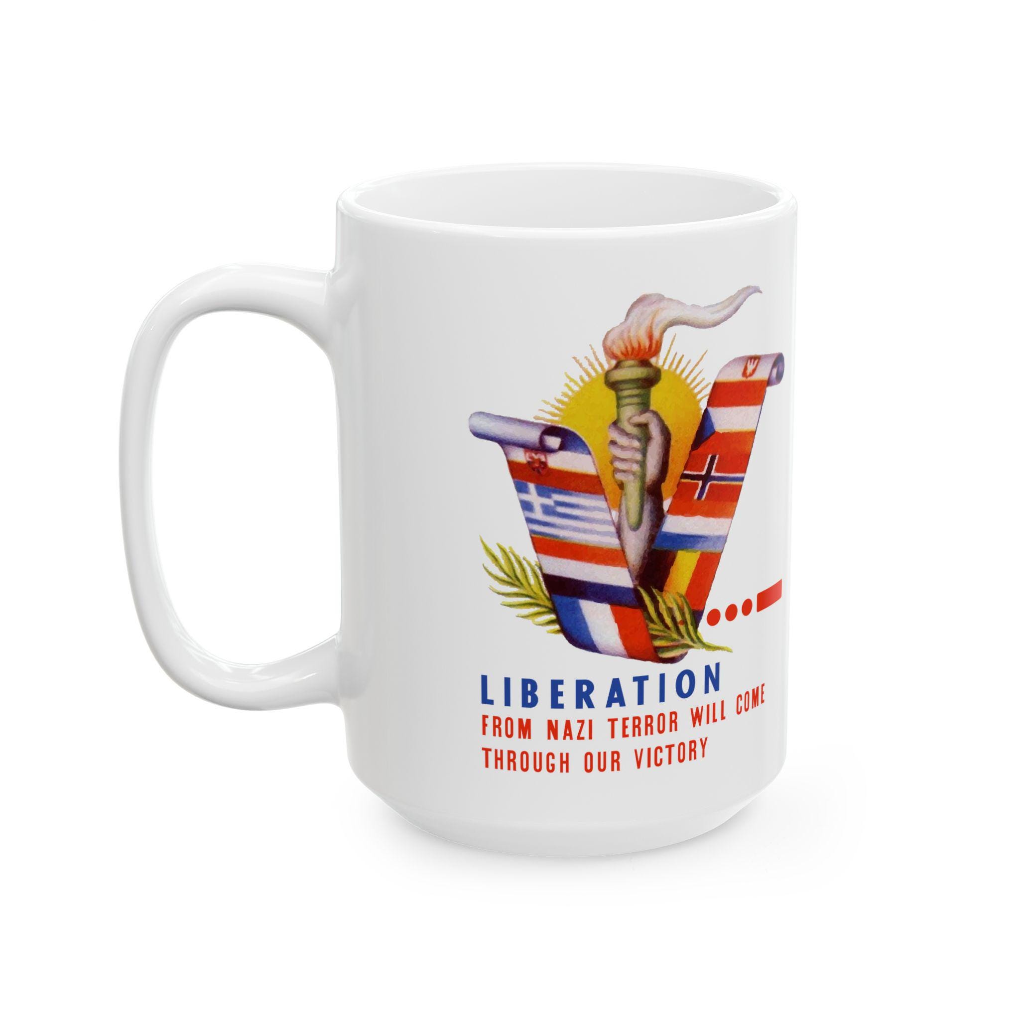 This ceramic mug features a vibrant, digitally restored design from a WWII-era envelope stamp. The artwork wraps around the mug, showcasing a "V" formed by the flags of the Occupied Nations (including Czechoslovakia, Yugoslavia, and the Netherlands), a lit torch, and a bright sun. It serves as a daily reminder of the resolve required to defeat fascism, bearing the motto: "LIBERATION FROM NAZI TYRANNY WILL COME THROUGH OUR VICTORY." Available in 11oz and 15oz sizes, this is a perfect gift for historians or anyone who honors the struggle for a free world.