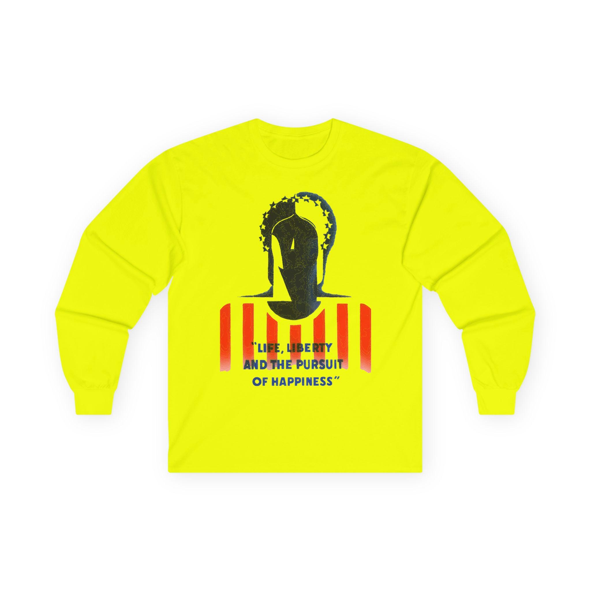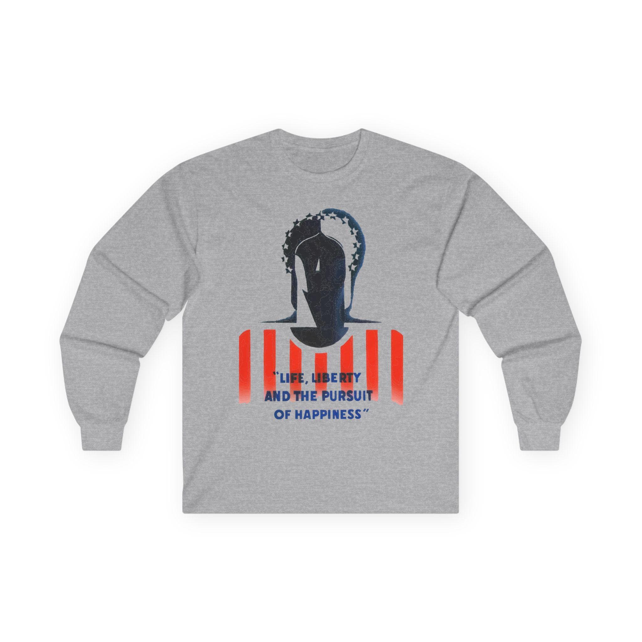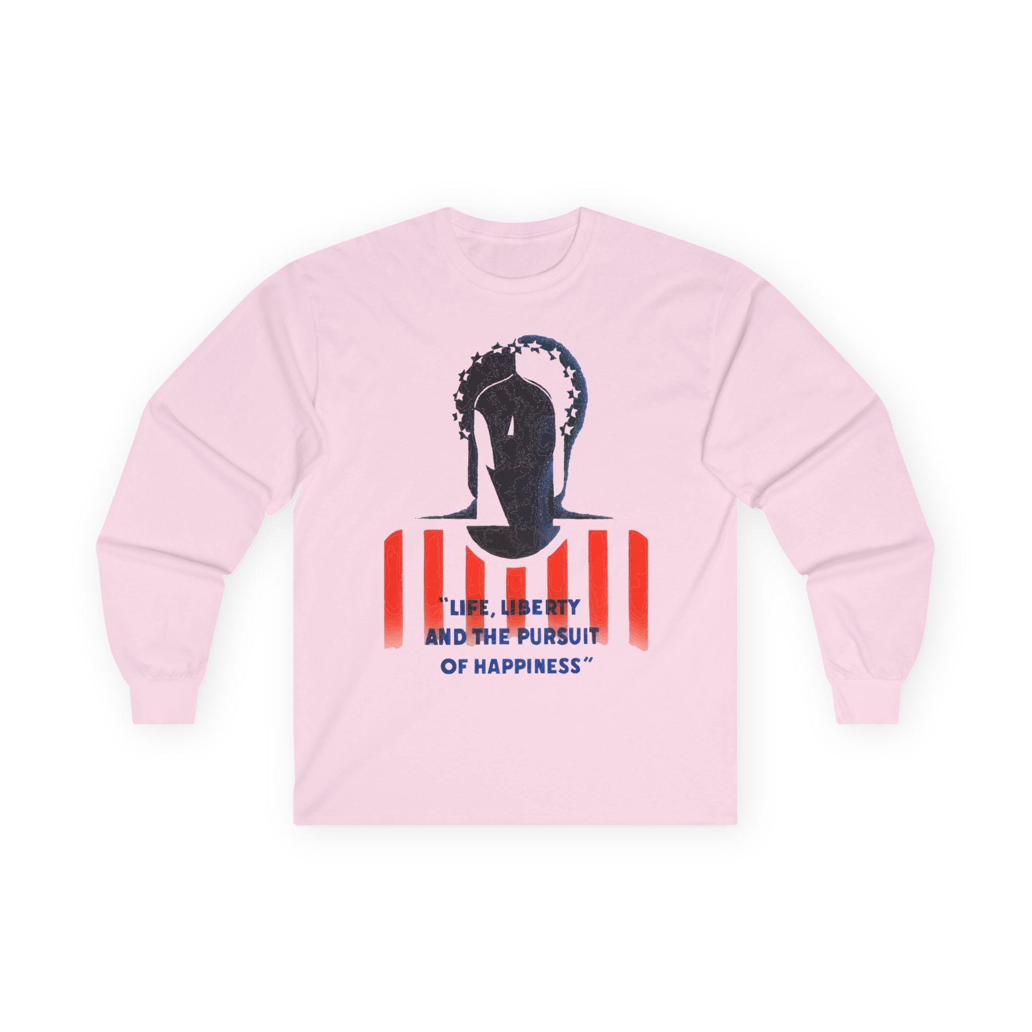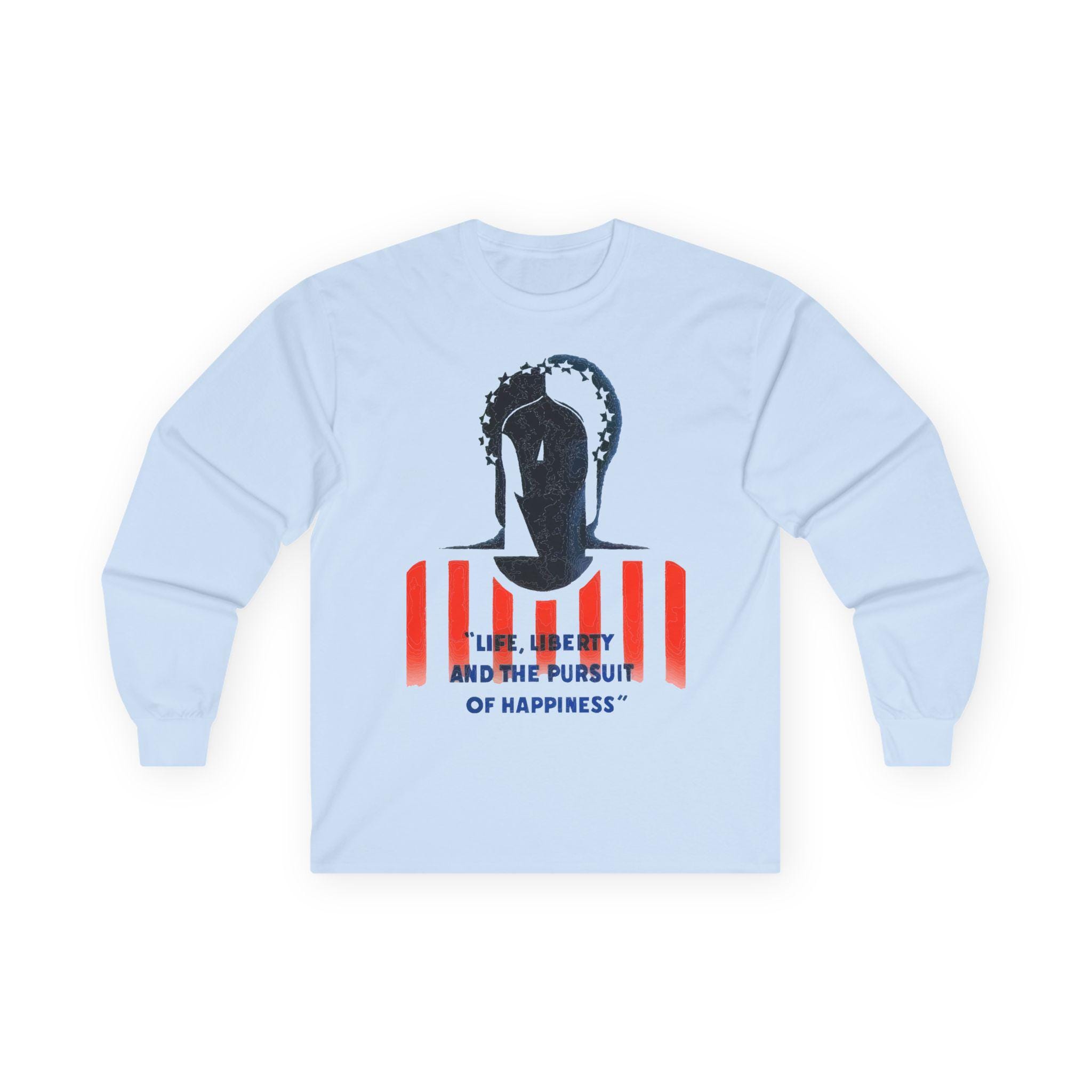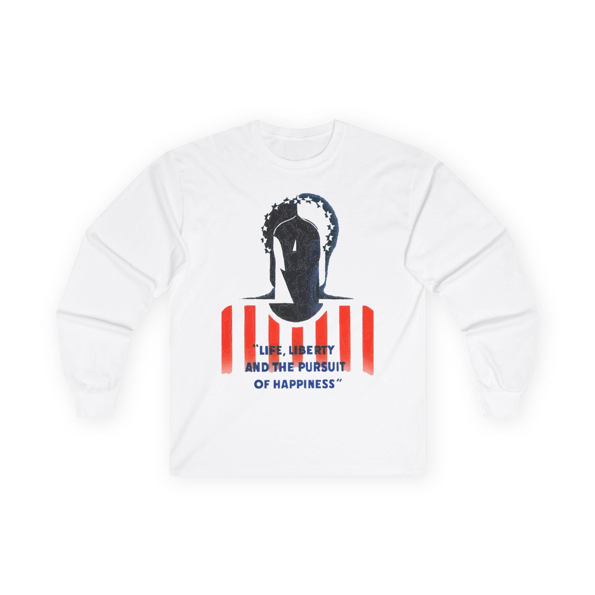 The stark black-and-white composition of her face, set against the red and white stripes and the bold text "Life, Liberty, and the Pursuit of Happiness," creates a visually arresting image. It’s a stylish and intelligent piece of wearable history, perfect for layering in cooler weather.