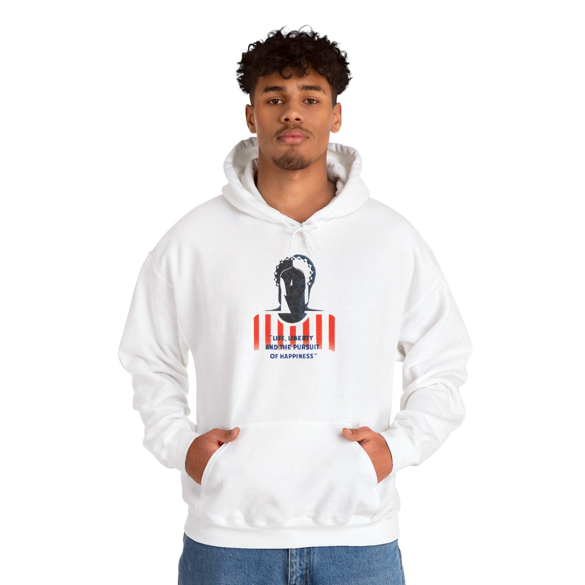 Accompanied by the timeless creed "Life, Liberty, and the Pursuit of Happiness," this hoodie blends classic patriotism with bold artistic vision. With a soft fleece interior and a spacious front pocket, it’s a perfect way to wear a piece of unique design history.