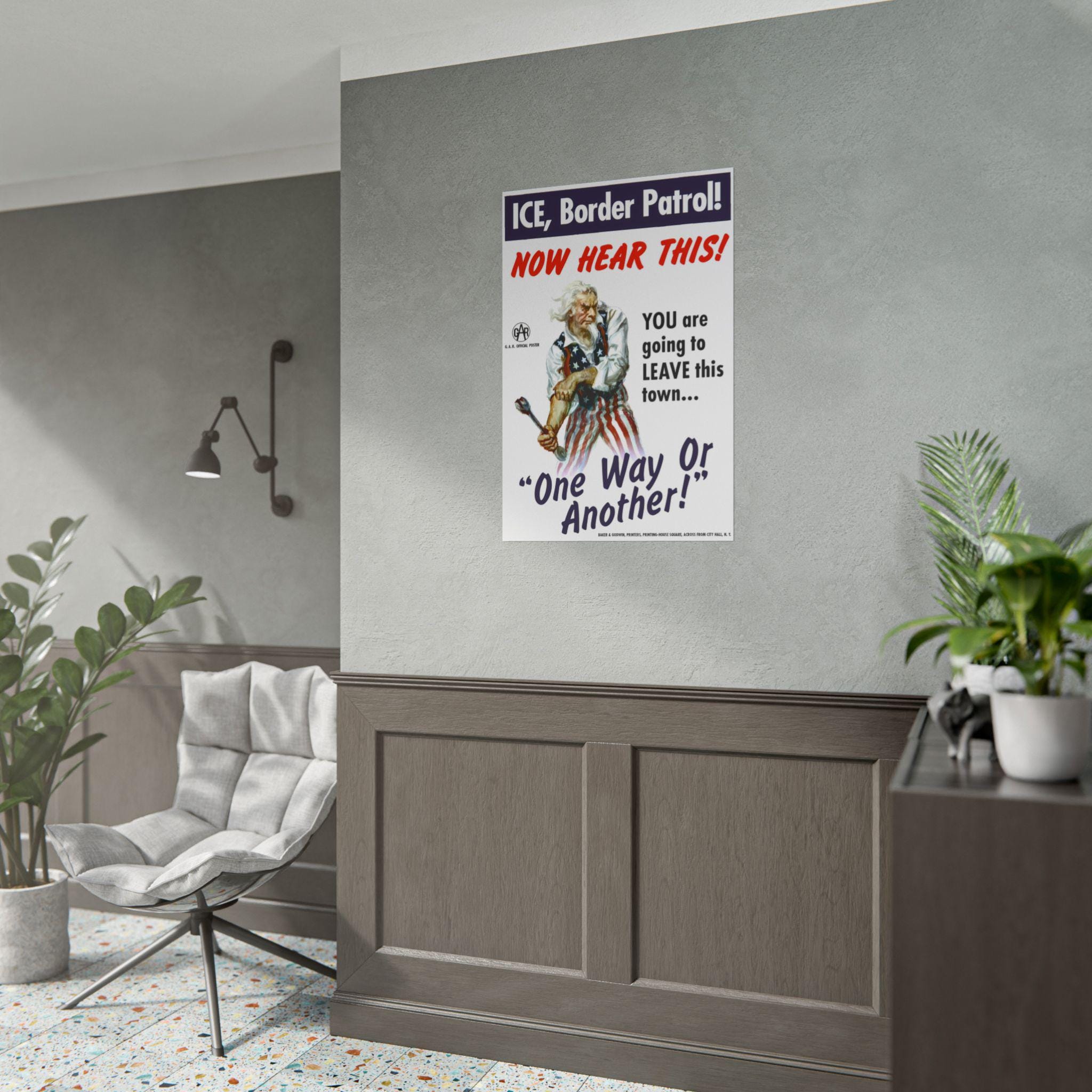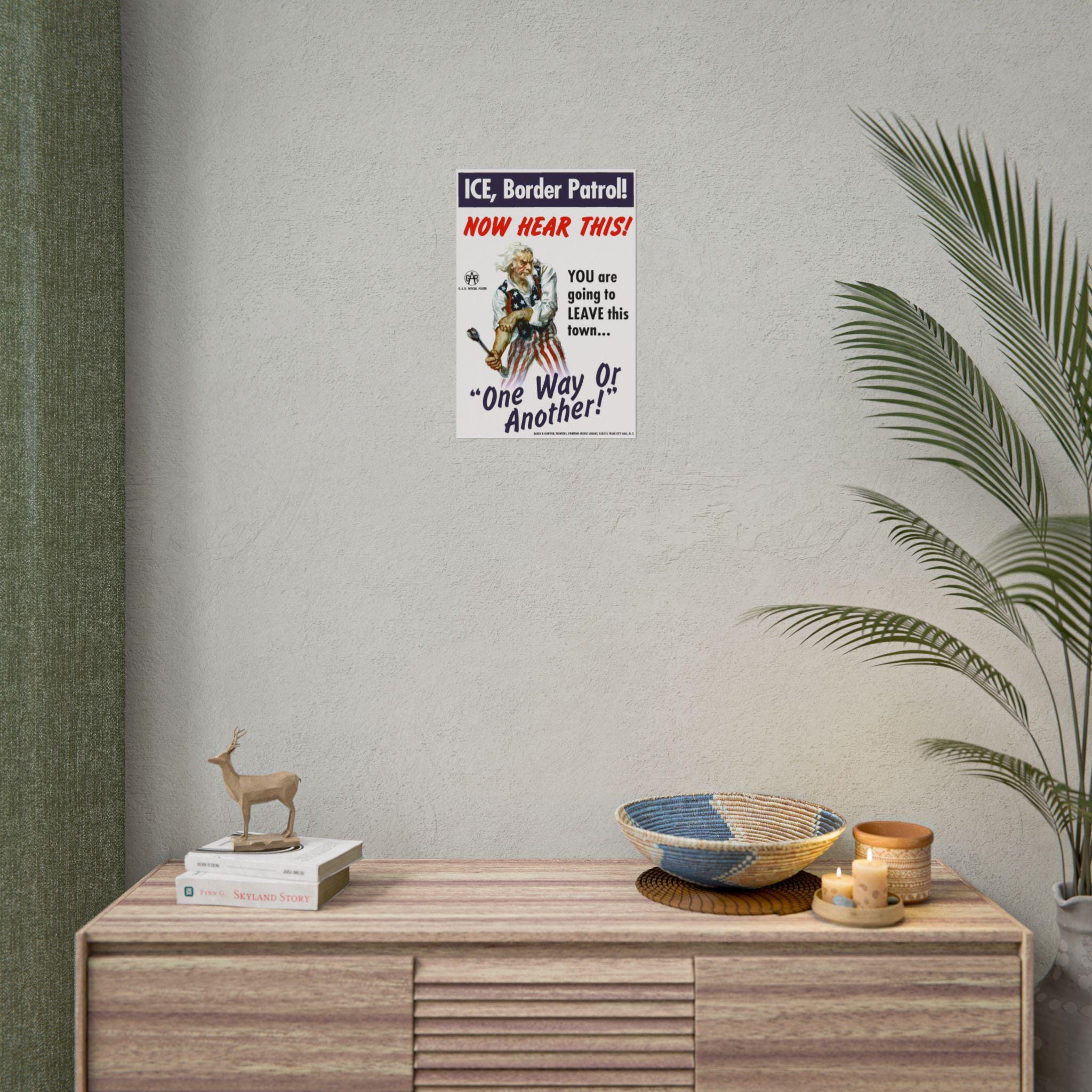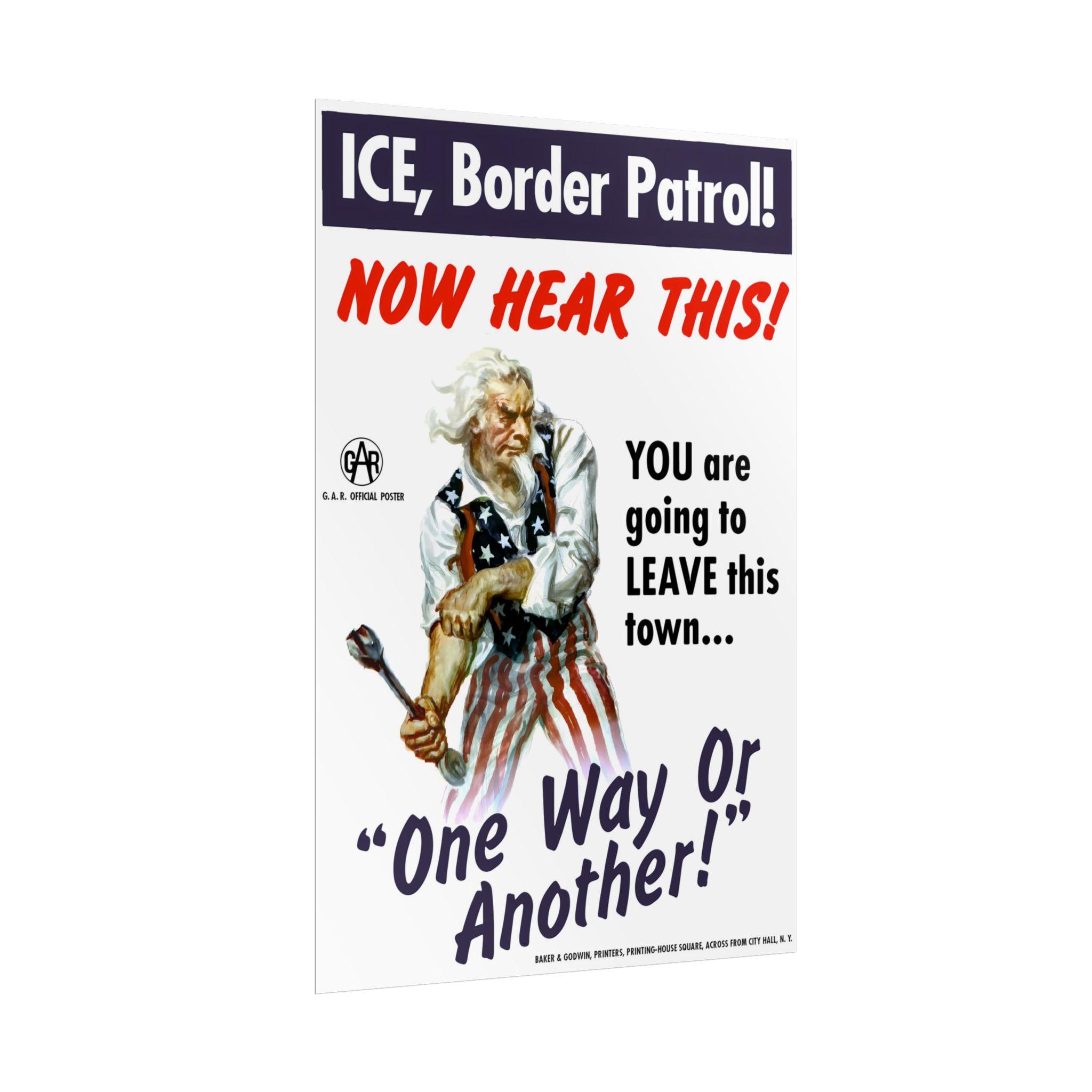 The Design: The iconic illustration of Uncle Sam holding a wrench and rolling up his sleeves remains, but his target has changed. The text box at the top calls out "ICE, Border Patrol!" followed by a red, hand-painted warning: "NOW HEAR THIS!" The central message is a promise of community defense: "YOU are going to LEAVE this town... One Way Or Another!"